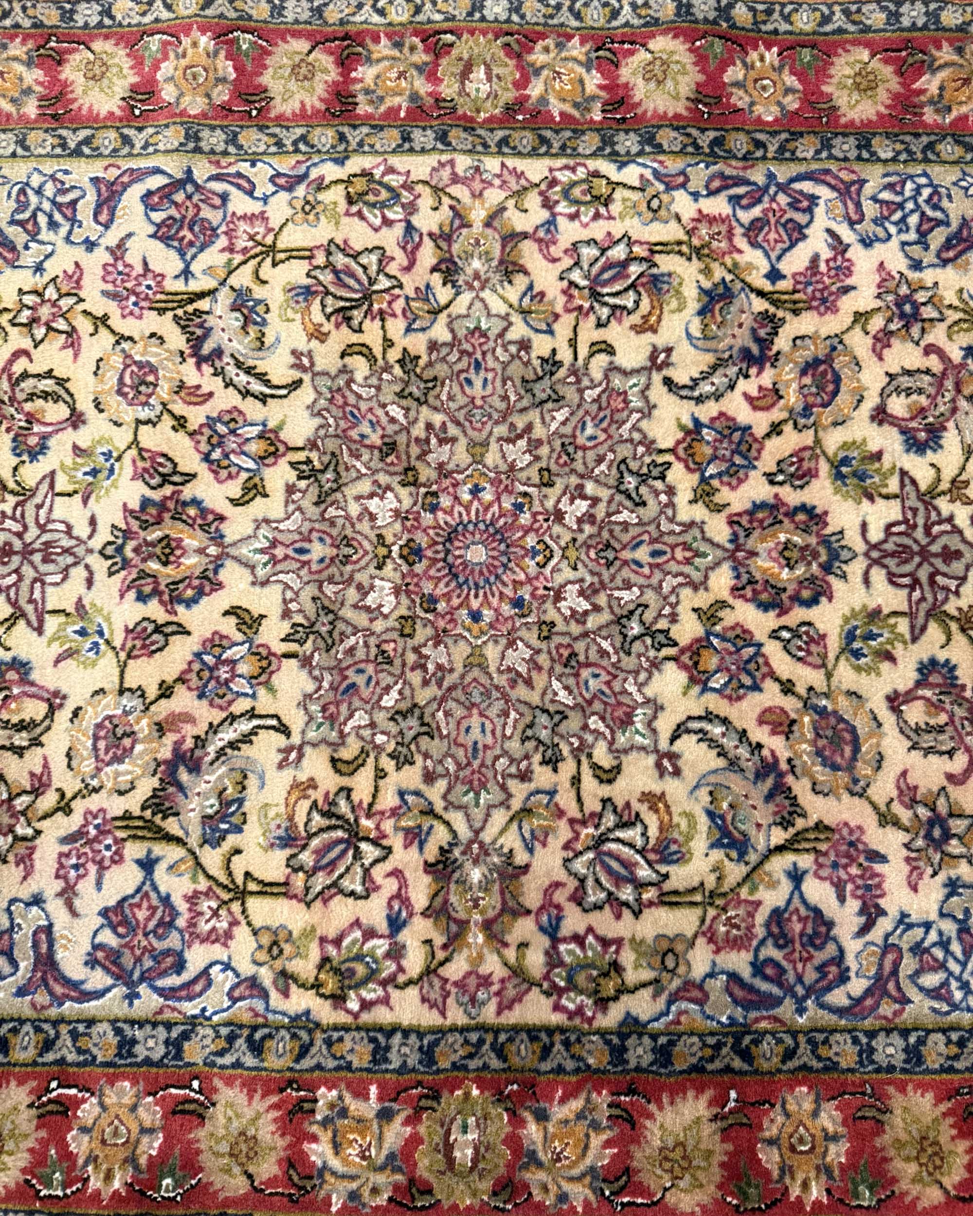 Este refinado Isfahan persa é uma verdadeira obra-prima em miniatura. Tecelado à mão com lã de altíssima qualidade e detalhes em seda, apresenta um fundo em tom marfim que valoriza a riqueza dos arabescos e flores estilizadas em azul, vermelho, verde e dourado.