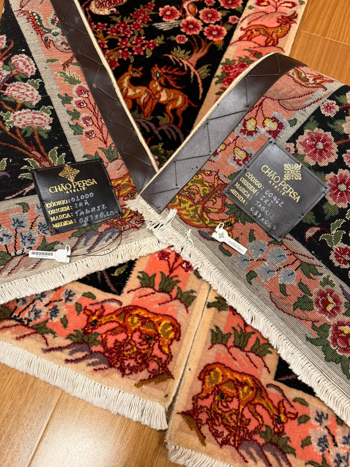 Este par de tapetes Tabriz figurativos revela a tradição artística de uma das cidades mais renomadas do Irã. O fundo negro intenso contrasta com a explosão de flores, cervos, pássaros e árvores, remetendo à simbologia dos jardins persas: harmonia, prosperidade e eternidade.