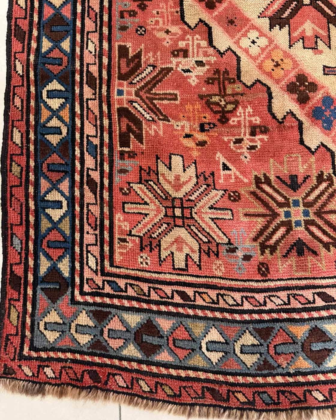 Seu campo em vermelho profundo, enriquecido por medalhões geométricos e motivos simbólicos típicos da tradição Shirvan, revela uma linguagem estética ancestral, marcada por precisão gráfica, forte contraste cromático e grande impacto visual. Cada elemento possui significado cultural e espiritual, refletindo a identidade das tribos que a produziram.
