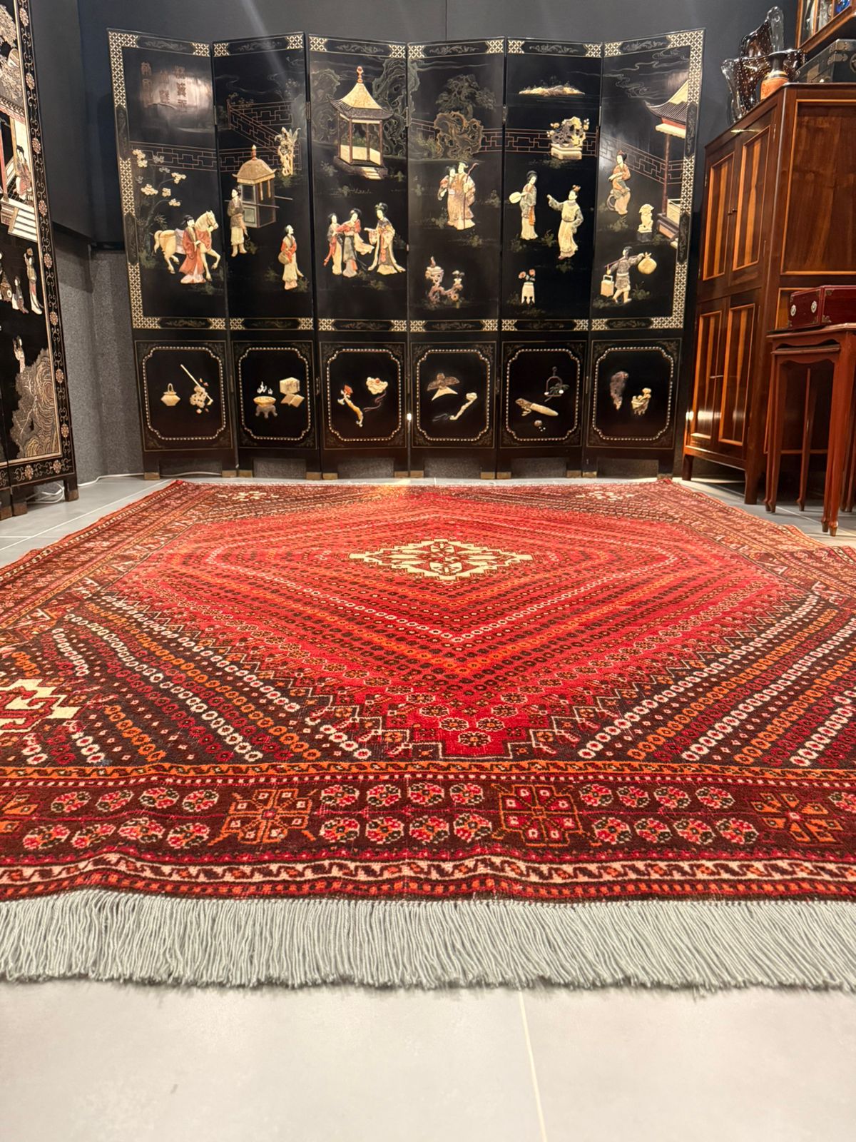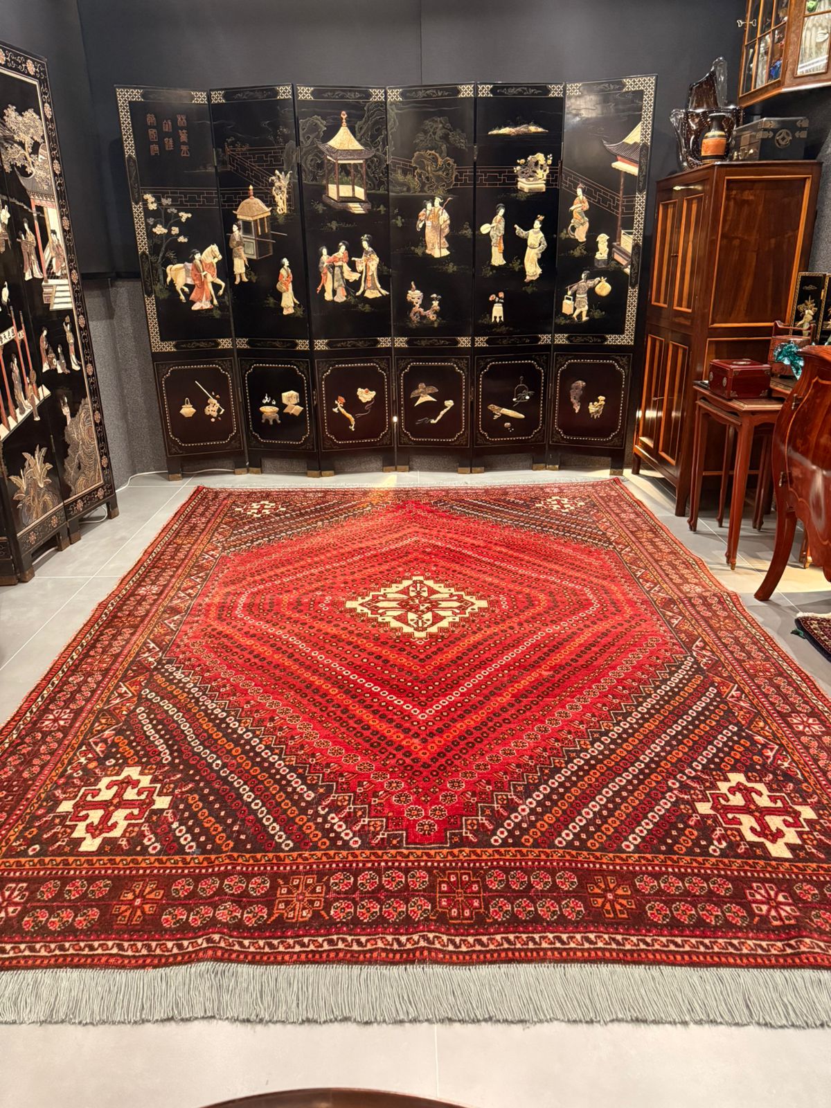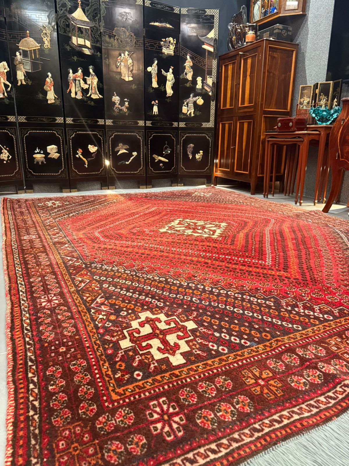 Os tapetes Qashqai são obras vivas da tradição dos povos nômades do sul do Irã. Este exemplar traz toda a intensidade da paleta vermelha, cor que simboliza vitalidade e proteção, com desenhos geométricos que remetem a símbolos tribais transmitidos por gerações.