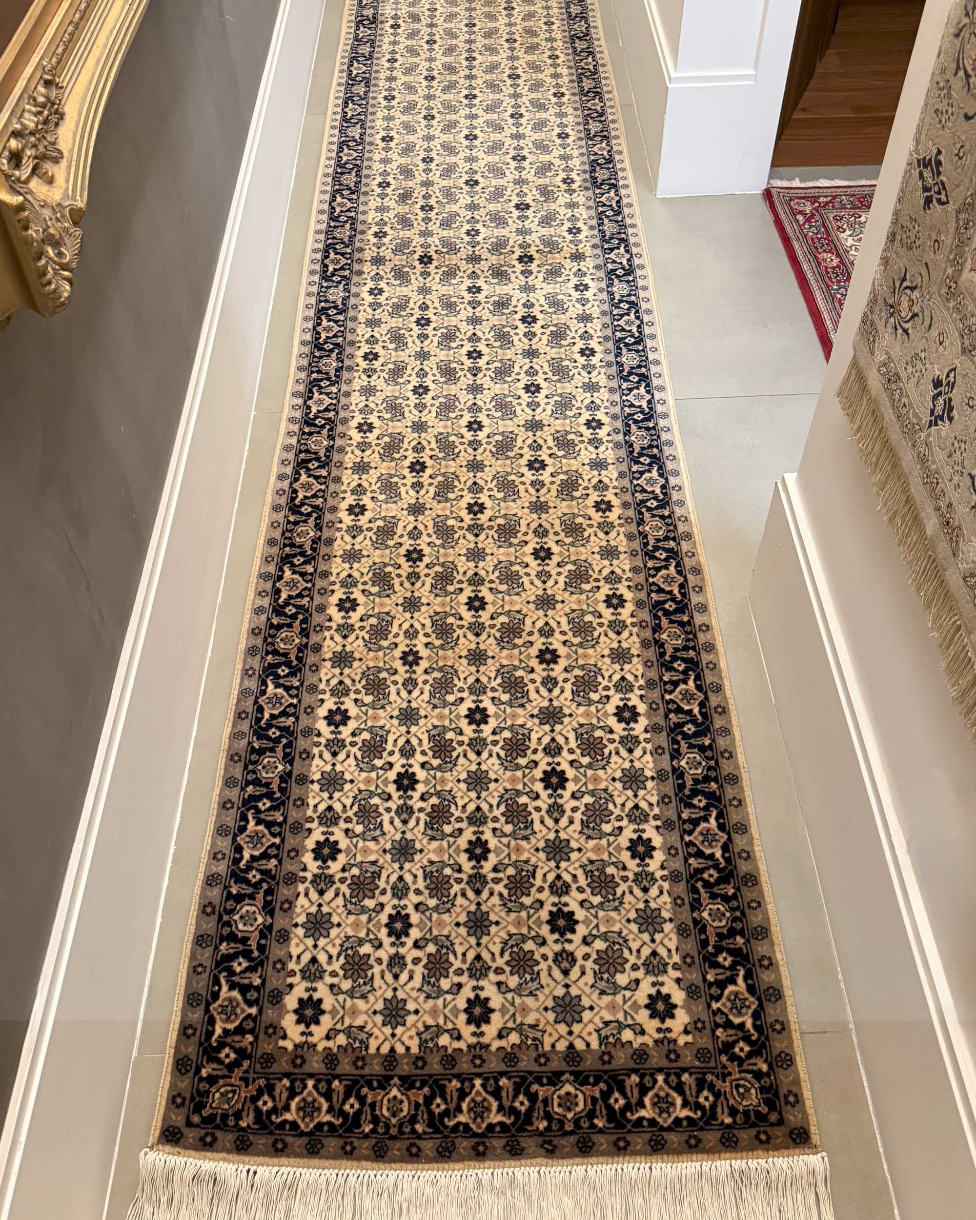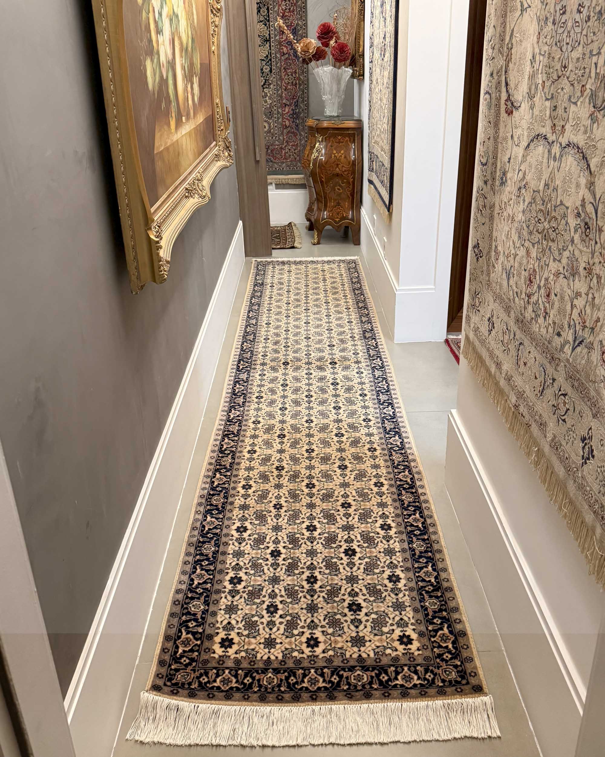 Esta imponente passadeira Isfahan Sino é um exemplar de alta categoria, tecida à mão em lã com detalhes em seda que acrescentam brilho e sofisticação ao desenho. Sua estrutura longa e estreita é ideal para corredores e halls, criando uma sensação de continuidade e imponência no espaço.