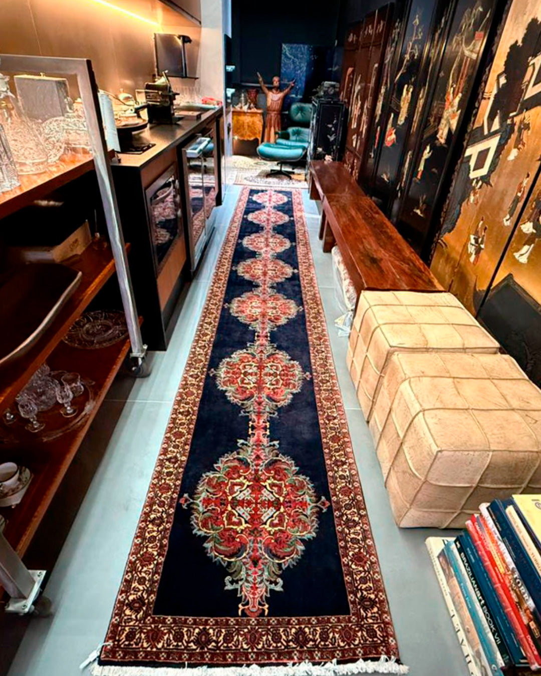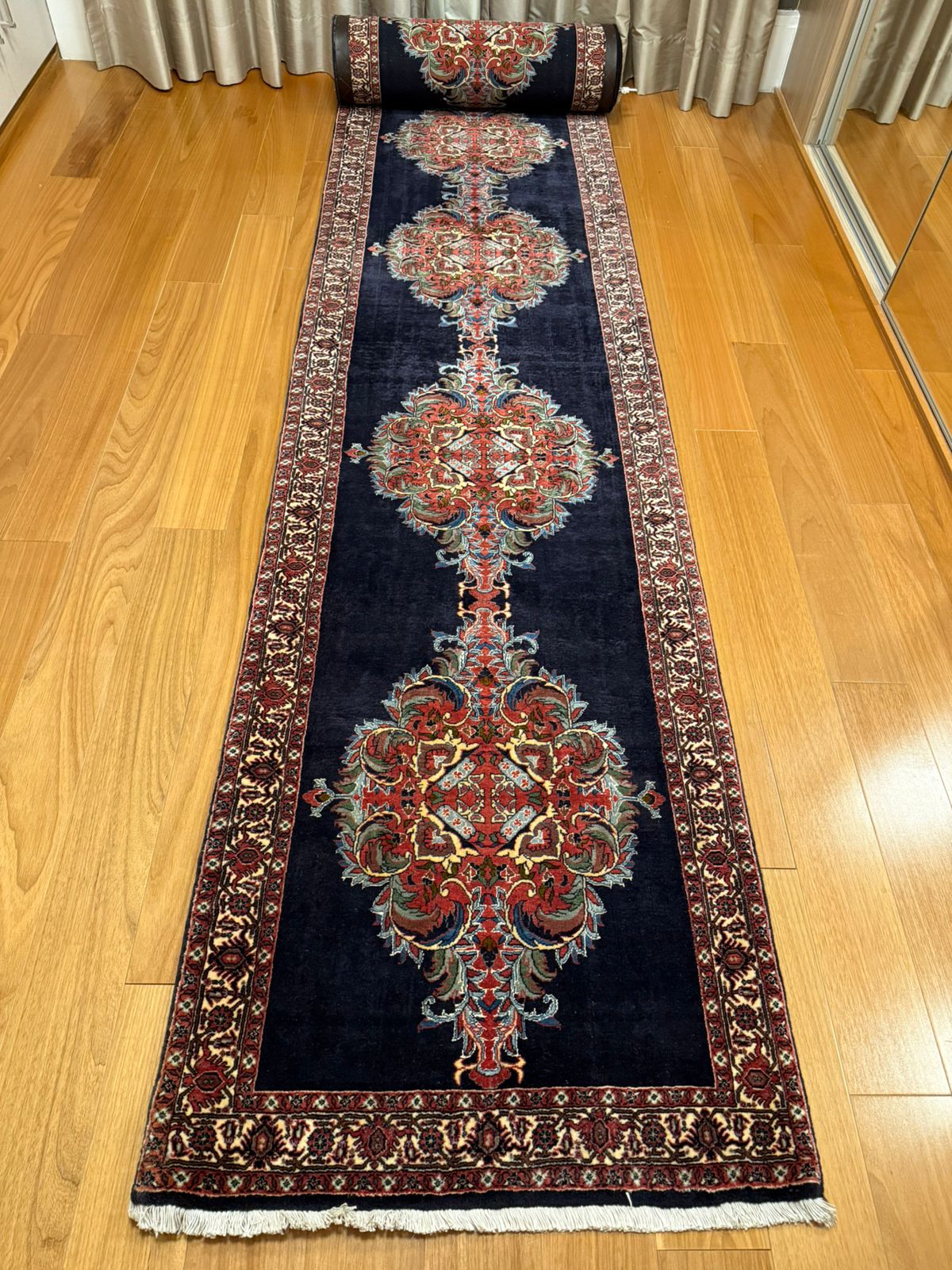 Esta magnífica passadeira é uma autêntica peça Bidjar, proveniente do noroeste do Irã, uma região reconhecida por produzir alguns dos tapetes mais resistentes do mundo. A característica “trama de ferro” refere-se à sua técnica de tecelagem extremamente densa, que confere à peça uma durabilidade extraordinária, tornando-a quase inquebrável – por isso, muitas vezes chamada de “o tapete de ferro”.