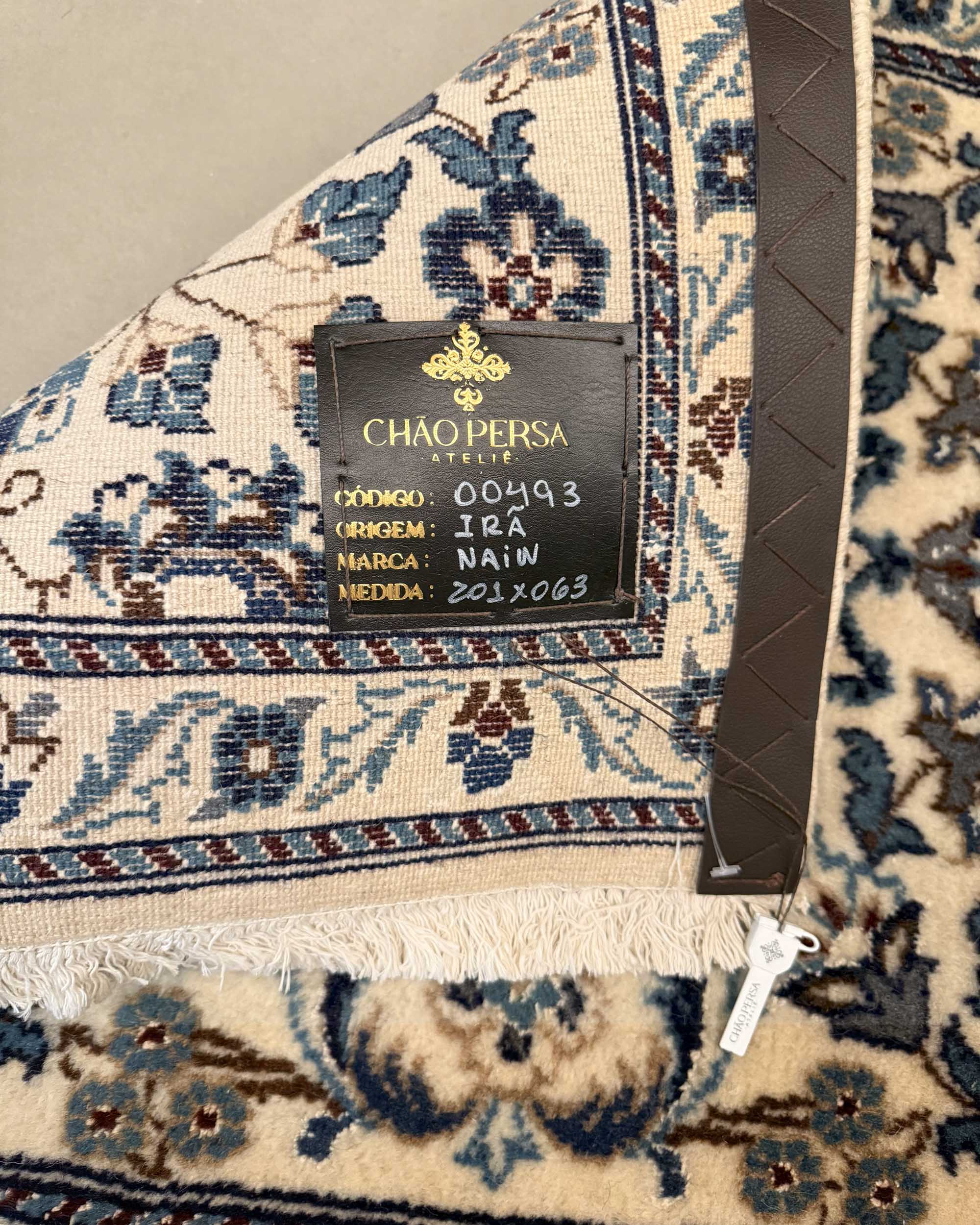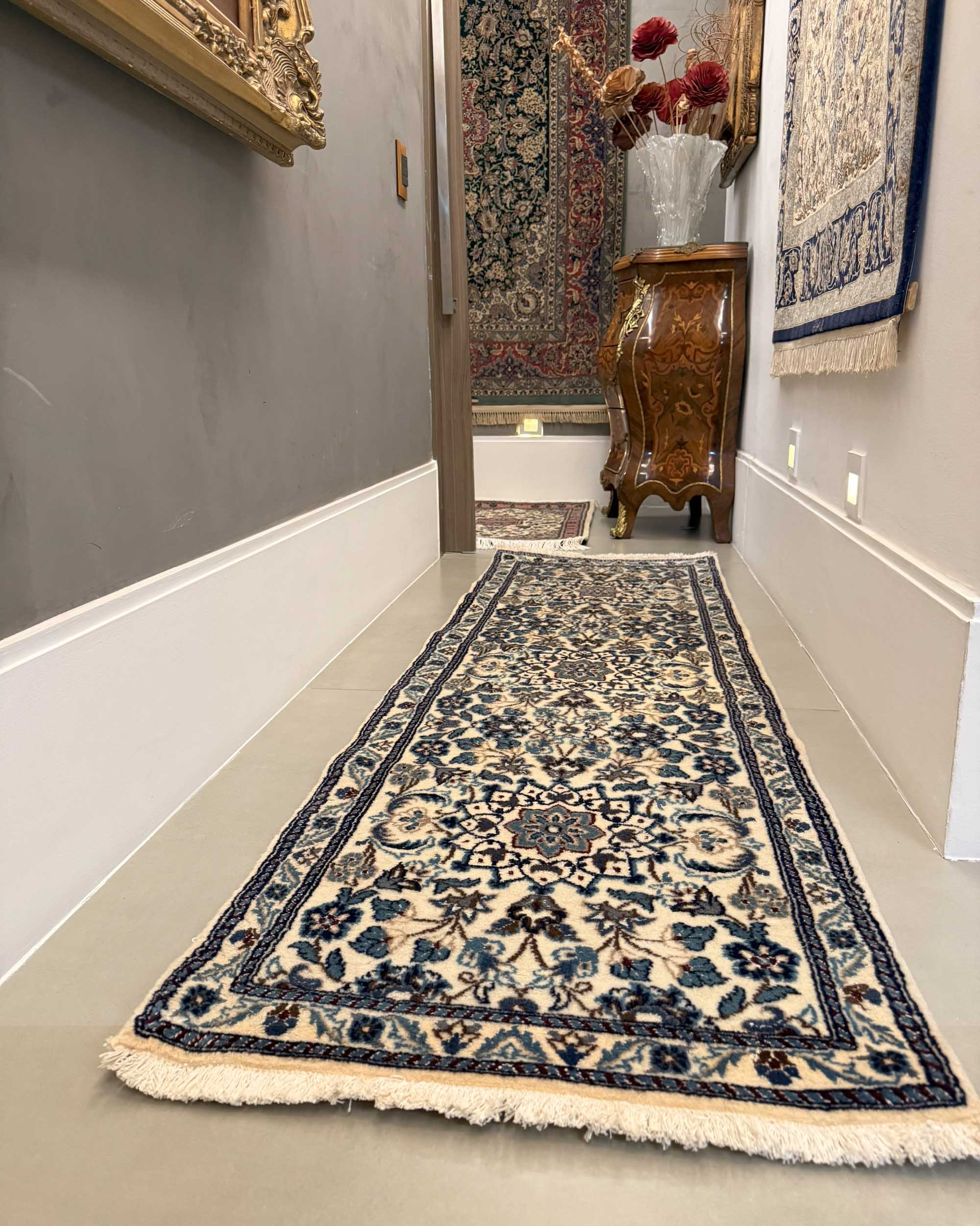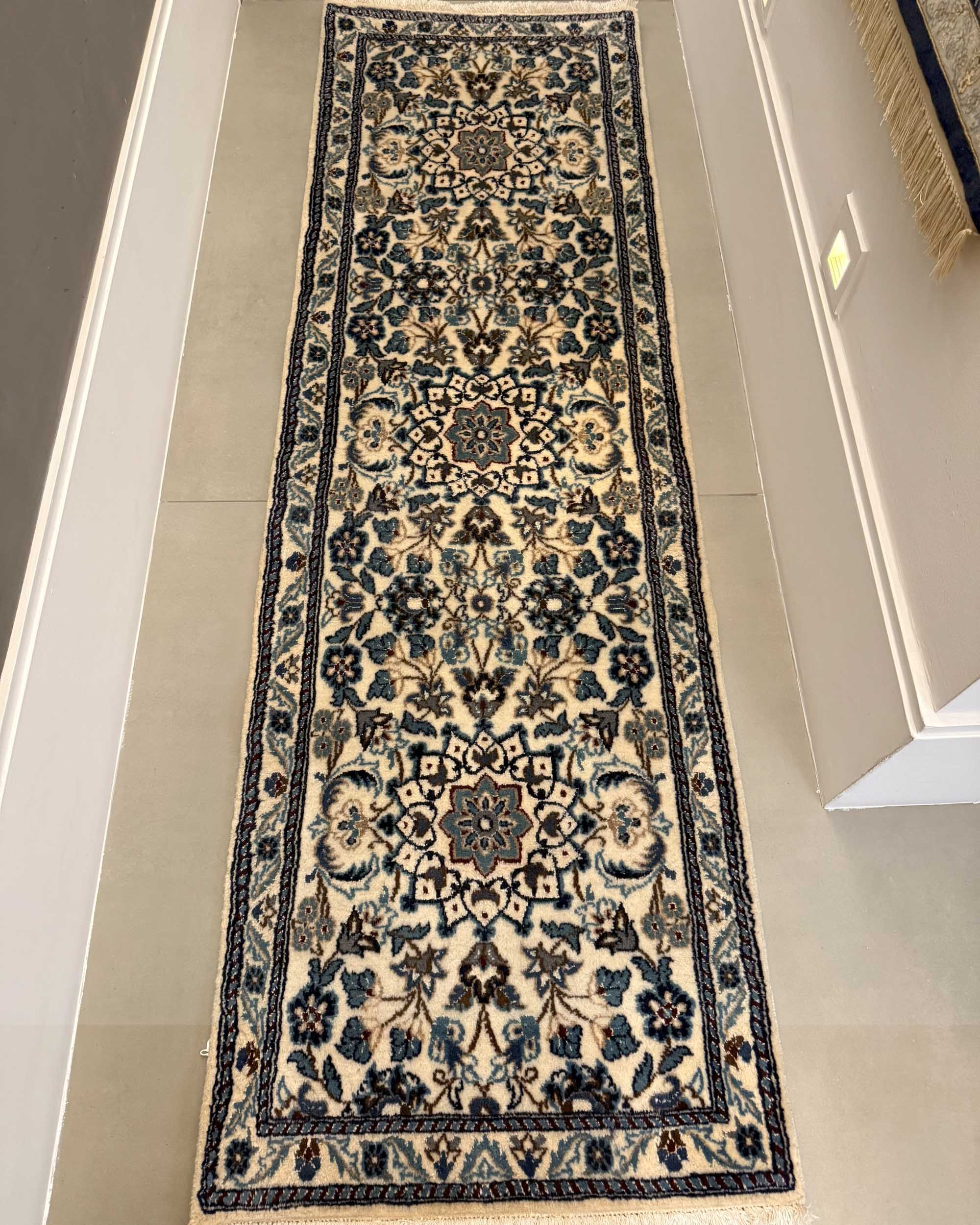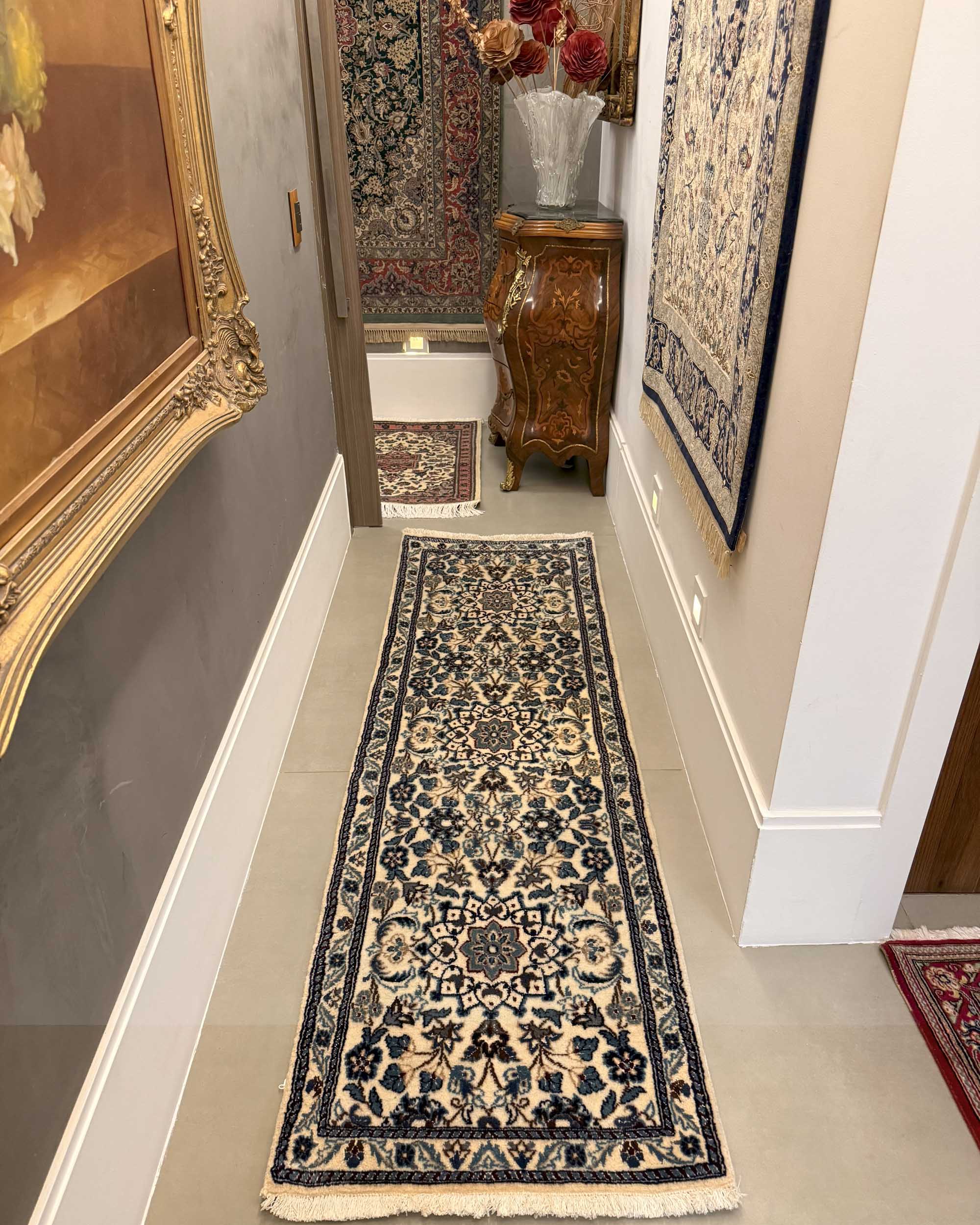 Esta elegante passadeira persa Nain é um exemplo da sofisticação que consagrou a cidade homônima como referência mundial em tapeçaria. Tecida à mão com lã de altíssima qualidade, apresenta um fundo em marfim suave, ornamentado por motivos florais em azul-marinho, azul-celeste e toques de marrom, criando um contraste refinado e harmonioso.