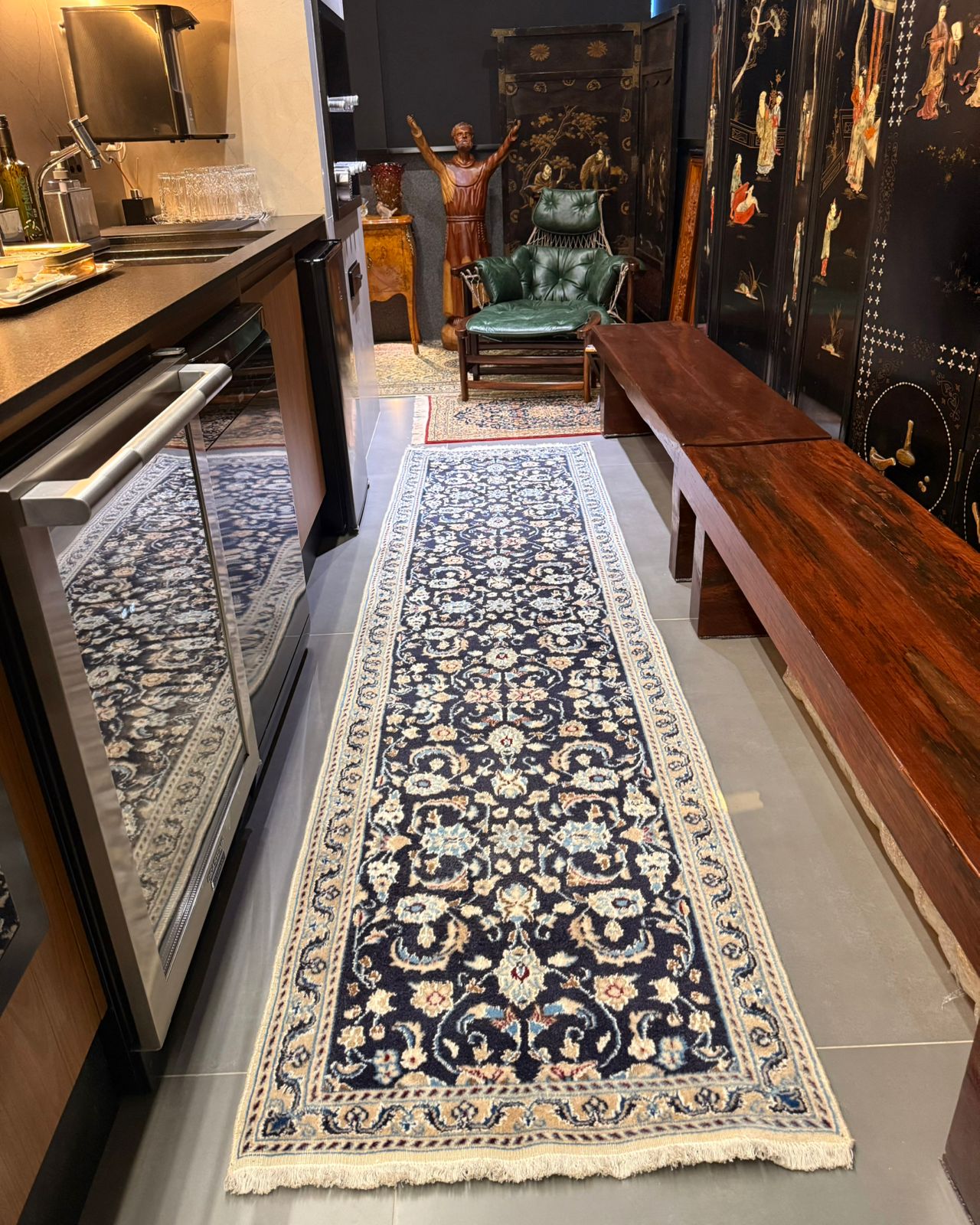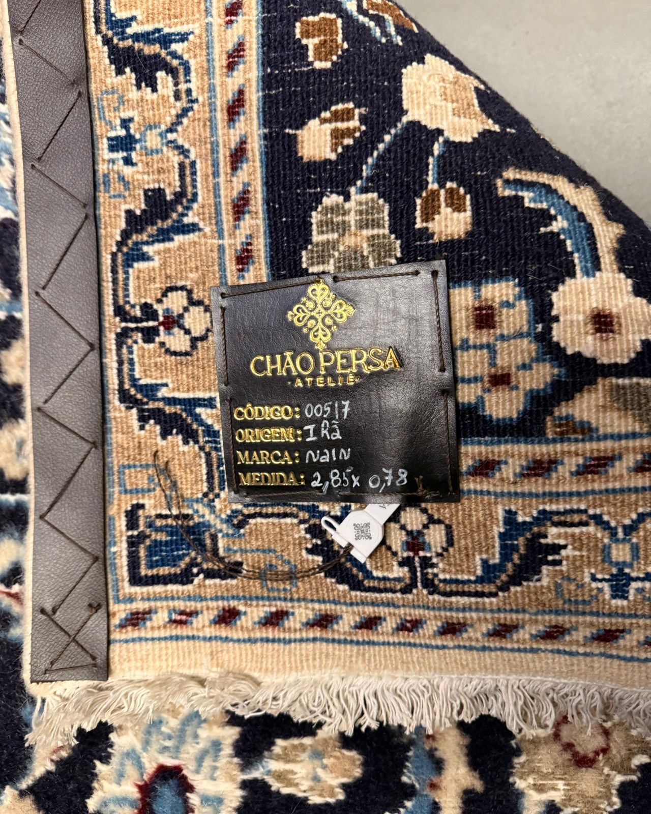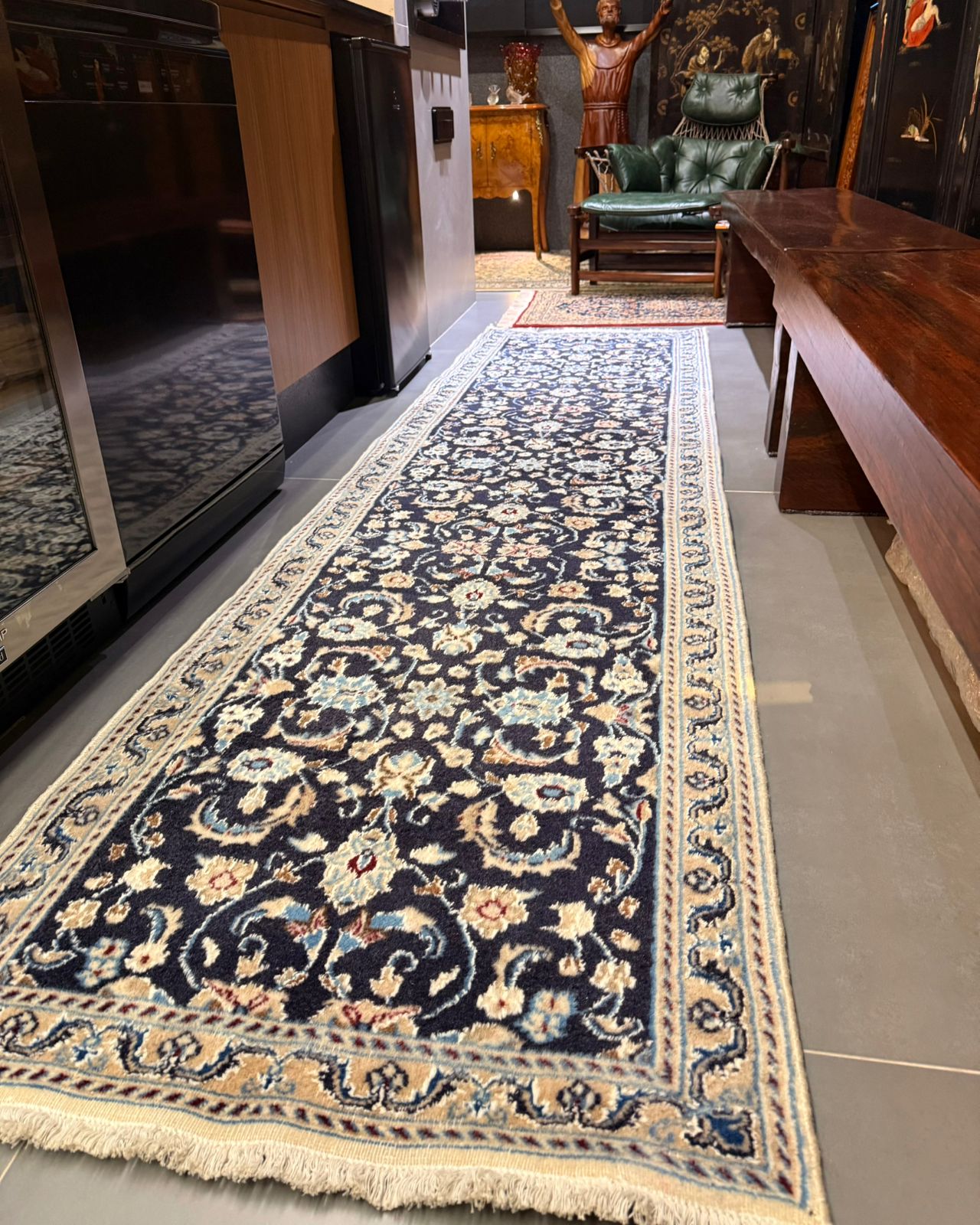 Nain é um dos polos mais prestigiados da tapeçaria persa. Reconhecida por sua paleta de cores refinada – onde predominam o azul-marinho, os tons de marfim e azul-claro – essa tradição reflete sobriedade e luxo ao mesmo tempo. Esta passadeira segue fielmente esse estilo: o fundo escuro profundo contrasta com flores luminosas, que parecem flutuar sobre o campo central.