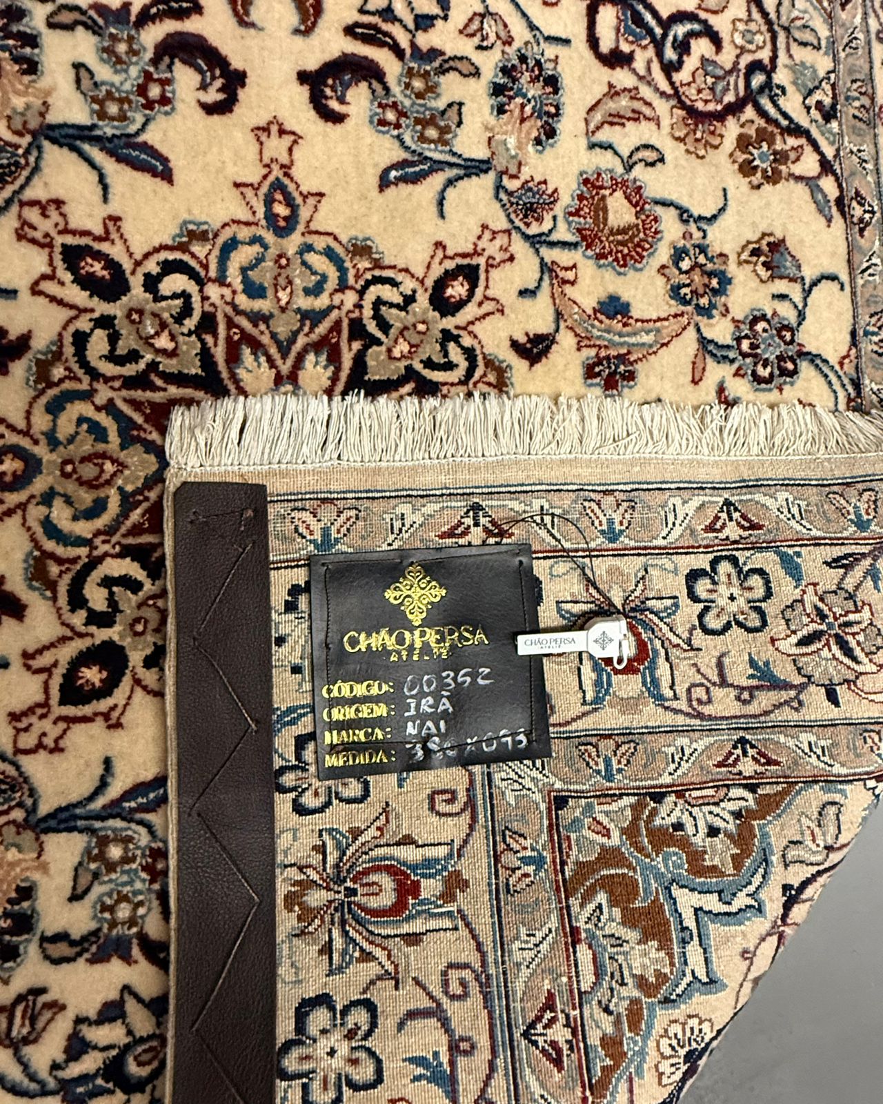 Este exemplar de Nain Extra Fine é uma verdadeira obra-prima da tapeçaria persa. Produzido na cidade de Nain, famosa por seus ateliês que unem tradição e altíssimo refinamento, o tapete apresenta uma densidade de nós impressionante, responsável pela nitidez e riqueza de cada detalhe floral.