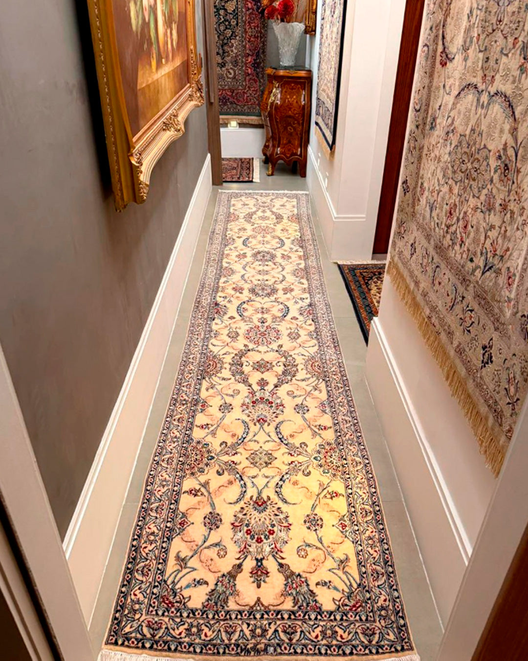 Além da beleza estética e riqueza técnica, essa passadeira carrega séculos de história e tradição da cidade de Nain, localizada ao centro do Irã, onde famílias de mestres artesãos preservam até hoje o saber ancestral da tapeçaria fina.