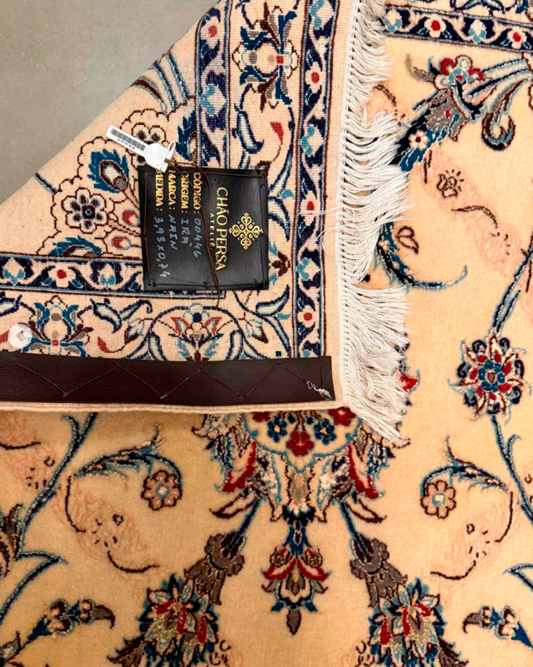 Seu campo em tom marfim claro realça com suavidade os arabescos entrelaçados em azul profundo, azul-claro e delicados toques em vermelho rubi — paleta clássica da tradição Nain. A borda, finamente desenhada, equilibra a composição com elegância, e as franjas em algodão natural acrescentam leveza e movimento.