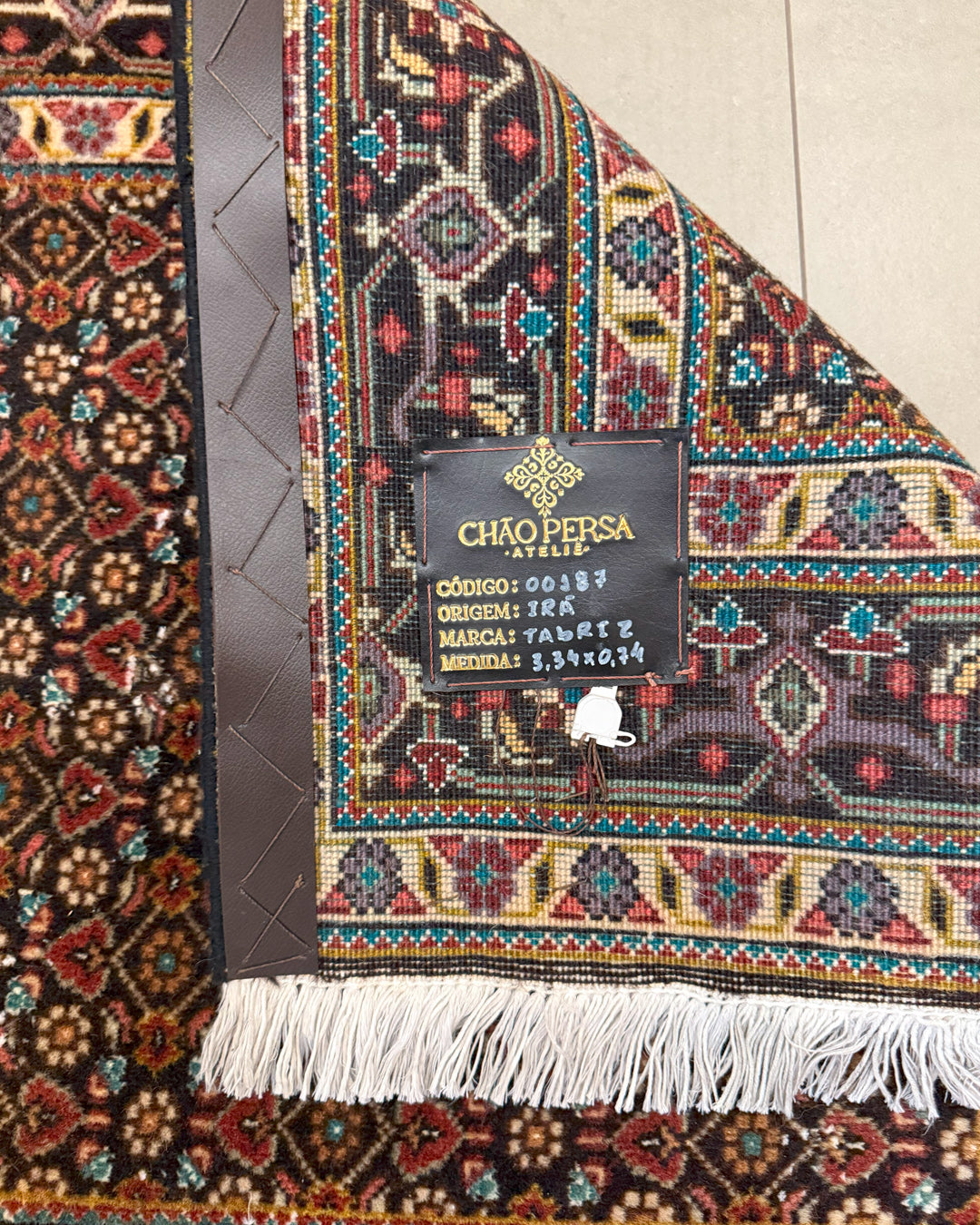 Esta passadeira persa Tabriz é um exemplar raro, produzido na cidade que é referência mundial em tapeçaria de luxo. Seu desenho em padrão repetitivo de pequenas flores e medalhões geométricos revela a paciência e a maestria dos artesãos persas, que tecem cada detalhe com perfeição absoluta.
