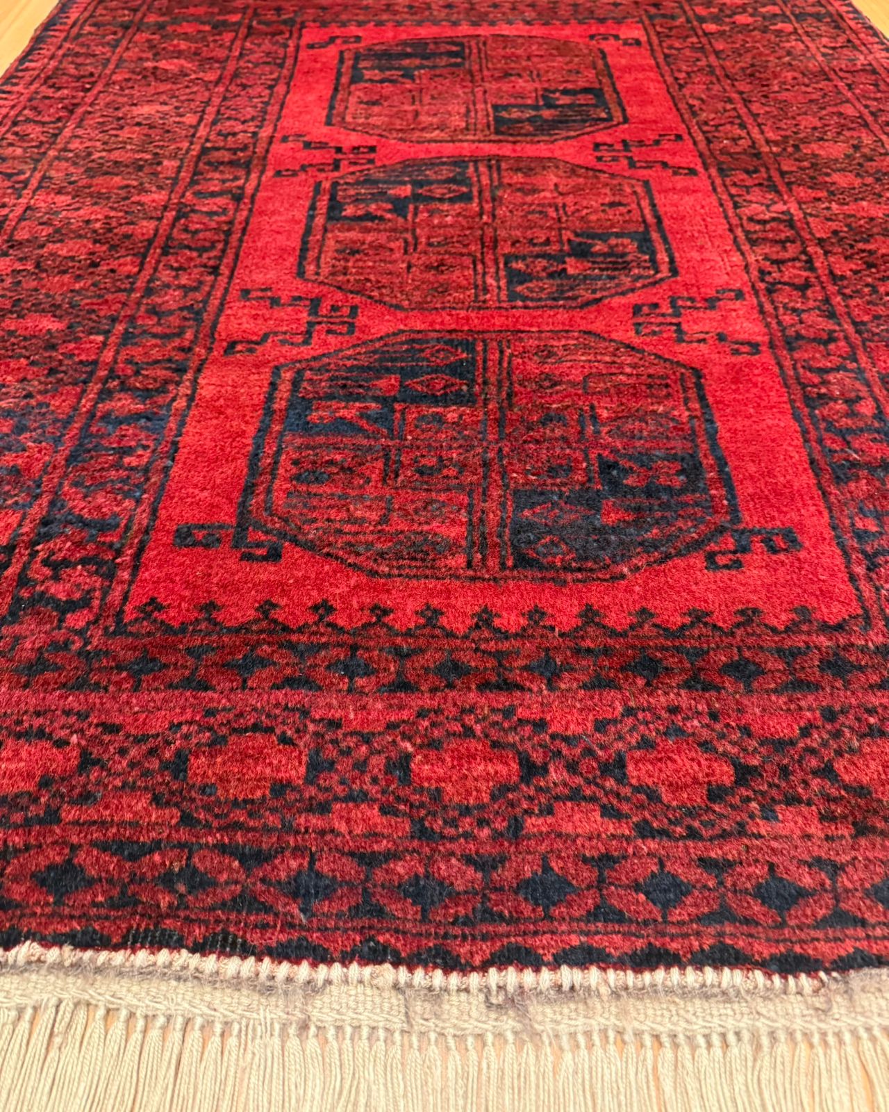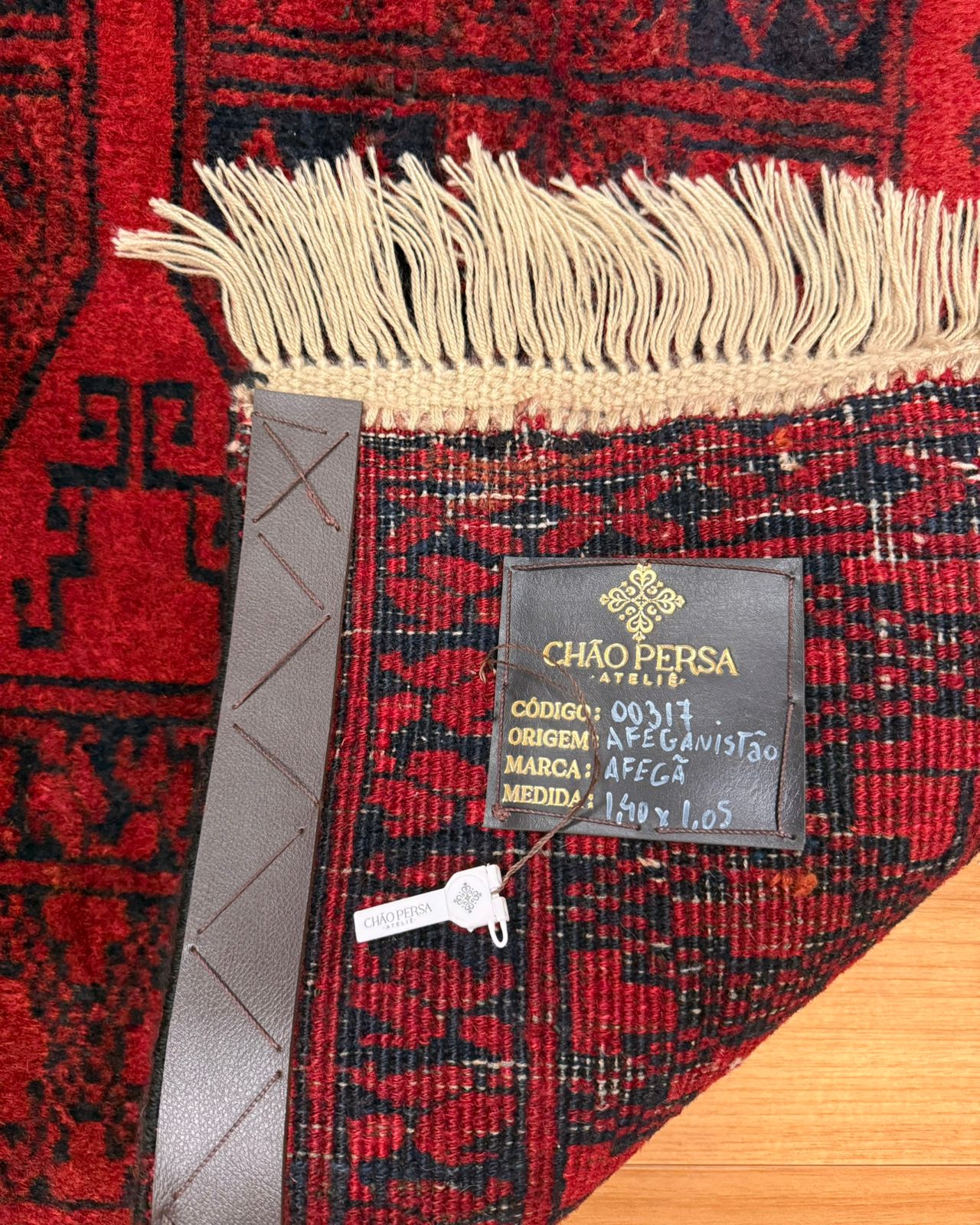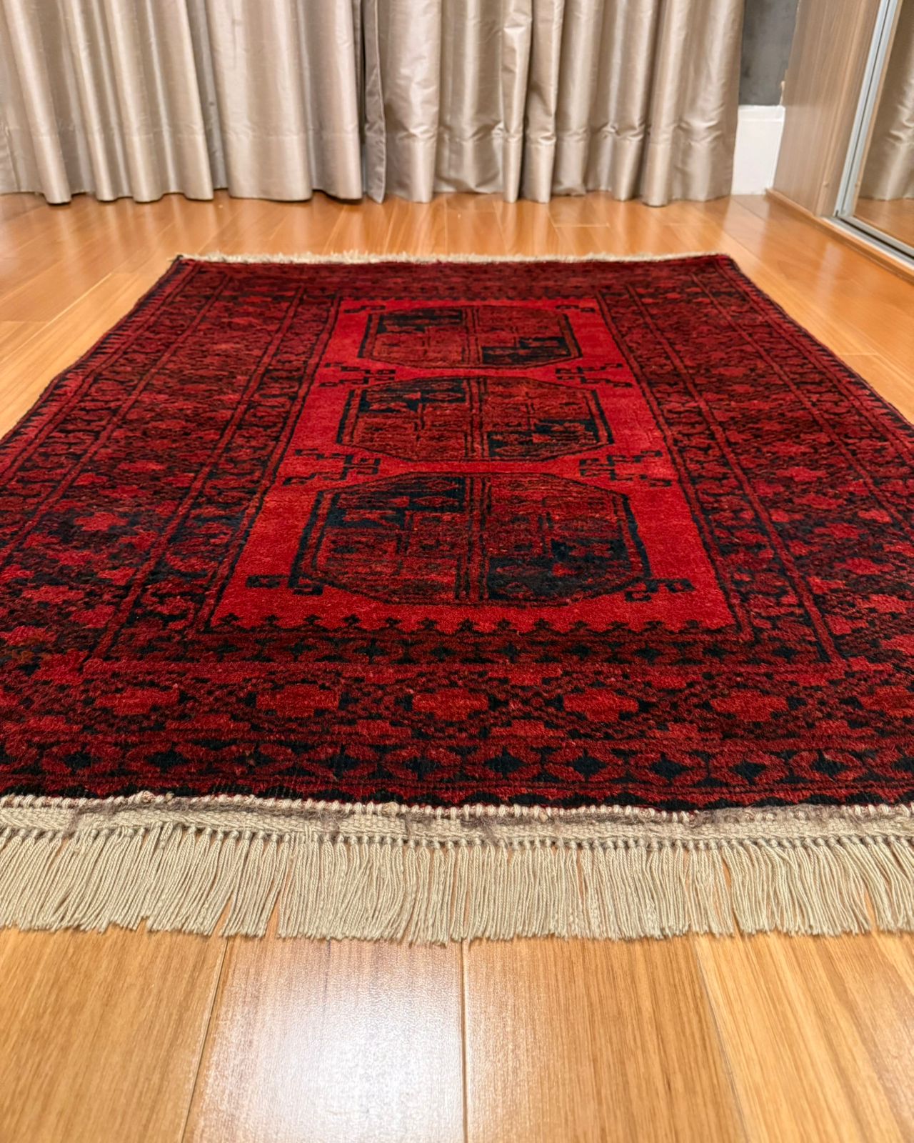 Este tapete afegão é marcado pelo clássico desenho gul, um dos símbolos mais antigos das tribos nômades da região. Seus medalhões geométricos repetidos sobre o fundo vermelho profundo evocam proteção, identidade e continuidade cultural, transmitidas de geração em geração como herança de um povo resiliente.