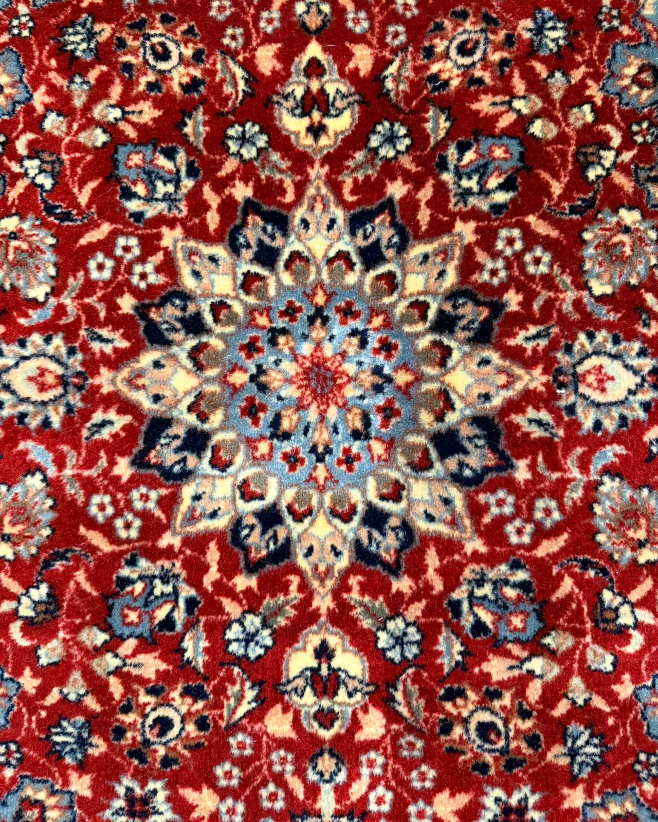 Este delicado exemplar segue o desenho clássico da escola de Isfahan, com medalhão central em azul e bege, emoldurado por arabescos florais em tons de vermelho profundo, dourado e marfim. Apesar de sua origem indiana, a tapeçaria respeita os cânones persas, sendo ideal como peça de decoração, centro de mesa ou para colecionadores que apreciam a estética refinada da tradição oriental.
