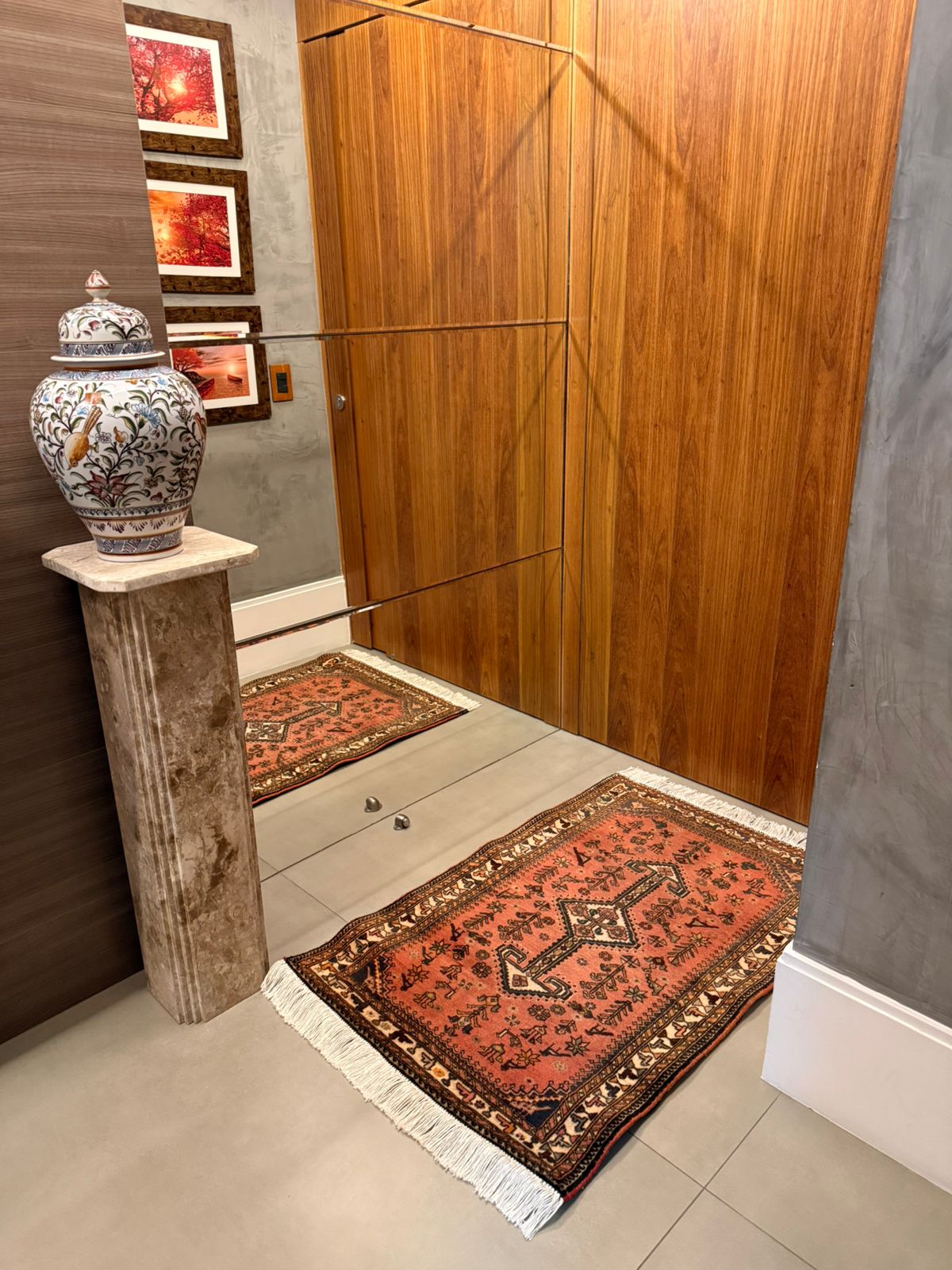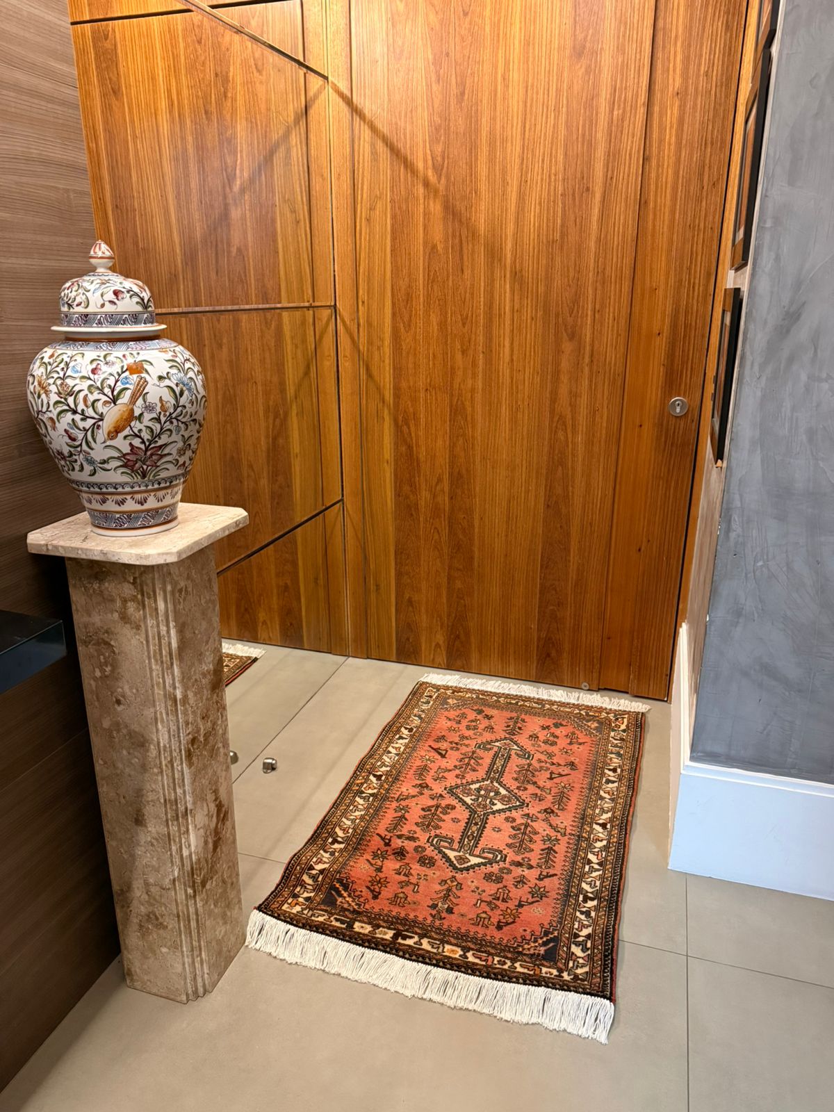 Este belo exemplar da região de Abadé, no centro do Irã, representa a essência da tapeçaria tribal persa. O campo em vermelho queimado é adornado por um medalhão geométrico central e figuras estilizadas que remetem a árvores, flores e animais – símbolos de fertilidade, proteção e prosperidade.