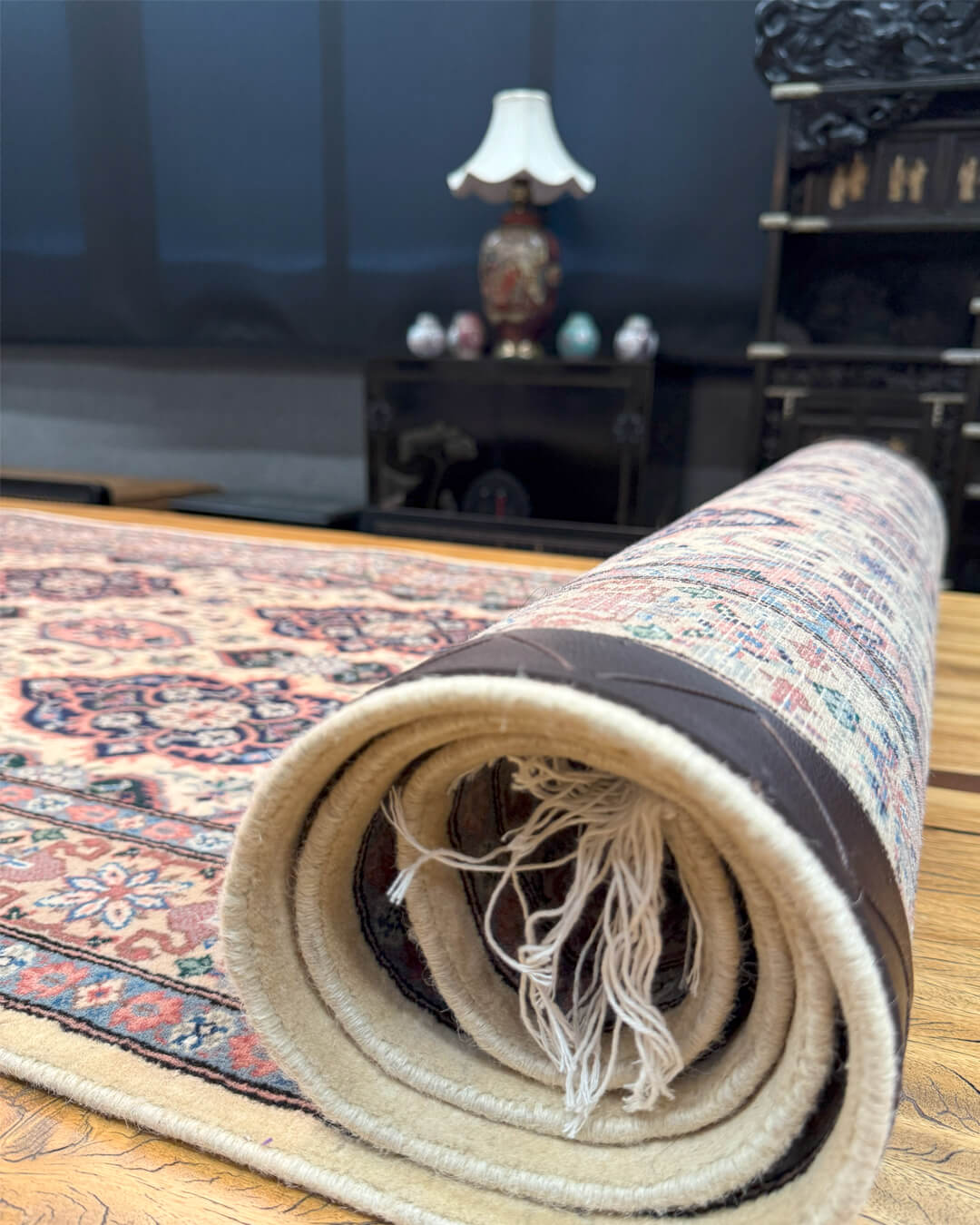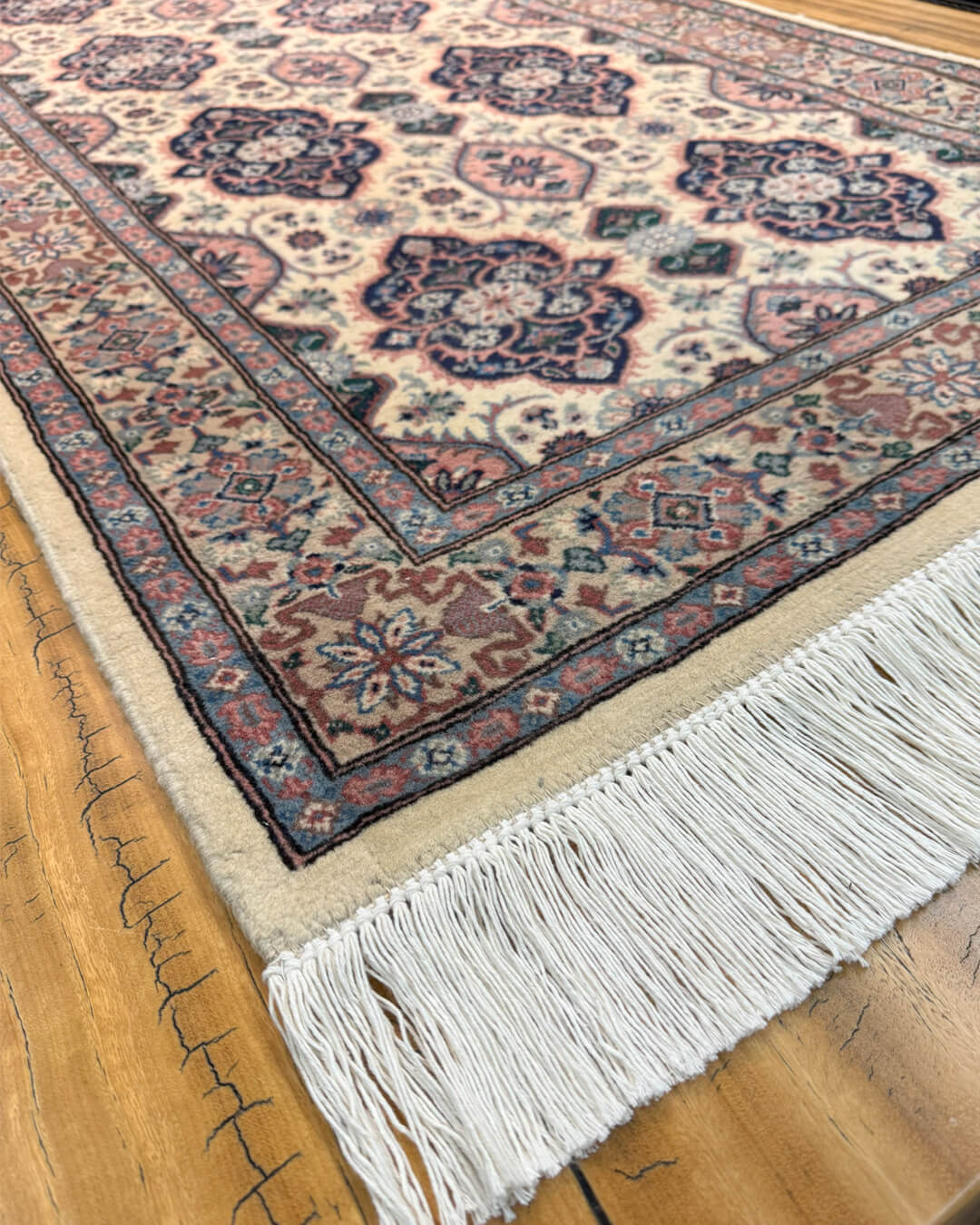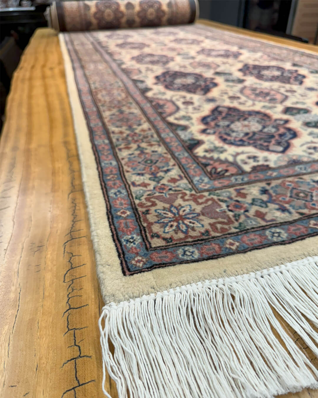 Este requintado tapete Kirmansha é um exemplo de sofisticação atemporal, inspirado na tradição dos tapetes Kirman, conhecidos por seus padrões elegantes e harmoniosos. Sua composição apresenta medalhões simétricos e motivos florais delicadamente entrelaçados, trabalhados em tons de azul-marinho profundo, rosado suave e verde discreto sobre um fundo marfim que ilumina o ambiente.