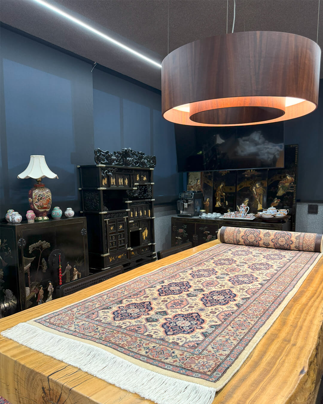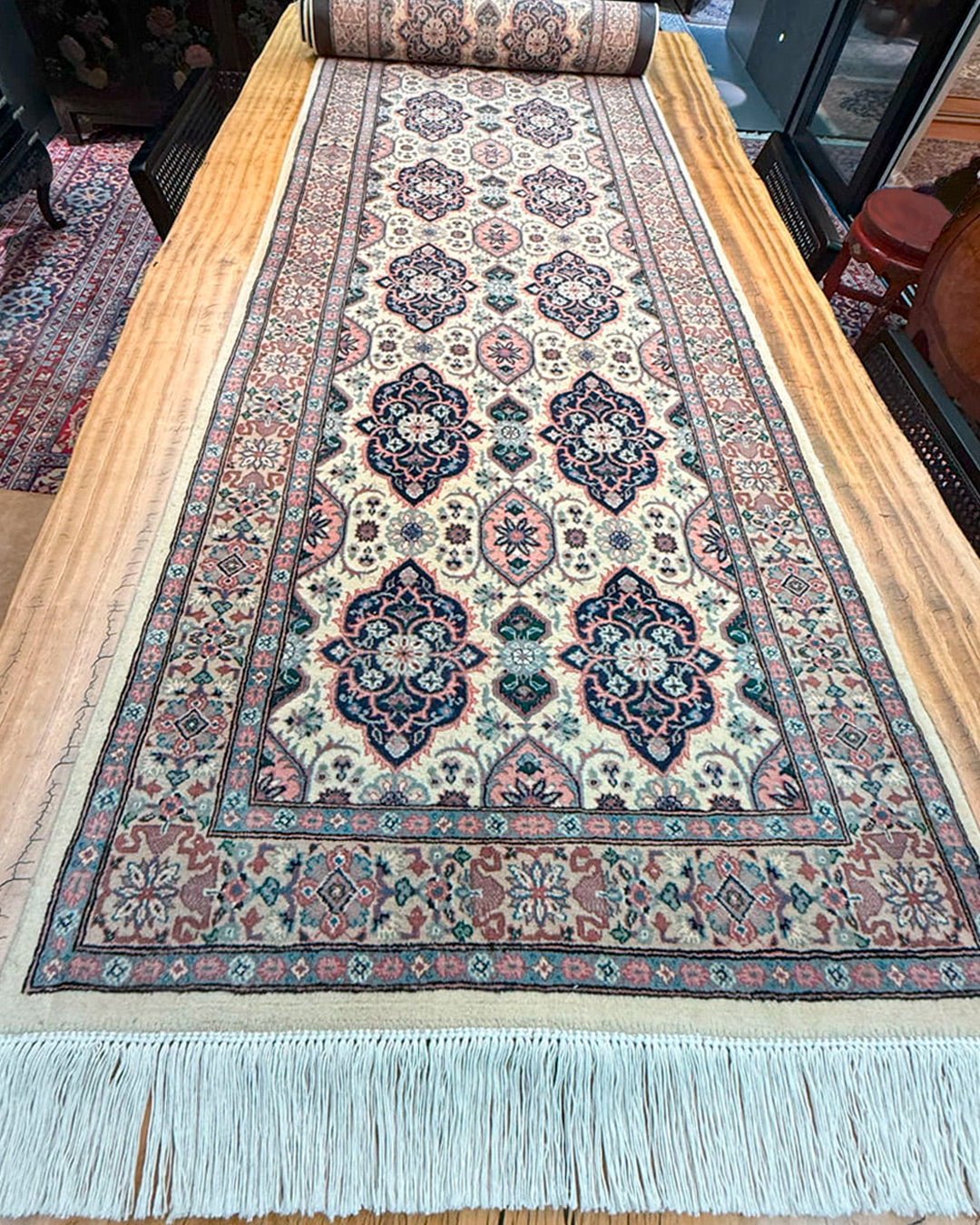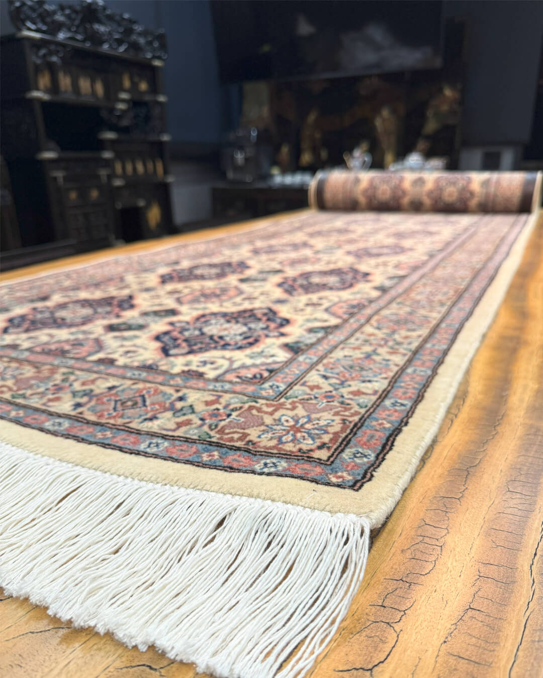 Sua proporção longa e estreita o torna versátil: perfeito para corredores, halls, ou como destaque sobre mesas de madeira, onde cria uma atmosfera calorosa e refinada. Em qualquer espaço, este Kirmansha se transforma em peça de impacto, trazendo charme e distinção ao décor.