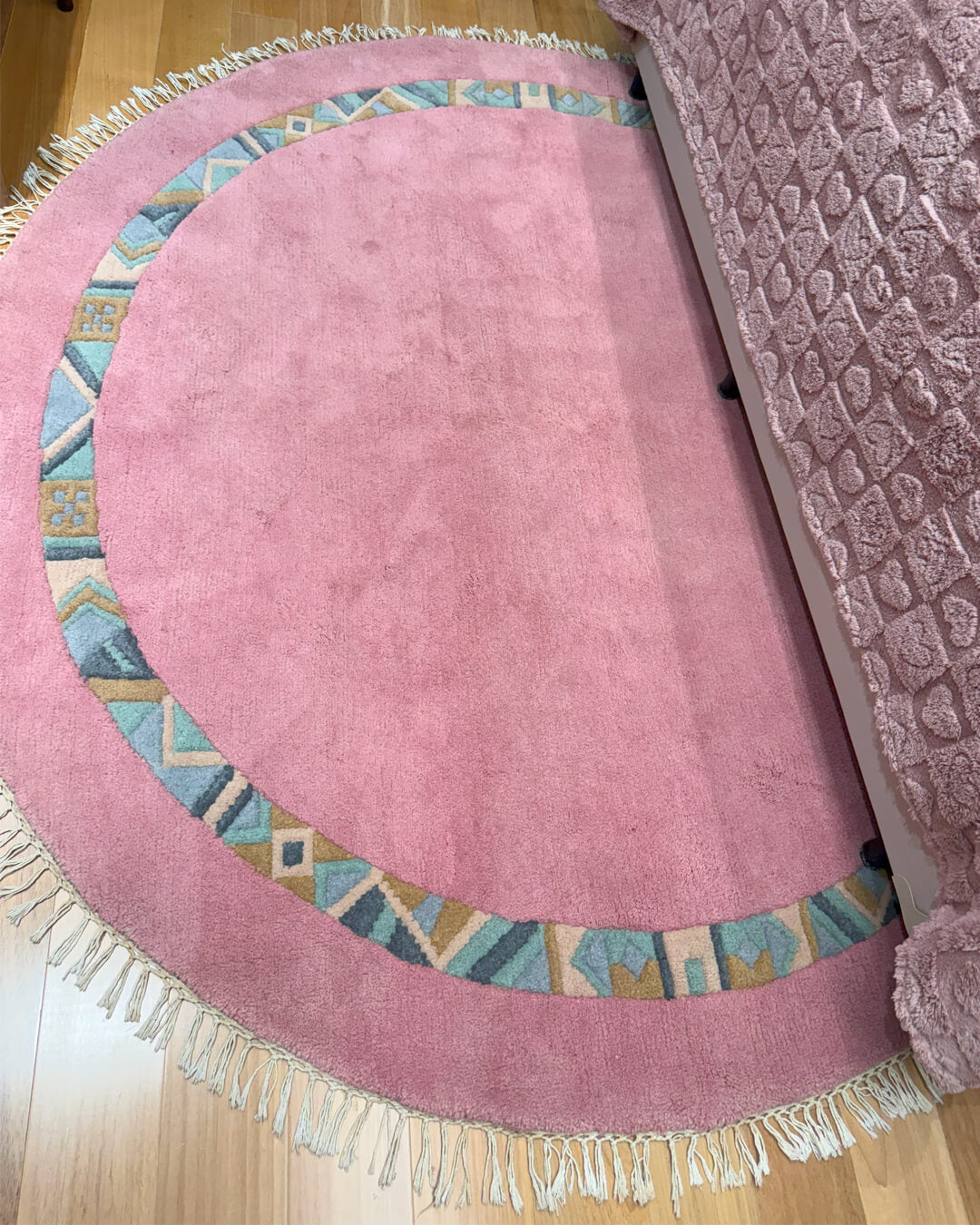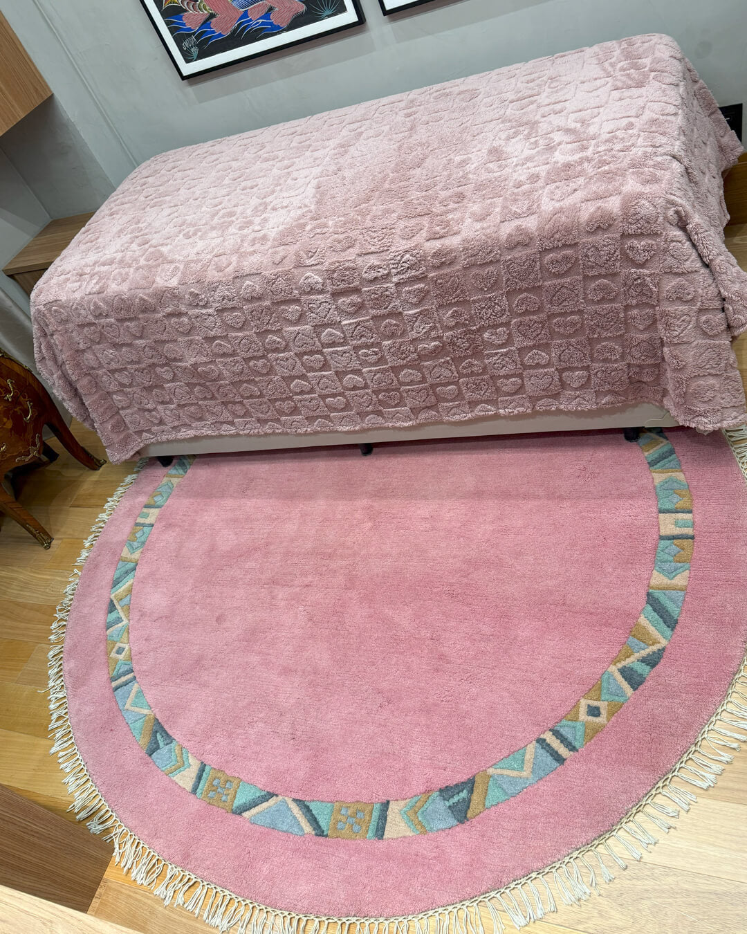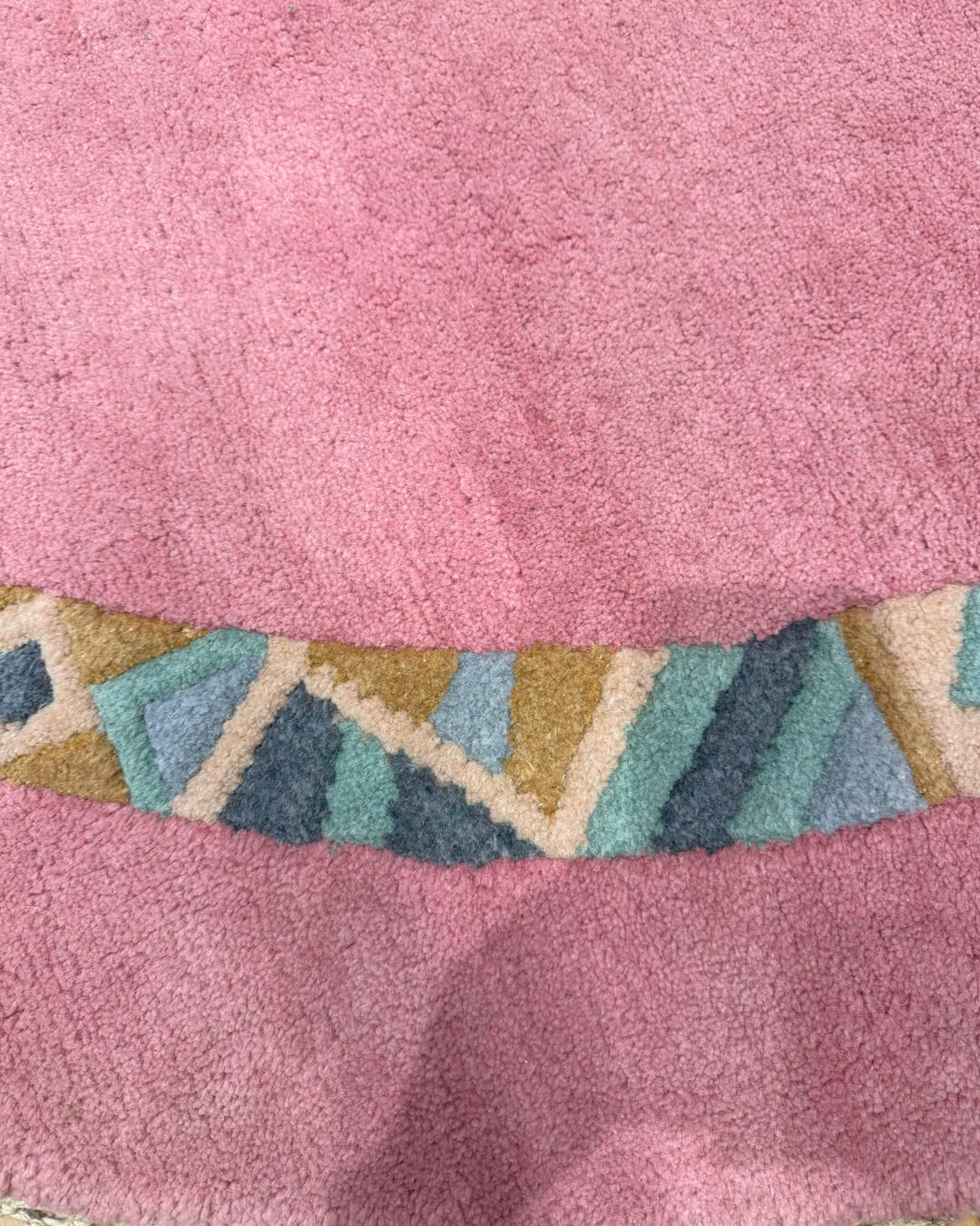 Este tapete Nepal, feito à mão em lã macia e durável, é um verdadeiro coringa na decoração. Seu tom verde suave transmite calma e aconchego, enquanto a borda colorida, com formas geométricas artísticas, adiciona personalidade e charme ao ambiente.