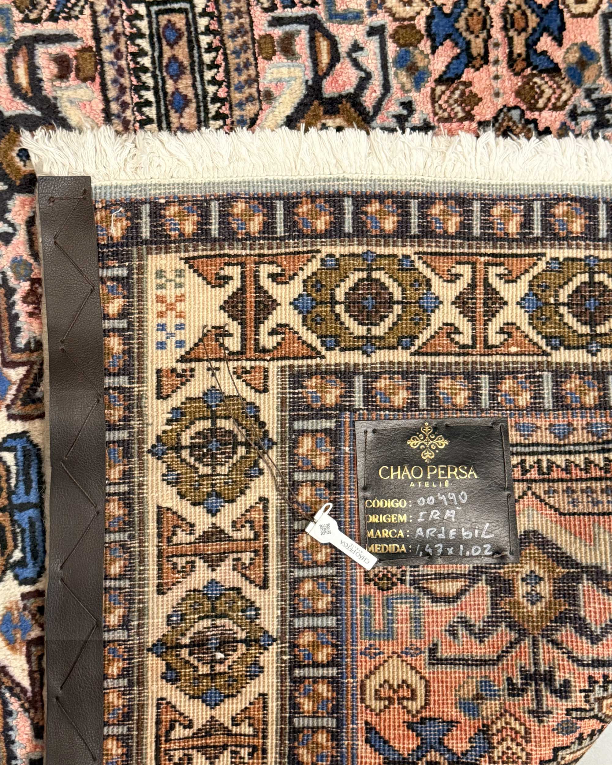 Este autêntico Ardebil é um clássico da tapeçaria do noroeste do Irã, região célebre pela firmeza de suas tramas e pela originalidade de seus desenhos. O fundo em tom rosado, raro e luminoso, realça medalhões geométricos em azul-marinho, dourado e marfim, criando uma composição equilibrada e de forte impacto visual.