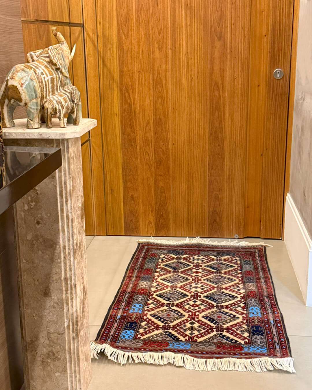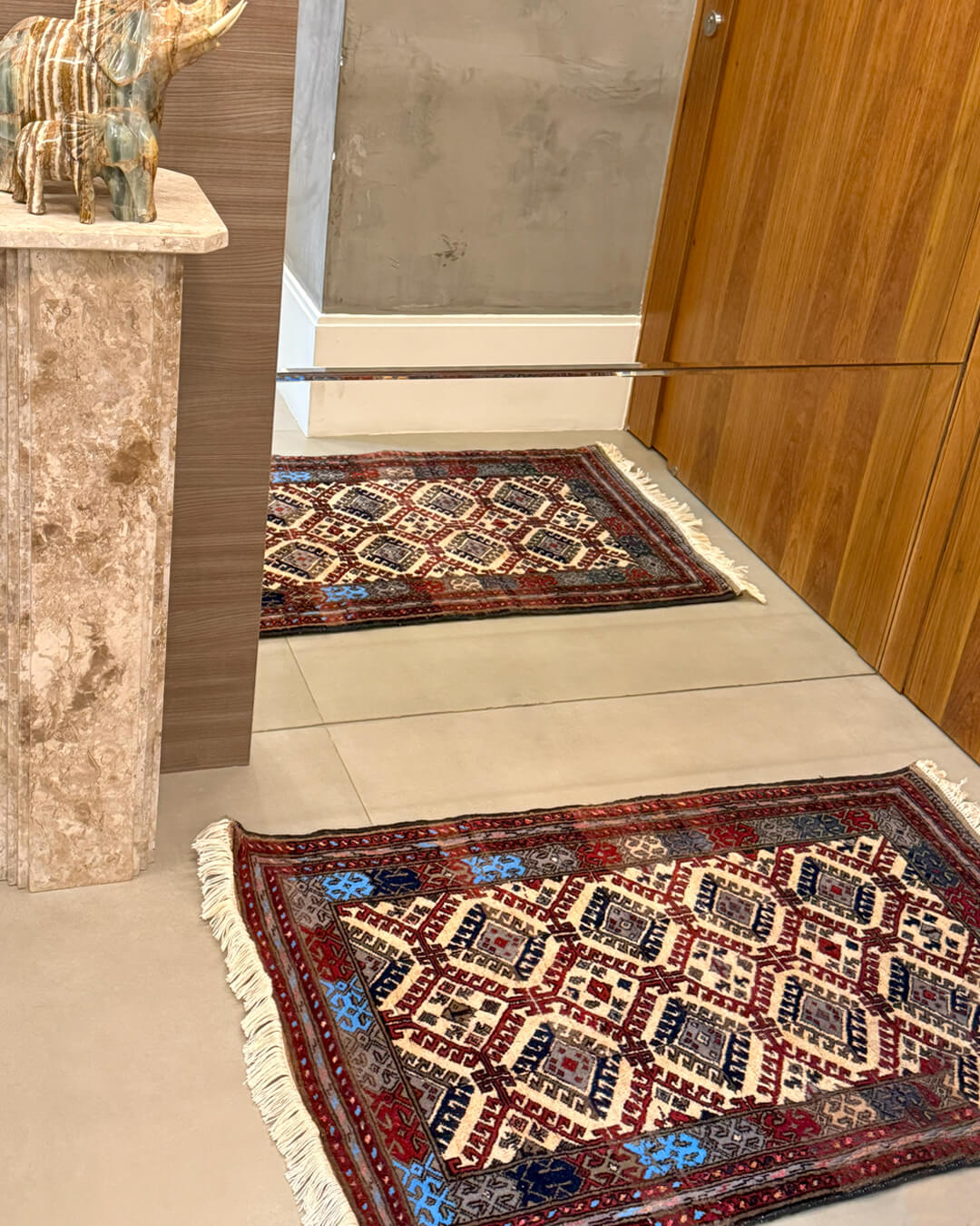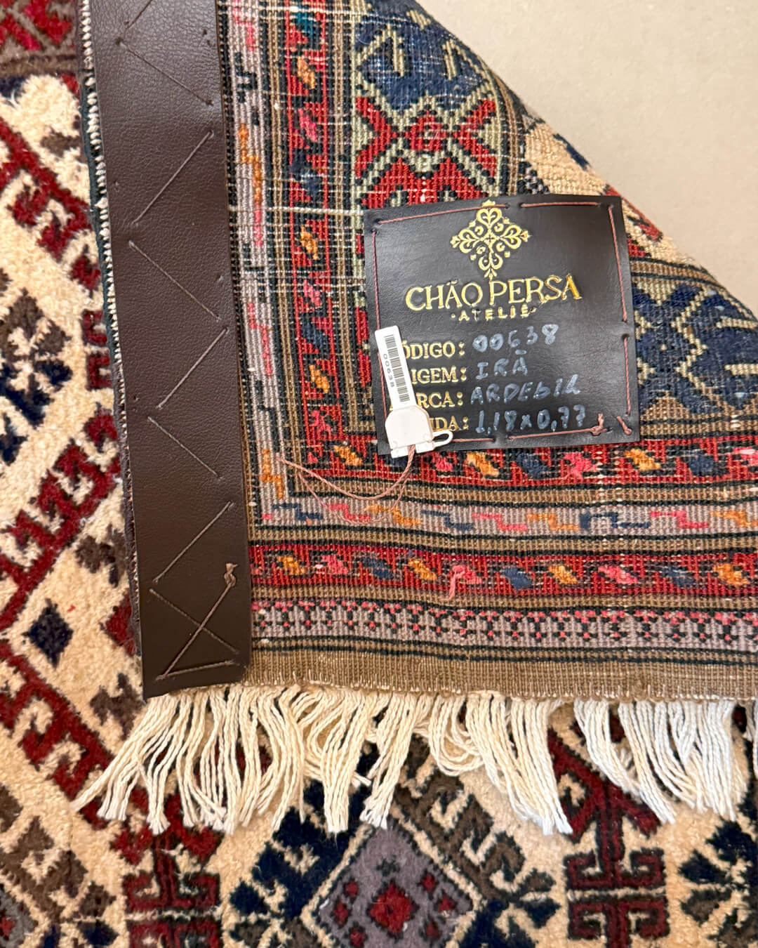Este belíssimo Tapete Ardebil vem da região do Azerbaijão iraniano, conhecida por produzir peças com forte identidade tribal. Seu design geométrico com losangos interligados é típico da tradição nômade, transmitindo força, simetria e movimento.
