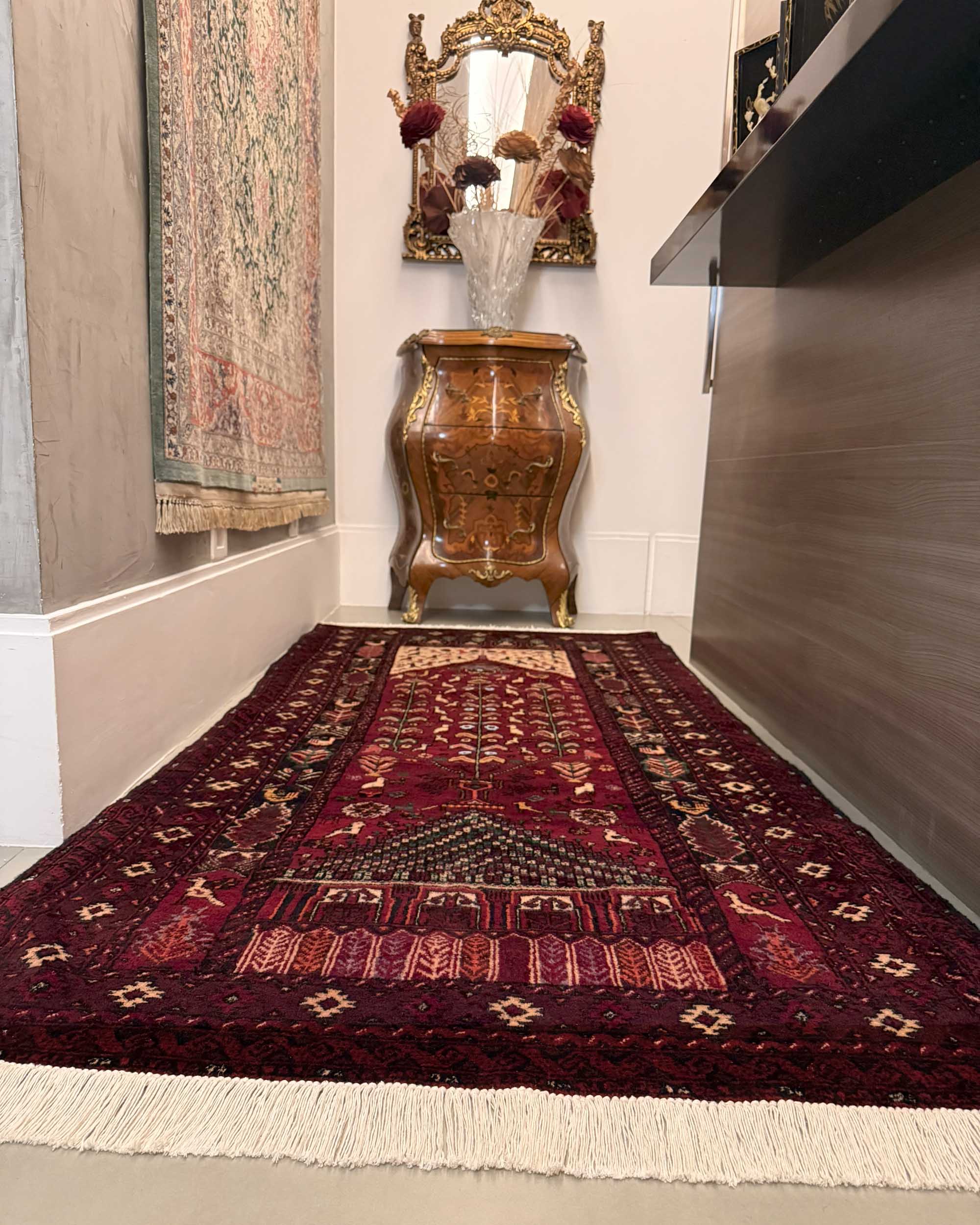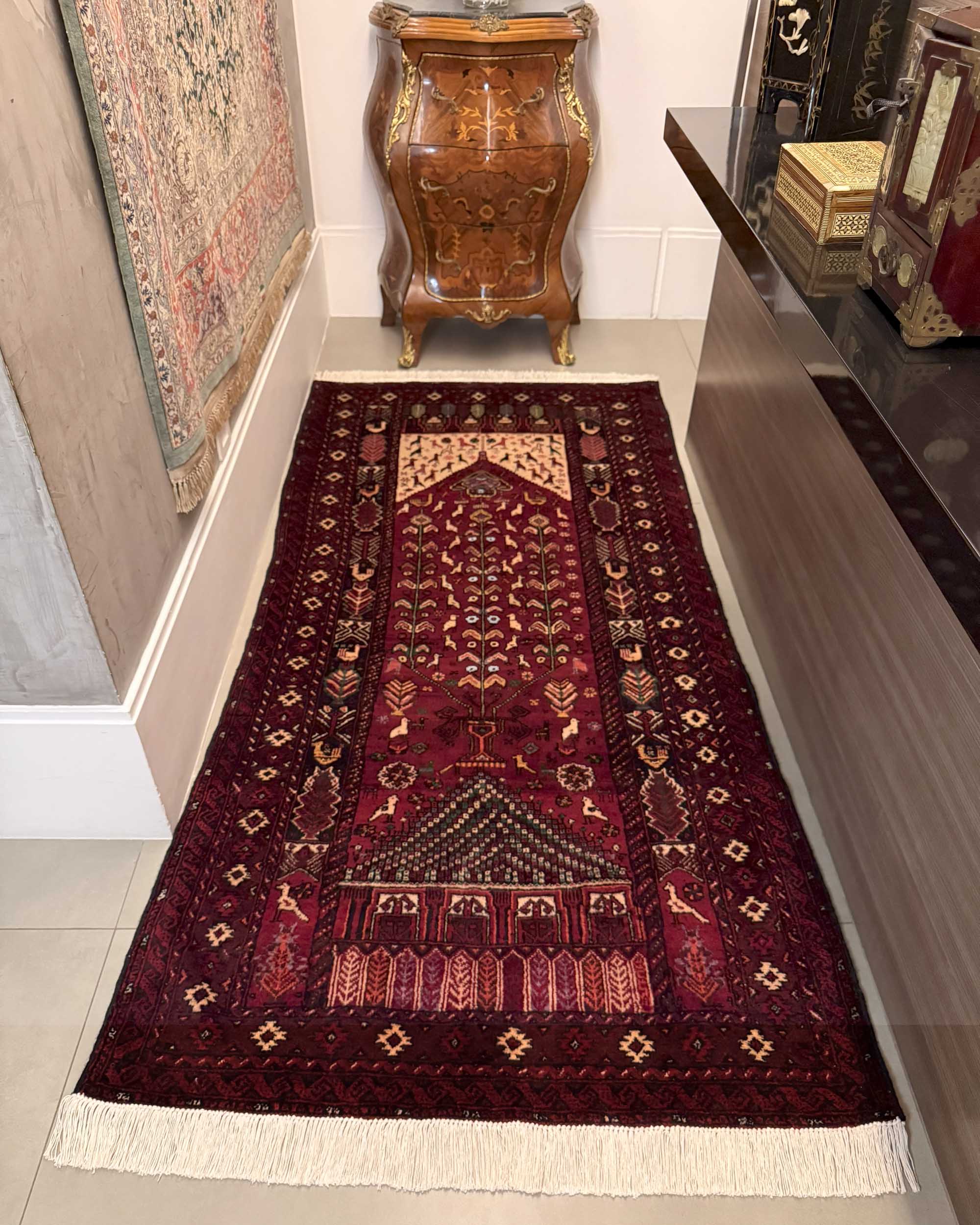 No campo central, a composição em forma de nicho (mihrab) lembra uma árvore da vida estilizada, cercada por cabras, pássaros e flores, símbolos de abundância e espiritualidade. A parte inferior apresenta uma cena arquitetônica minuciosa, quase como uma “assinatura visual” dos tecelões Beluche, trazendo ainda mais caráter colecionável à peça.