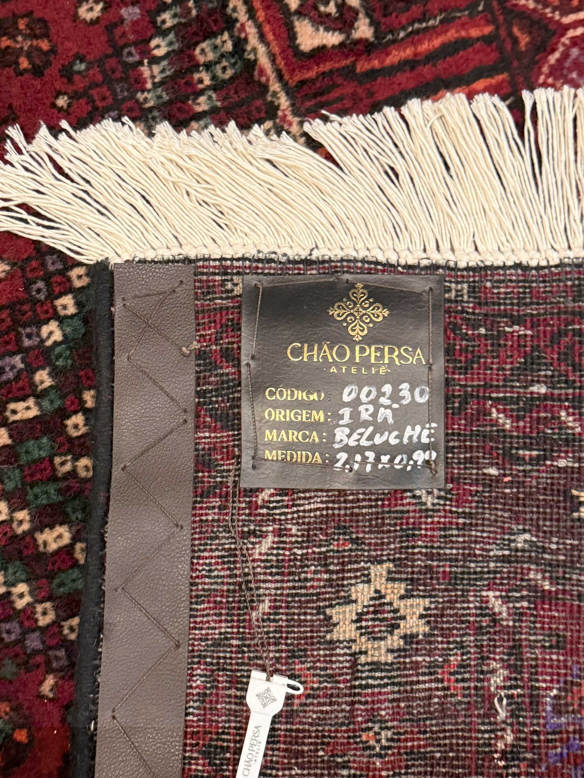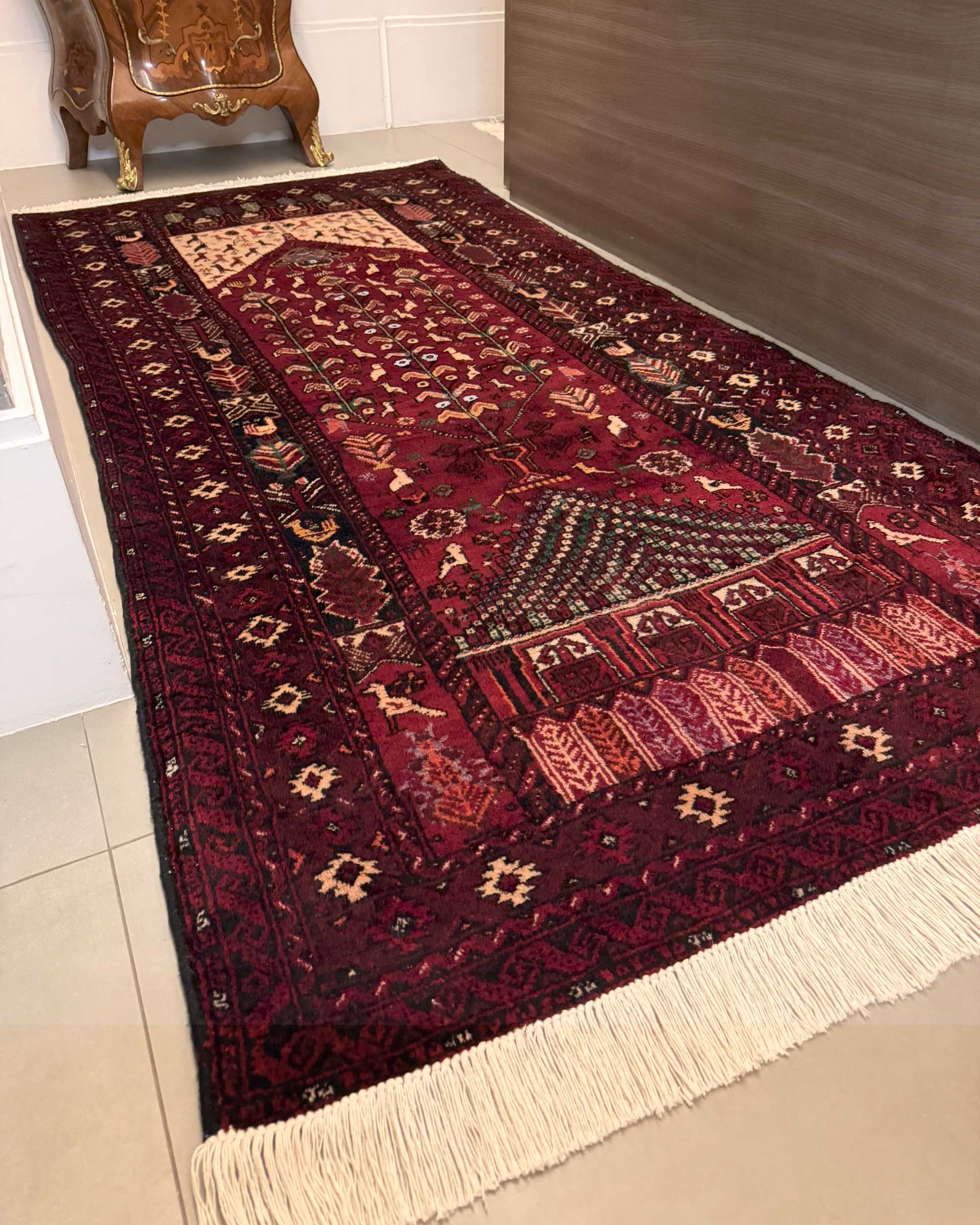Este magnífico tapete Beluche é uma raridade da tradição tribal persa, conhecido pela intensidade cromática e pela simbologia presente em seus desenhos. O fundo vermelho profundo, vibrante e acolhedor, serve como base para um intrincado painel figurativo, repleto de animais, motivos geométricos e elementos que remetem à fertilidade, proteção e prosperidade.