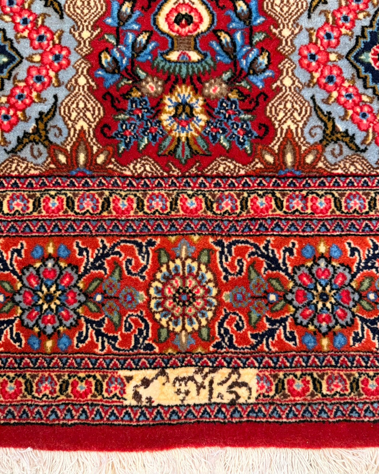 Este sofisticado tapete persa Ghom assinado representa o alto nível artístico e técnico dos ateliês tradicionais da cidade de Qom, reconhecida mundialmente pela produção de peças finíssimas, de desenho preciso e acabamento impecável.