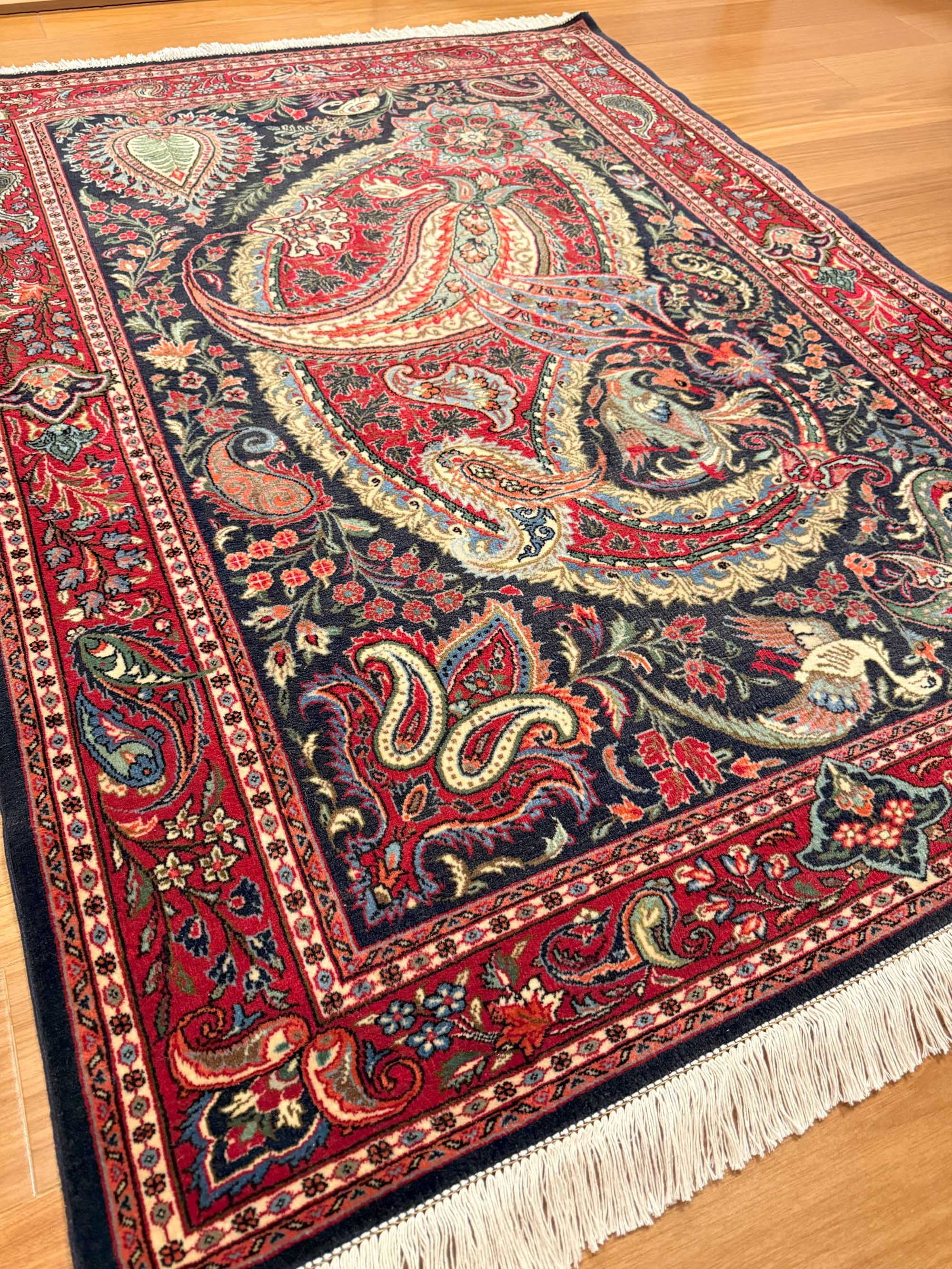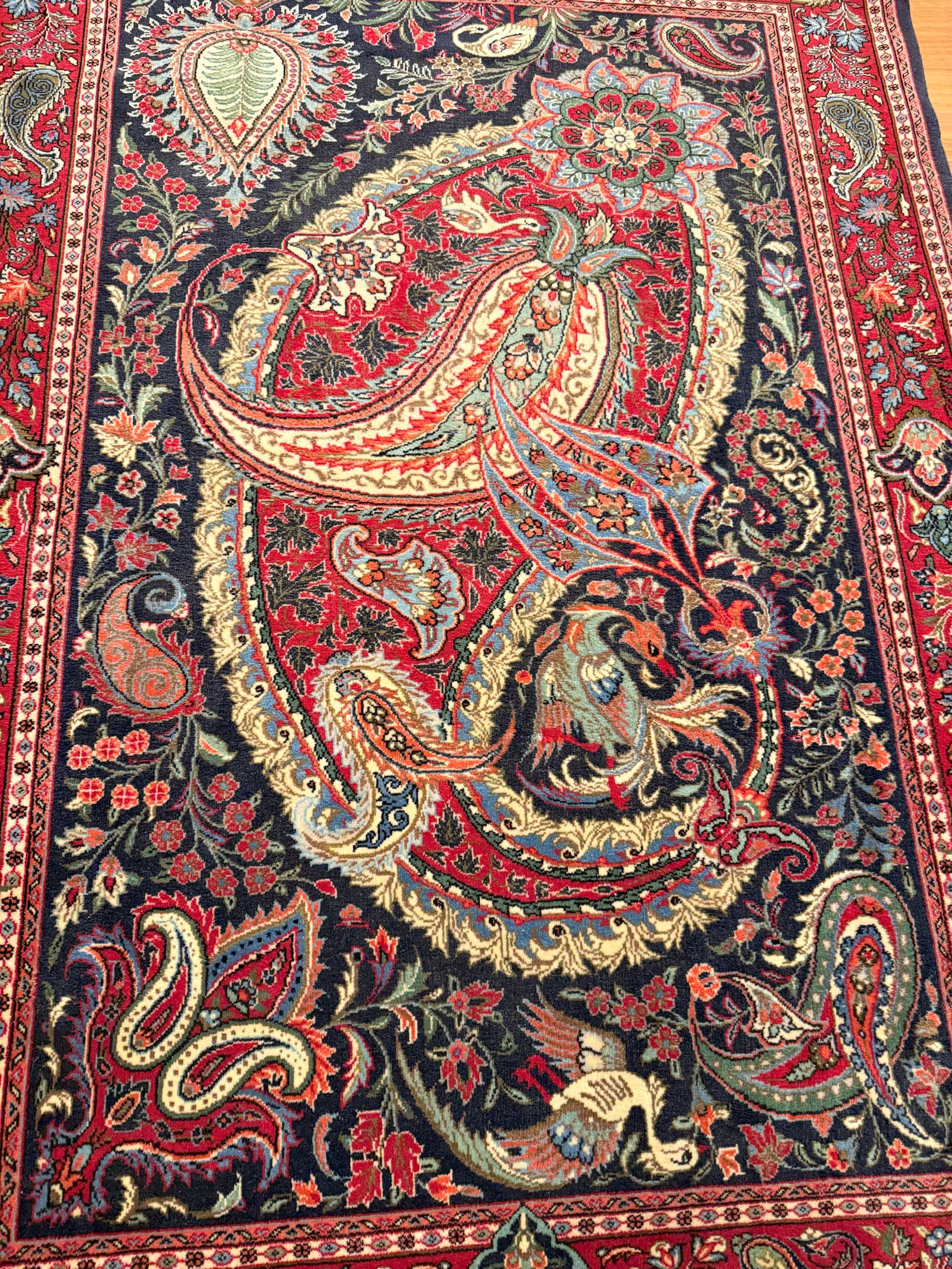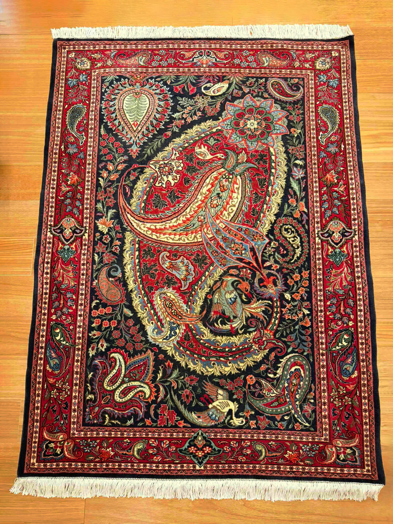 O campo exibe o imponente motivo boteh (paisley), símbolo de eternidade e prosperidade, abraçando a figura da fênix (Simurgh) – ave mitológica persa que representa a renovação e a imortalidade. O fundo negro profundo valoriza os tons em vermelho, azul, dourado e marfim, criando contraste luminoso e de rara beleza.