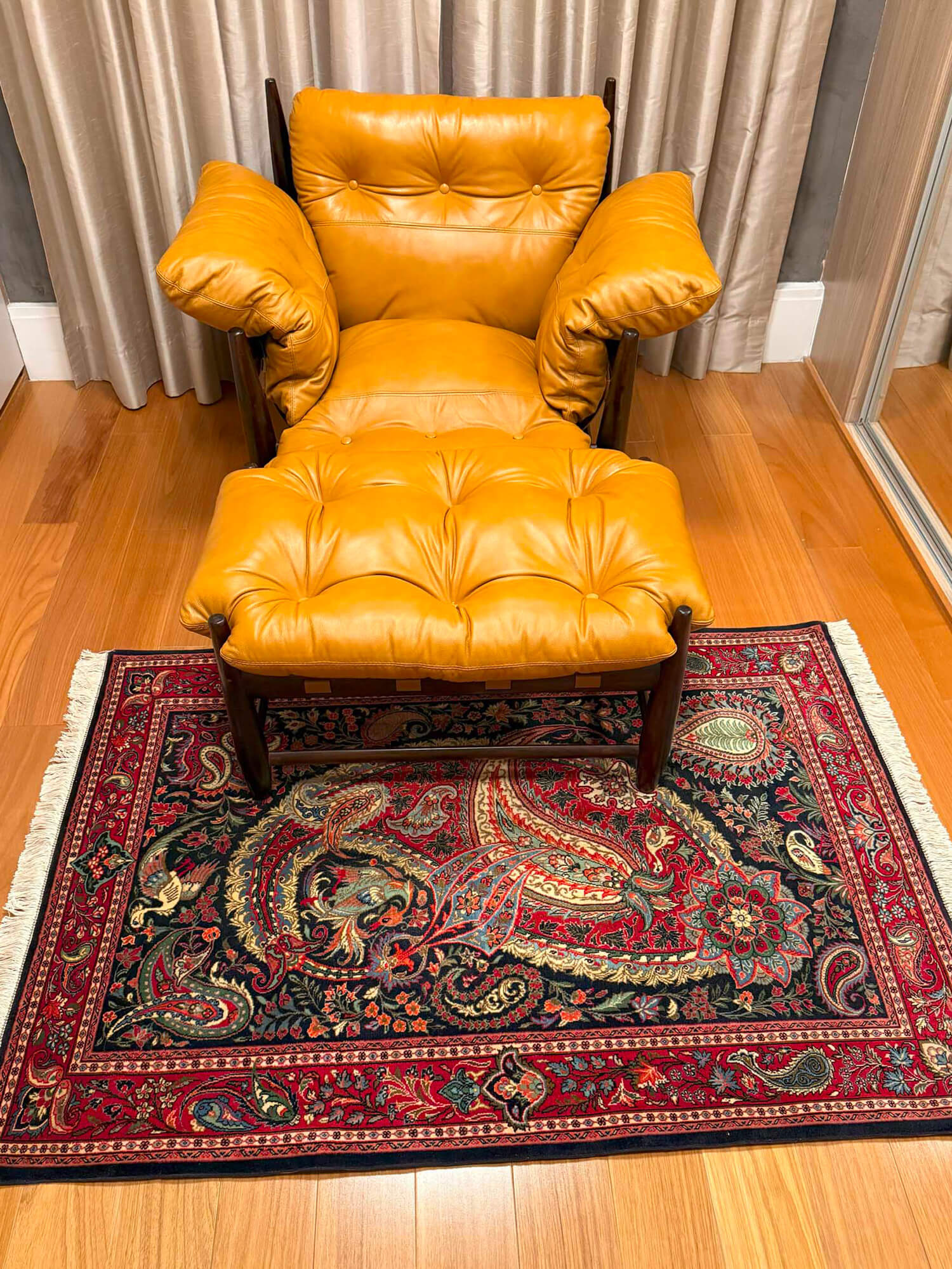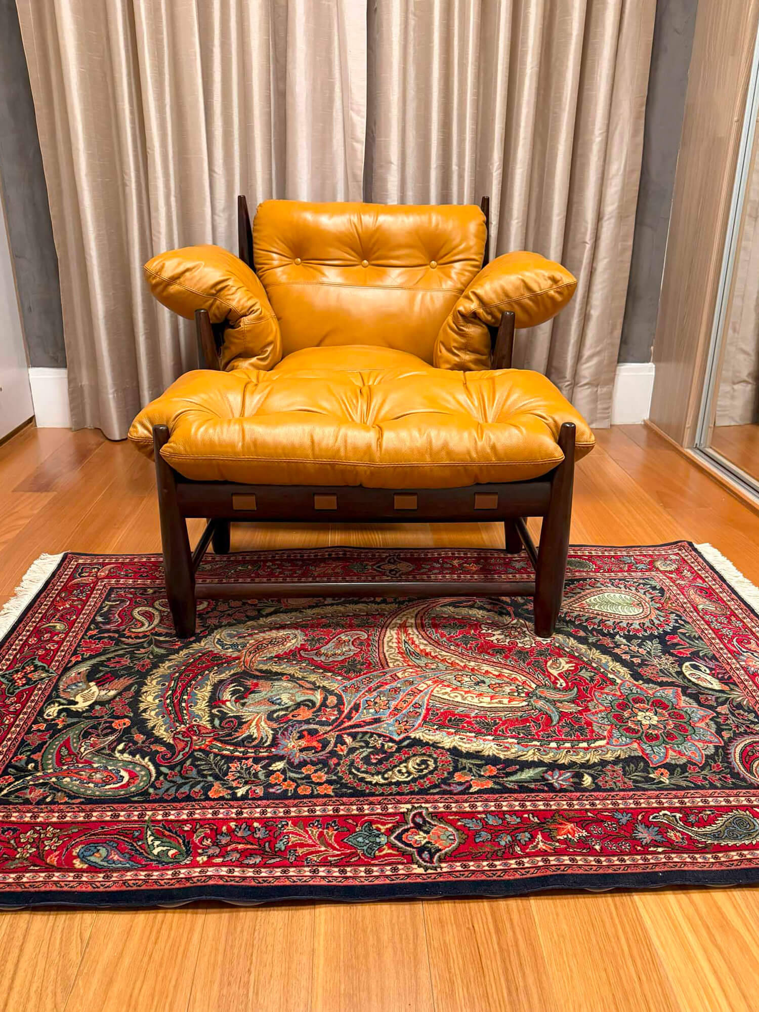 Este autêntico tapete persa Ghoum, tecelado à mão com lã de altíssima qualidade e detalhes em seda natural, traduz a sofisticação da escola de Qom, célebre pela precisão de seus desenhos e harmonia cromática.