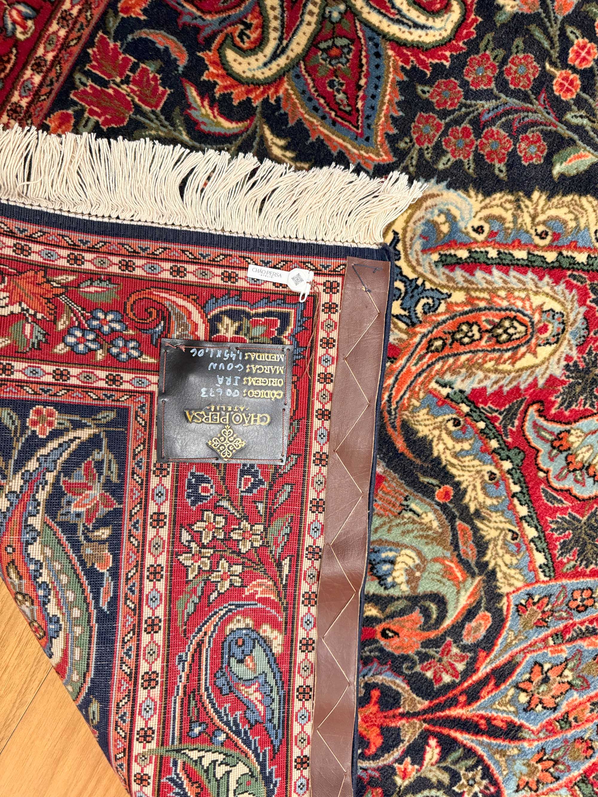 Com sua alta densidade de nós e a fusão equilibrada de lã e seda, esta peça reúne resistência, brilho e refinamento, sendo um exemplar de grande valor artístico e colecionável dentro da tapeçaria persa.