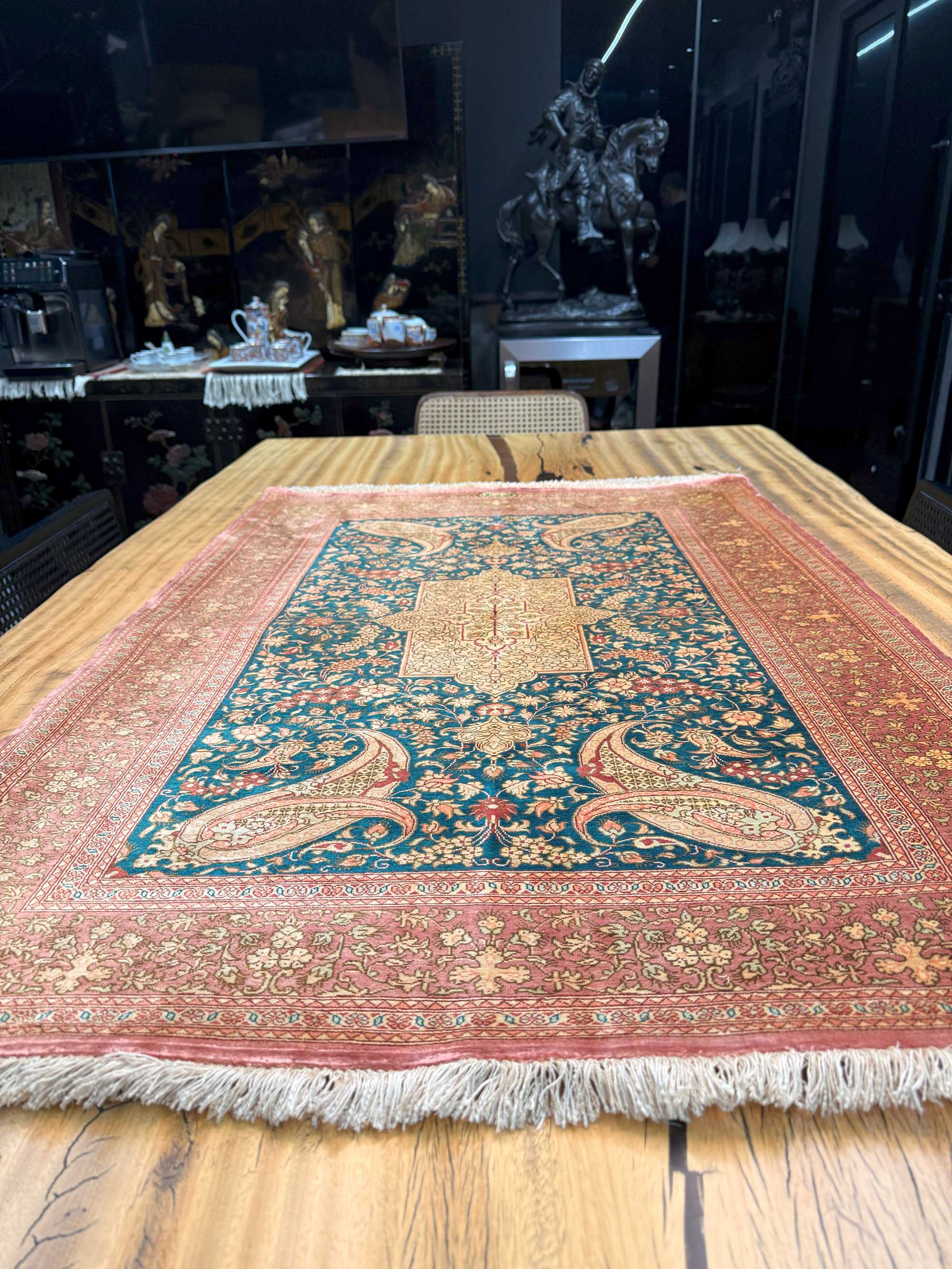 No centro, um medalhão dourado detalhado em simetria perfeita transmite imponência e sofisticação, enquanto os quatro grandes desenhos em forma de boteh (paisley) conferem identidade única e requinte. A assinatura do mestre artesão reafirma sua autenticidade e eleva ainda mais o valor artístico e colecionável desta peça.