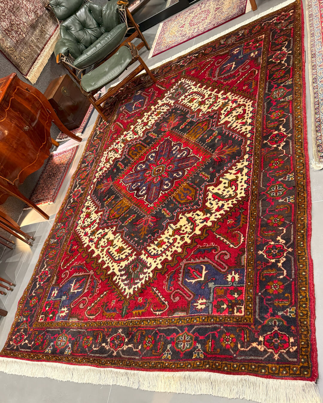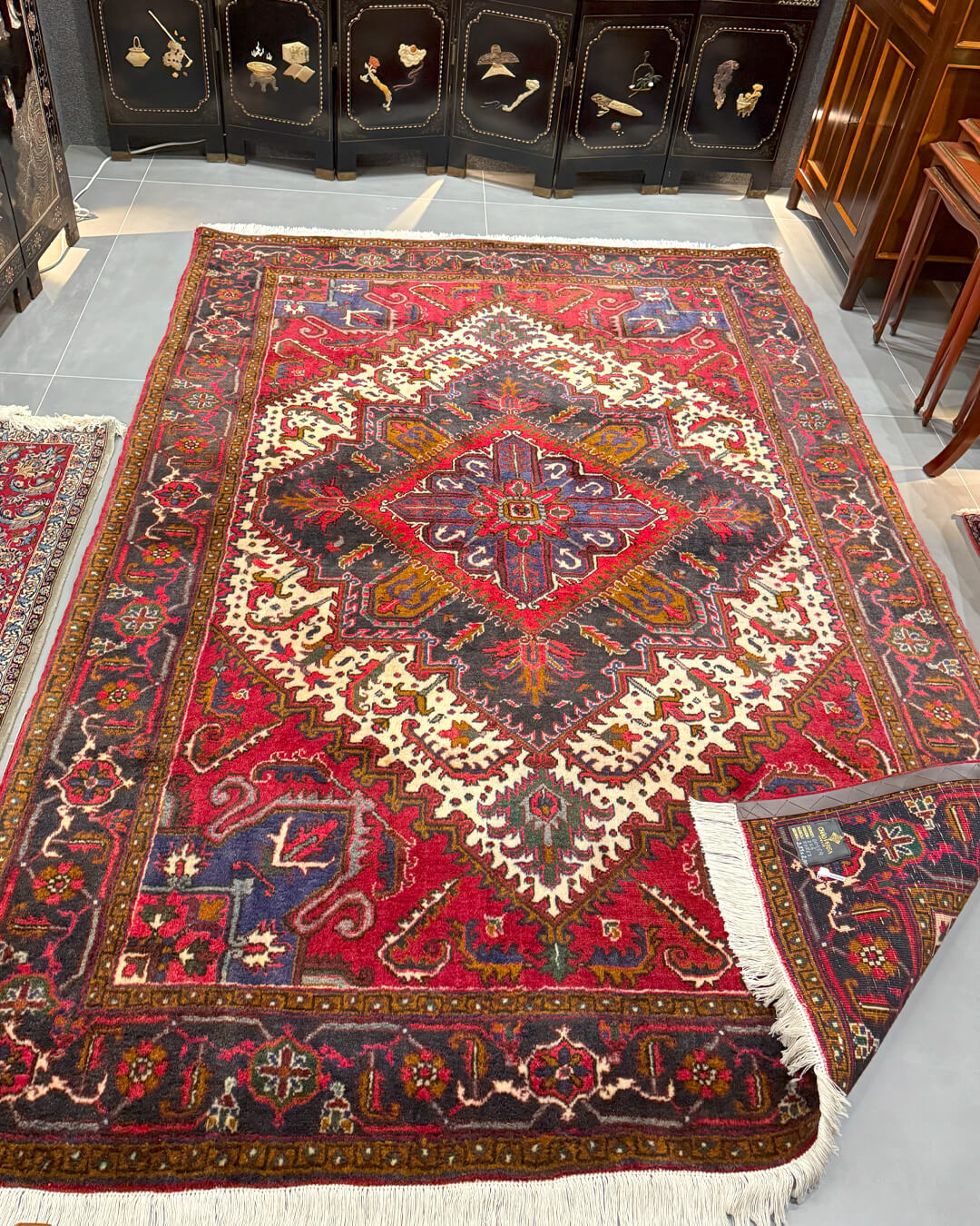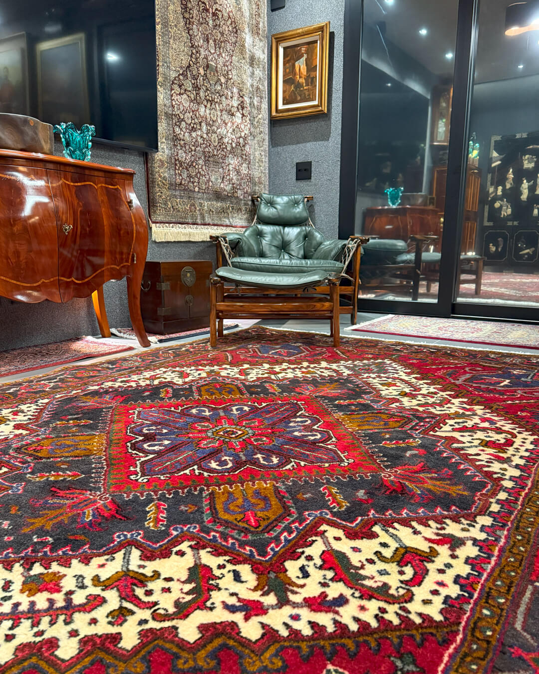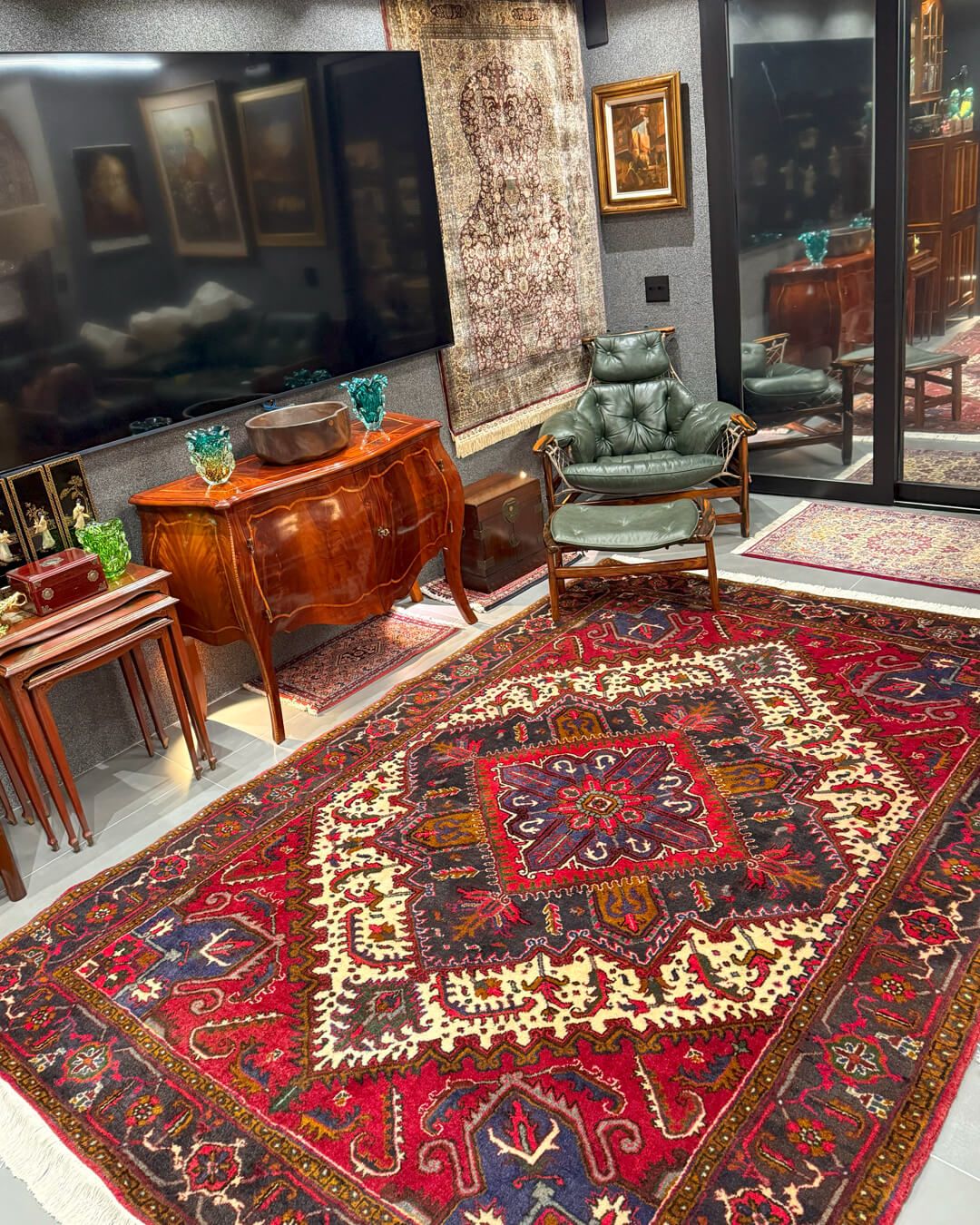 Uma autêntica joia da região tribal de Goravan, no noroeste do Irã, este tapete é um exemplar robusto e expressivo, fiel ao espírito rústico das tribos que tecem essas peças há séculos. Herdeiro direto da tradição Heriz, o Goravan traz em sua composição formas geométricas marcantes e um medalhão central poderoso, envolto por tonalidades de vermelho rubi, azul profundo, marfim e vinho queimado.