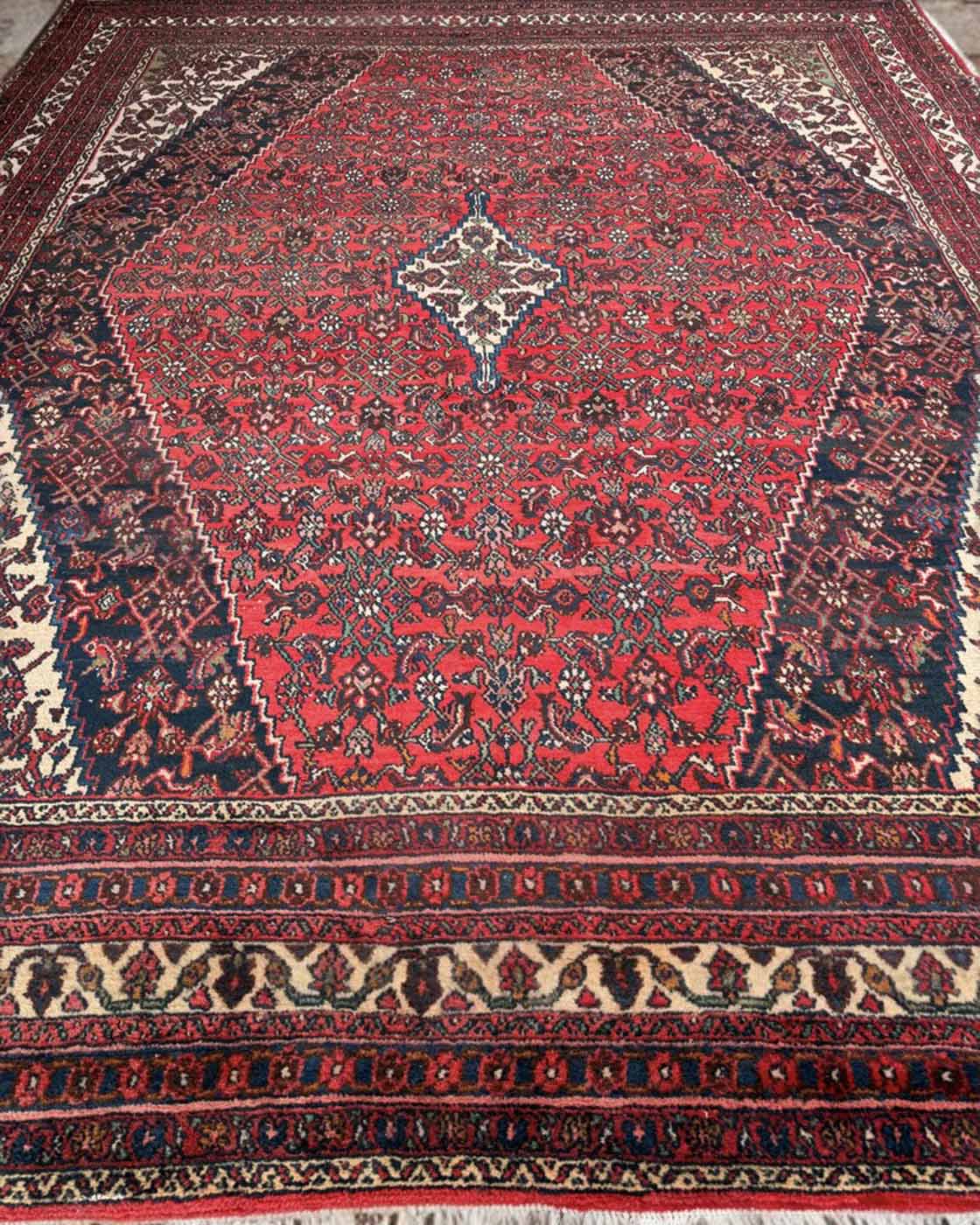 Seu campo vermelho profundo, ricamente preenchido por motivos geométrico-florais e medalhão central característico, cria um visual clássico, acolhedor e imponente. A amplaHoussinabad borda marfim equilibra a composição e valoriza ainda mais a dimensão da peça.