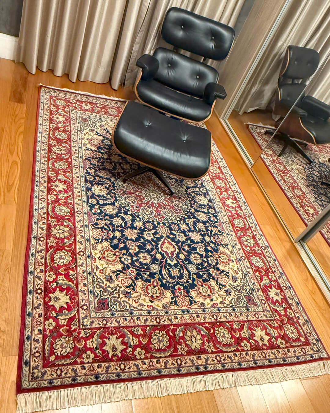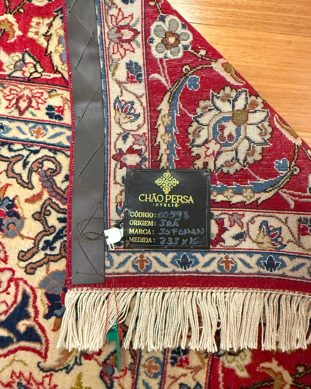 O tapete Isfahan representa uma das mais nobres tradições da tapeçaria iraniana. Produzido na histórica cidade de Isfahan, conhecida por sua arquitetura deslumbrante e refinamento artístico, este exemplar é tecido à mão com lã kurda de altíssima qualidade e detalhes em seda natural, conferindo brilho e precisão ao desenho.