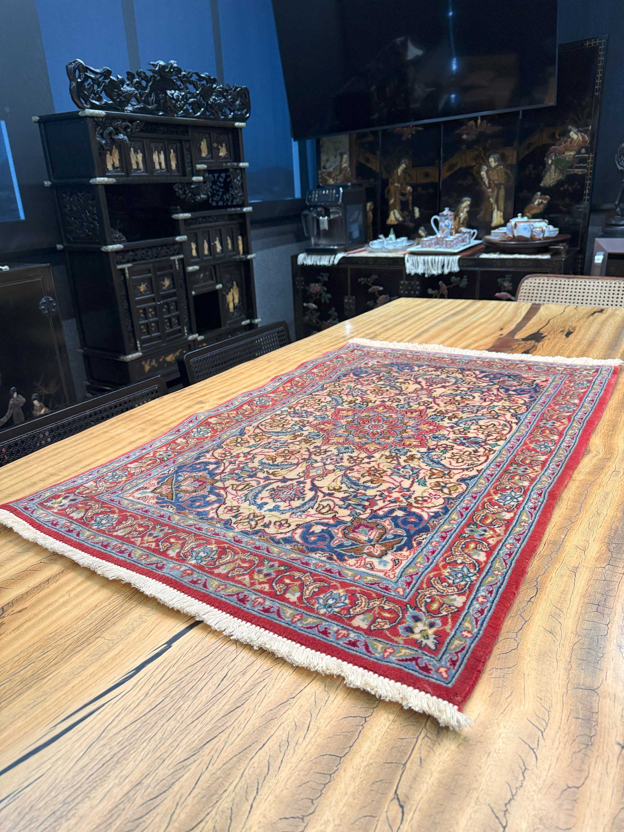 Tecelado à mão com lã de altíssima qualidade e detalhes em seda, este exemplar reúne brilho, leveza e riqueza de detalhes típicos da escola de Isfahan. A densidade de nós, aliada ao equilíbrio entre cores e formas, revela um trabalho minucioso, digno de coleção.