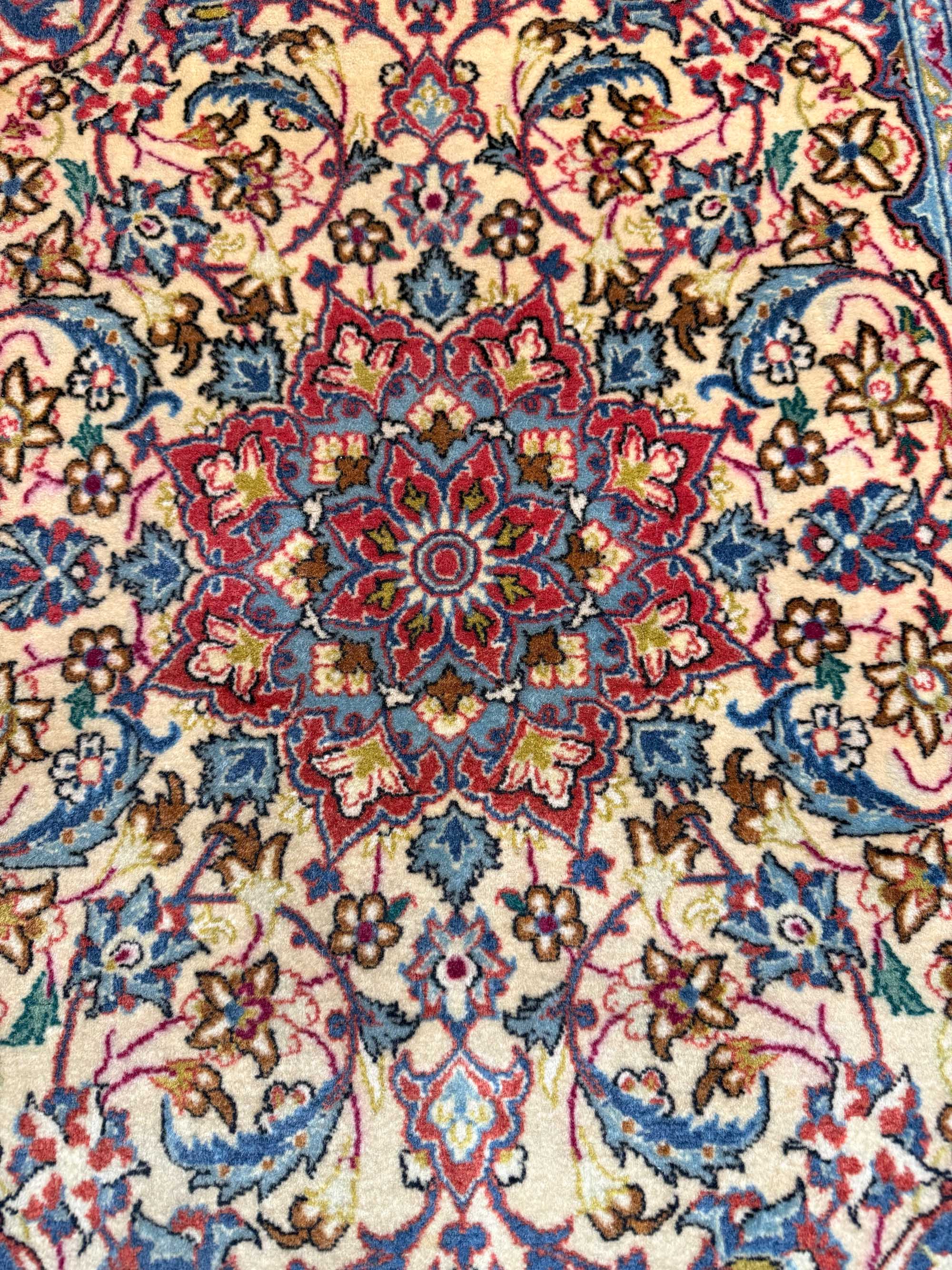 Este refinado Isfahan persa traduz a perfeição da tapeçaria iraniana. O desenho é organizado a partir de um medalhão central floral em vermelho intenso, que se expande em harmoniosas ramagens sobre o fundo marfim. A borda em azul e vermelho, ricamente ornamentada com flores e arabescos, cria uma moldura imponente e de grande contraste cromático.