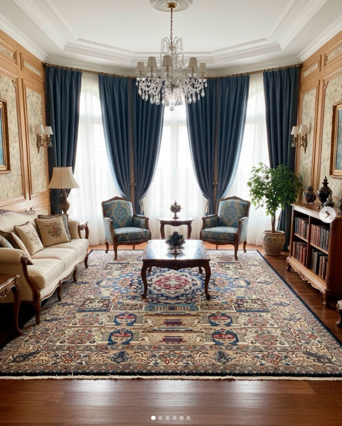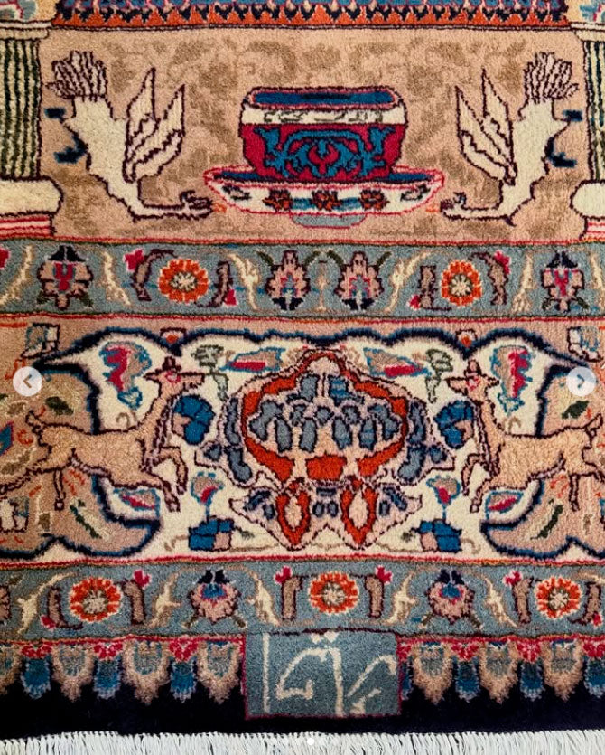 O campo central em azul profundo abriga um medalhão clássico persa, cercado por uma riquíssima cena figurativa composta por palácios, colunas, jardins, animais, pássaros e elementos da vida cortesã. Cada painel do desenho conta uma história diferente, como se o tapete fosse um manuscrito ilustrado tecido em lã.