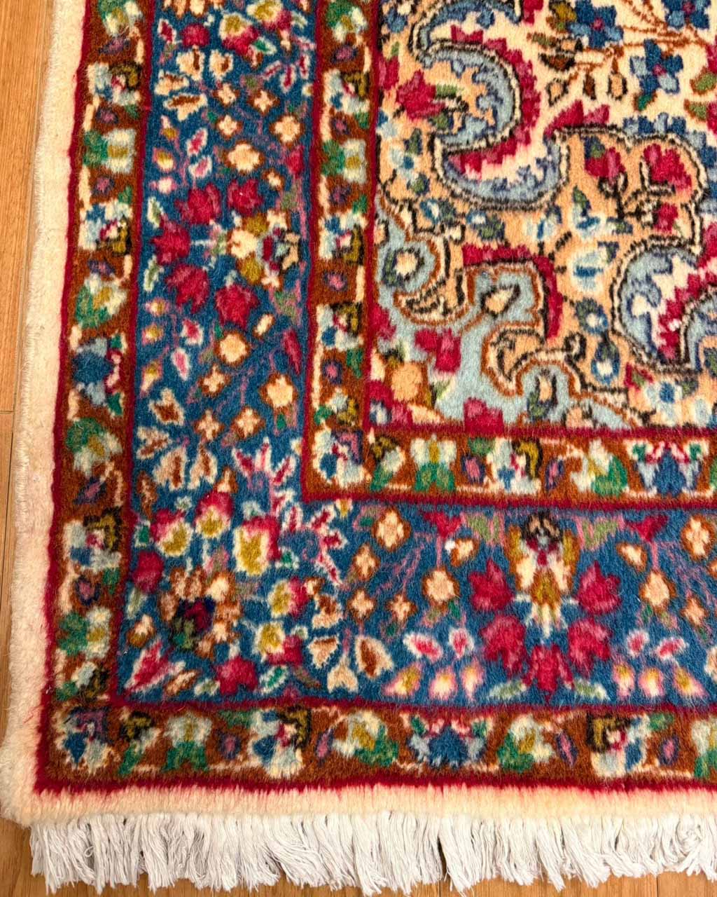 Este refinado Kirman apresenta o clássico medalhão radial em forma de estrela, típico das melhores oficinas da região. A paleta vibrante — azul safira, vermelho rubi, verde esmeralda e marfim — cria profundidade e luminosidade, destacando o desenho minucioso composto por flores persas, arabescos e curvas harmoniosas. Trata-se de um Kirman elegante, alegre e extremamente decorativo, perfeito para salas, halls e ambientes com estética clássica ou contemporânea.