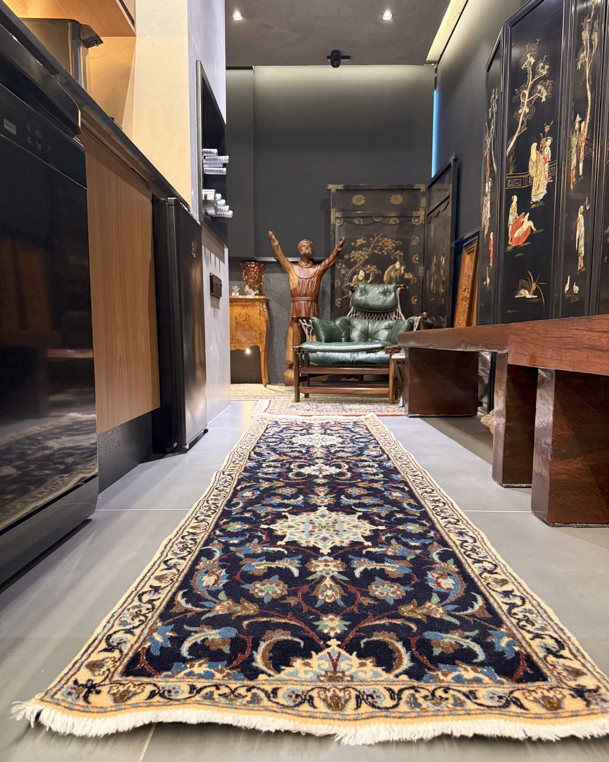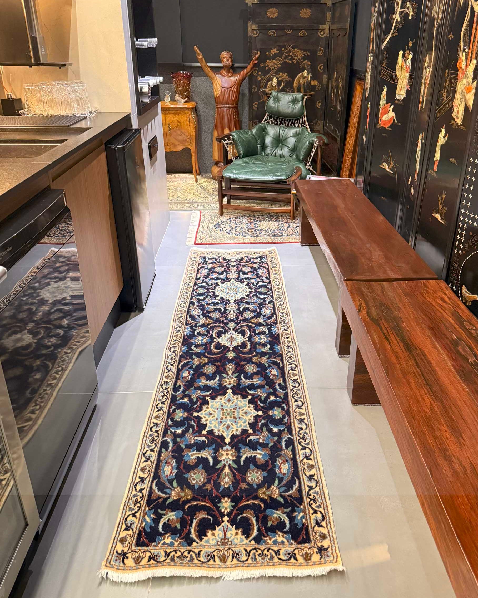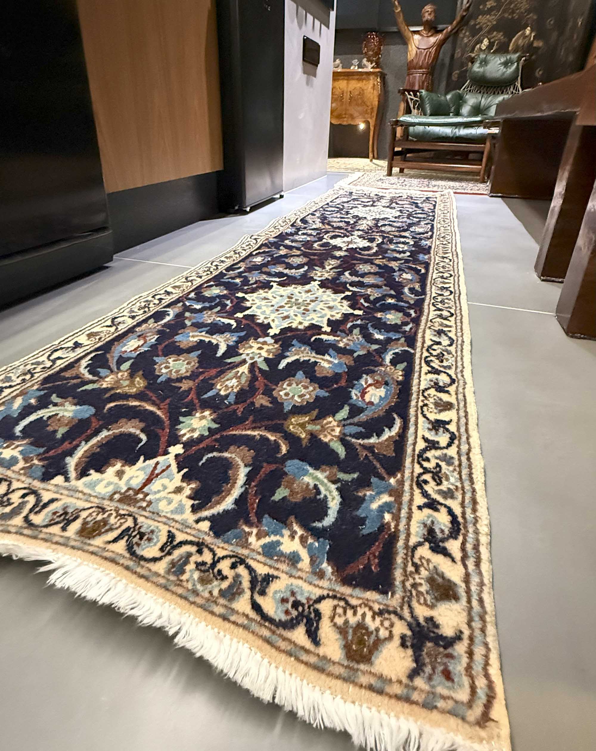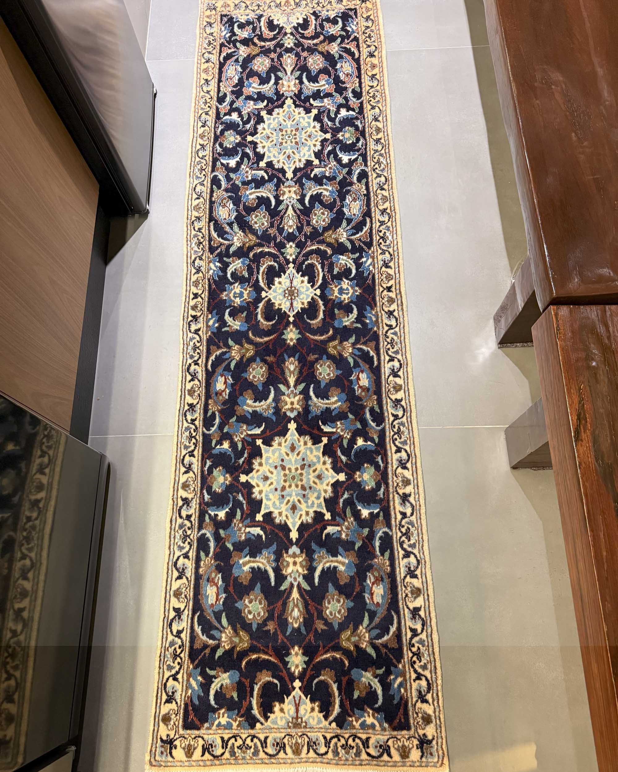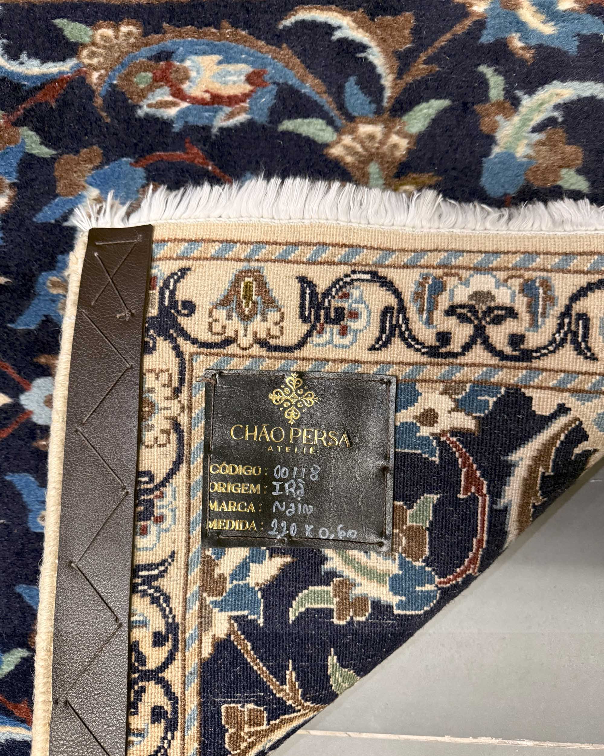 O Nain é considerado um dos tapetes persas mais sofisticados, admirado pela sua harmonia cromática e riqueza de detalhes. Este exemplar apresenta um fundo em azul-marinho profundo, que simboliza nobreza e serenidade, sobre o qual florescem arabescos delicados em bege, azul-claro, marfim e verde suave. O medalhão central em forma estrelada remete ao equilíbrio geométrico característico da escola de Nain.