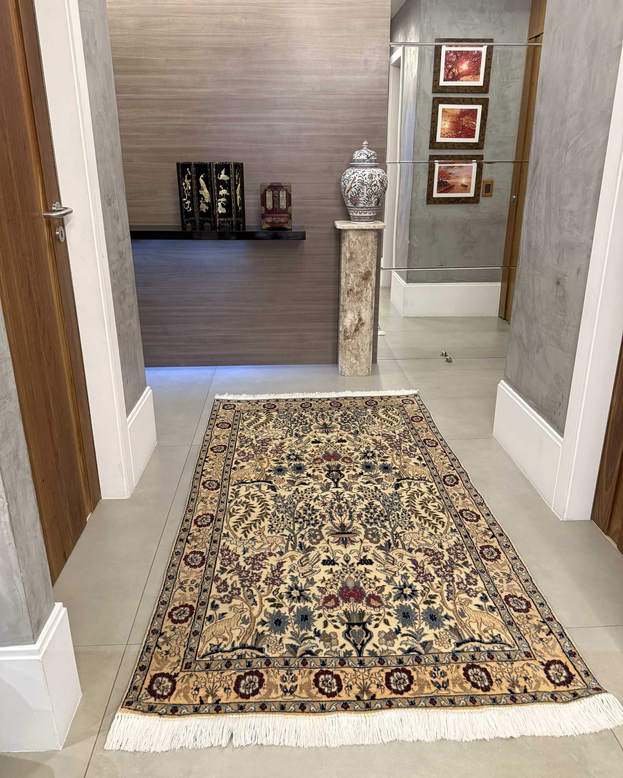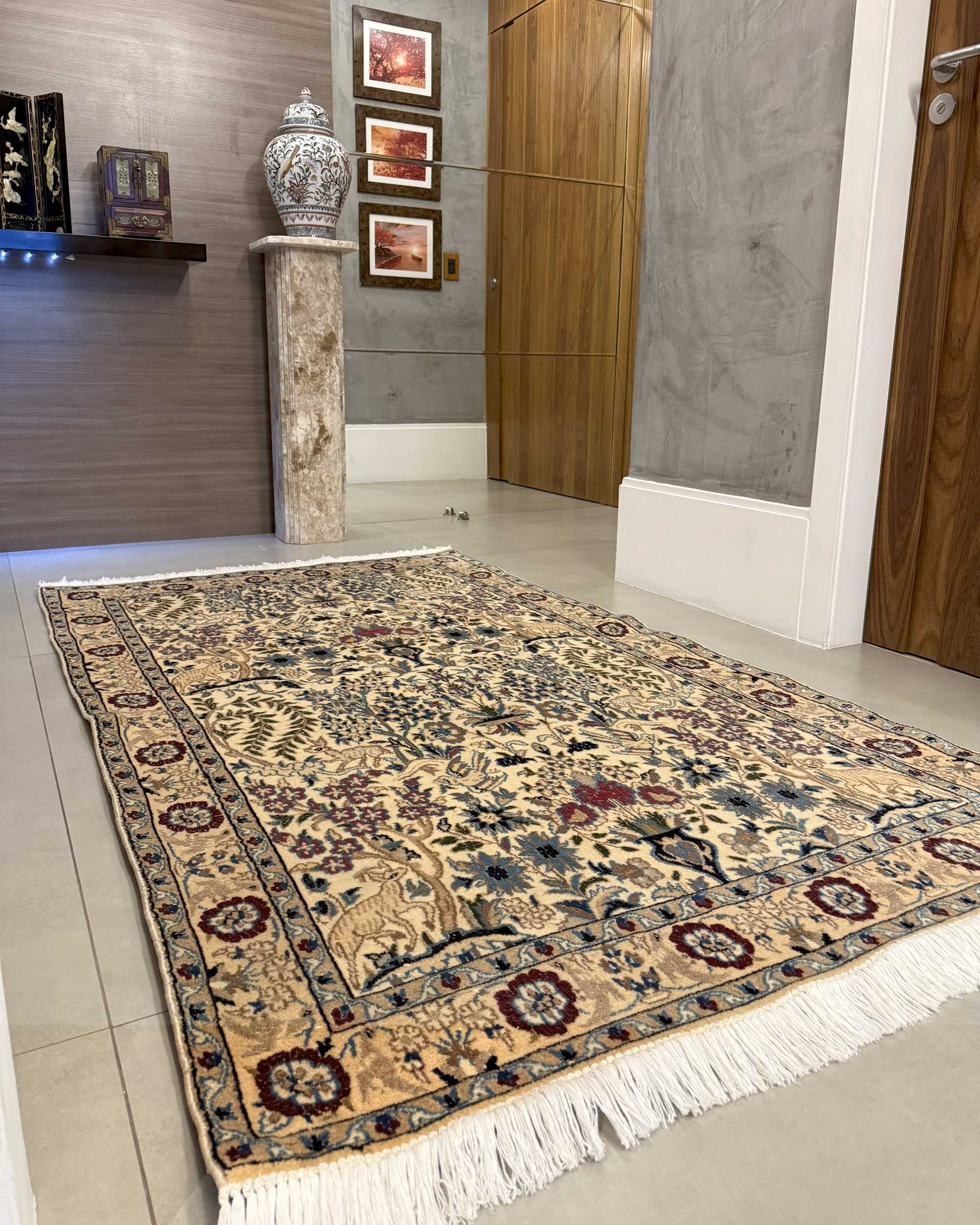 Este raro Nain Persa é uma verdadeira obra de arte têxtil, trazendo em sua composição o tema da Árvore da Vida, um dos motivos mais simbólicos da tapeçaria oriental. Tecelado à mão com altíssima precisão, o campo em marfim contrasta harmoniosamente com os desenhos em azul-marinho, vinho e verde-oliva, revelando pássaros, cervos e flores que representam fertilidade, harmonia e continuidade da vida.