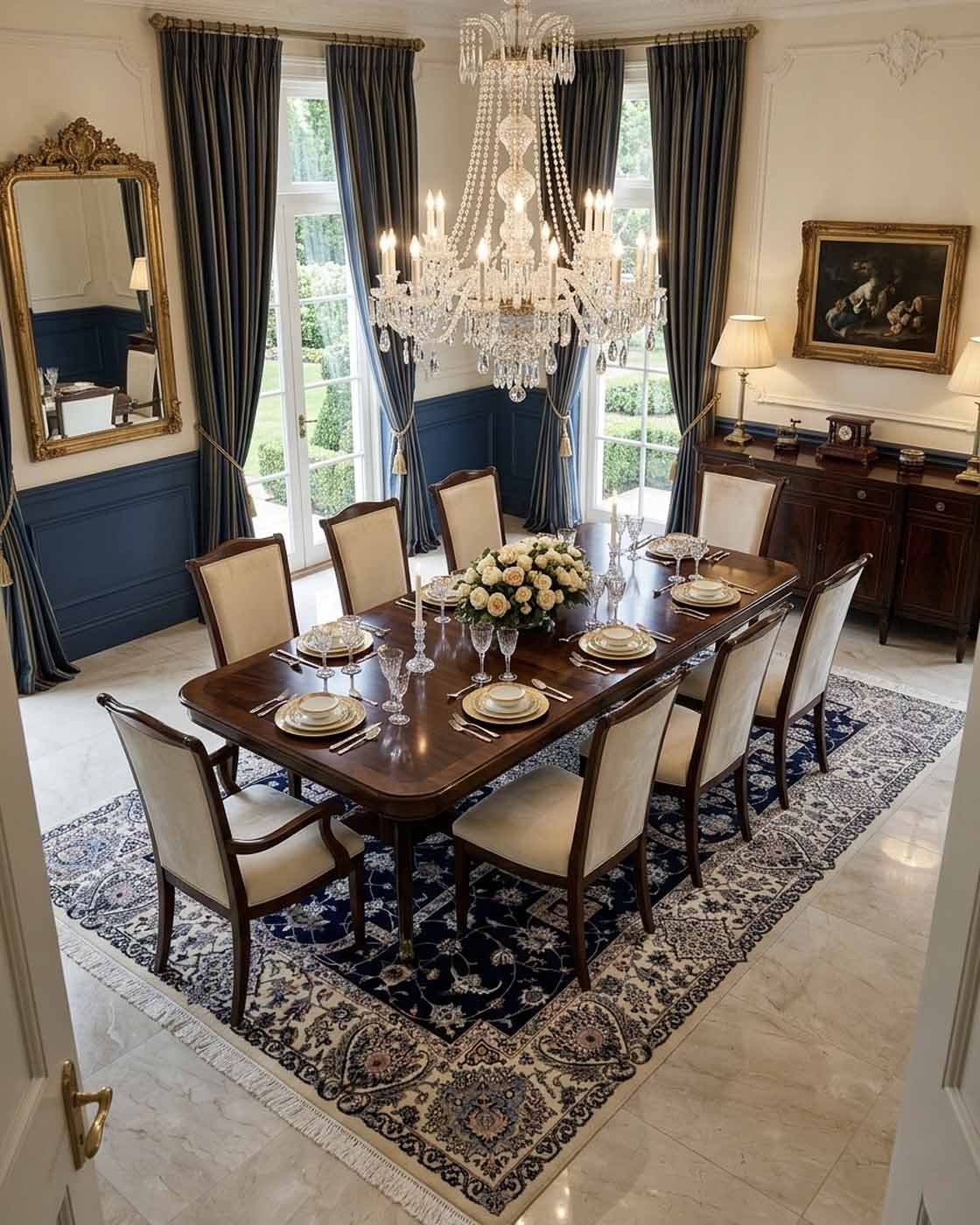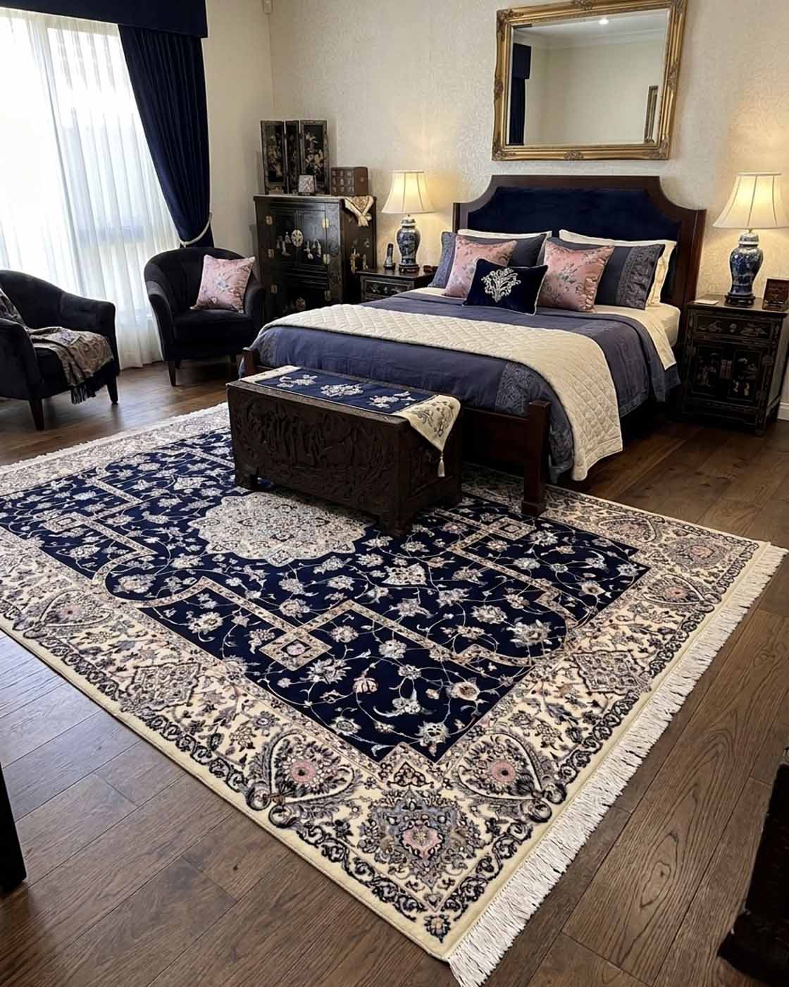 A composição apresenta o clássico medalhão central ricamente ornamentado, rodeado por delicados arabescos florais inspirados nos tradicionais jardins persas. O campo azul-marinho profundo cria contraste elegante com a borda marfim, destacando com precisão cada detalhe do desenho.