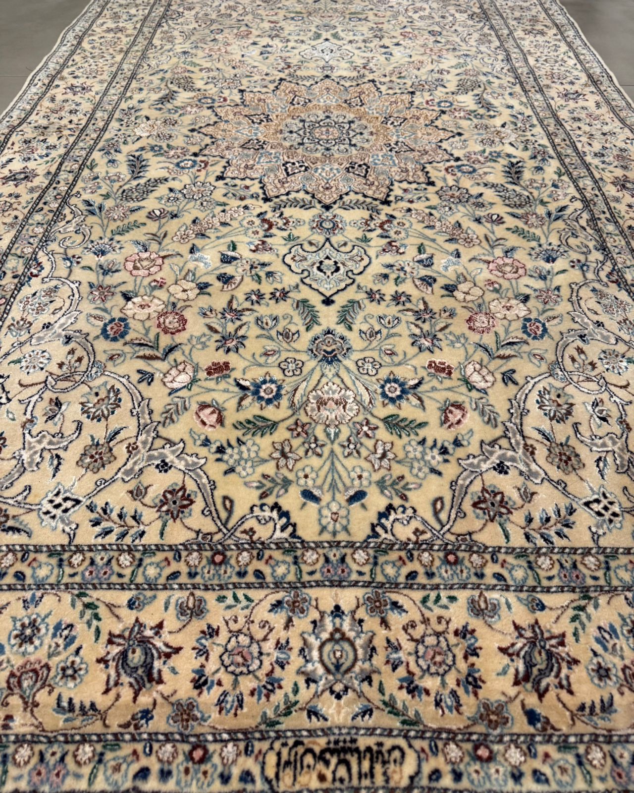 Este exemplar assinado carrega a marca de autenticidade e excelência que só obras desse ateliê podem oferecer. Os desenhos apresentam a sofisticação clássica de Nain: medalhão central em marfim e azul, arabescos florais minuciosos e a harmonia perfeita entre lã de altíssima qualidade e seda natural, que confere luminosidade e delicadeza ao desenho.
