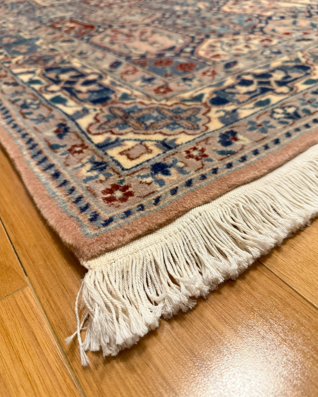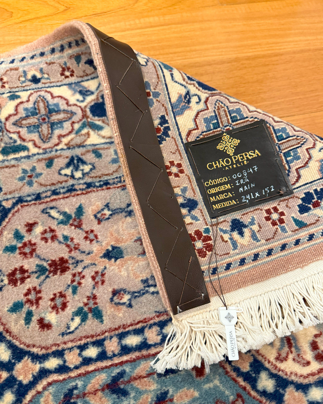 Originário da cidade de Nain, próxima a Isfahan, este tapete representa a excelência da tapeçaria persa. Com altíssima densidade de nós e tons suaves, como azul claro, vinho, bege rosado e marfim, destaca-se pelo desenho simétrico de medalhões florais inspirados nos clássicos jardins persas.