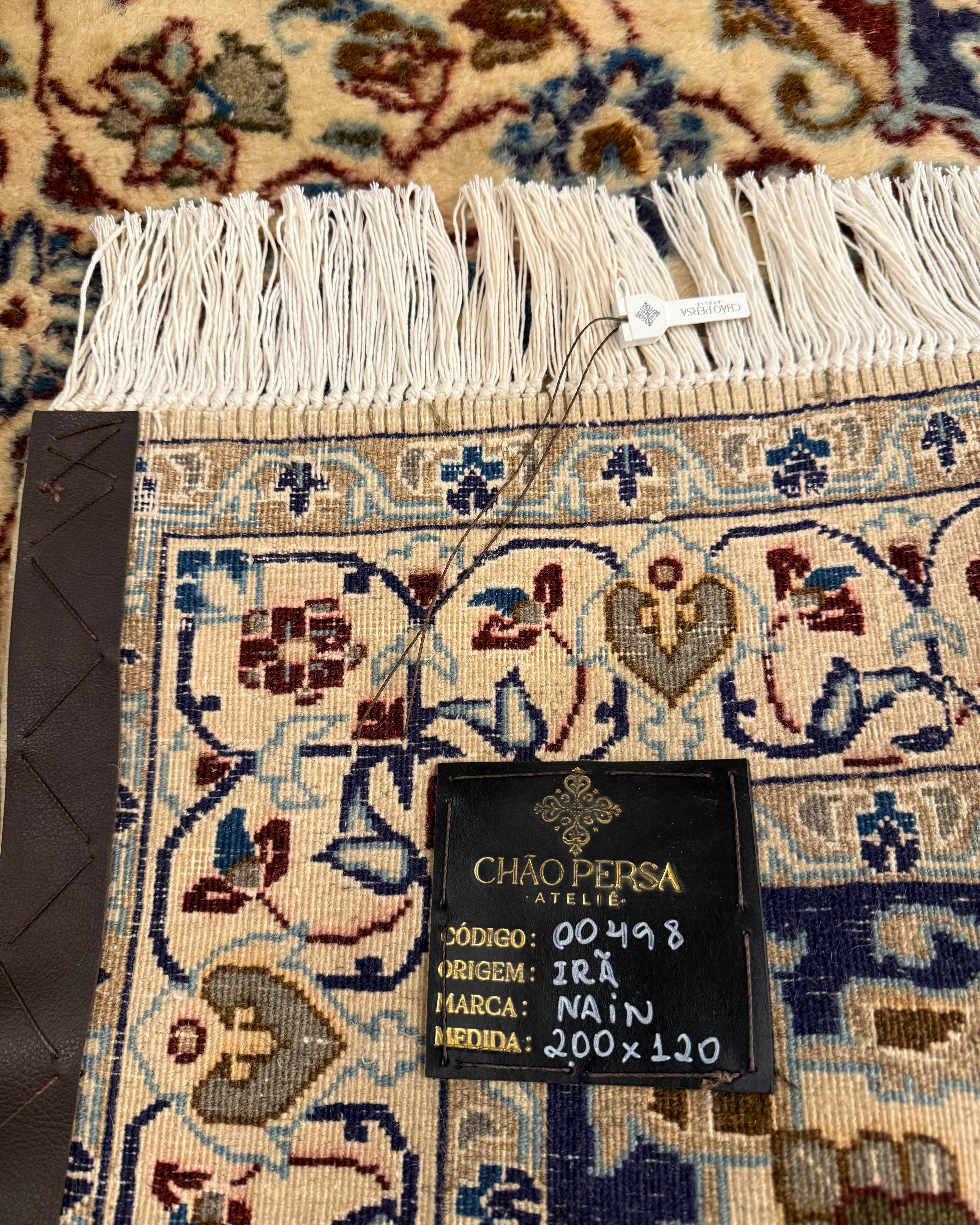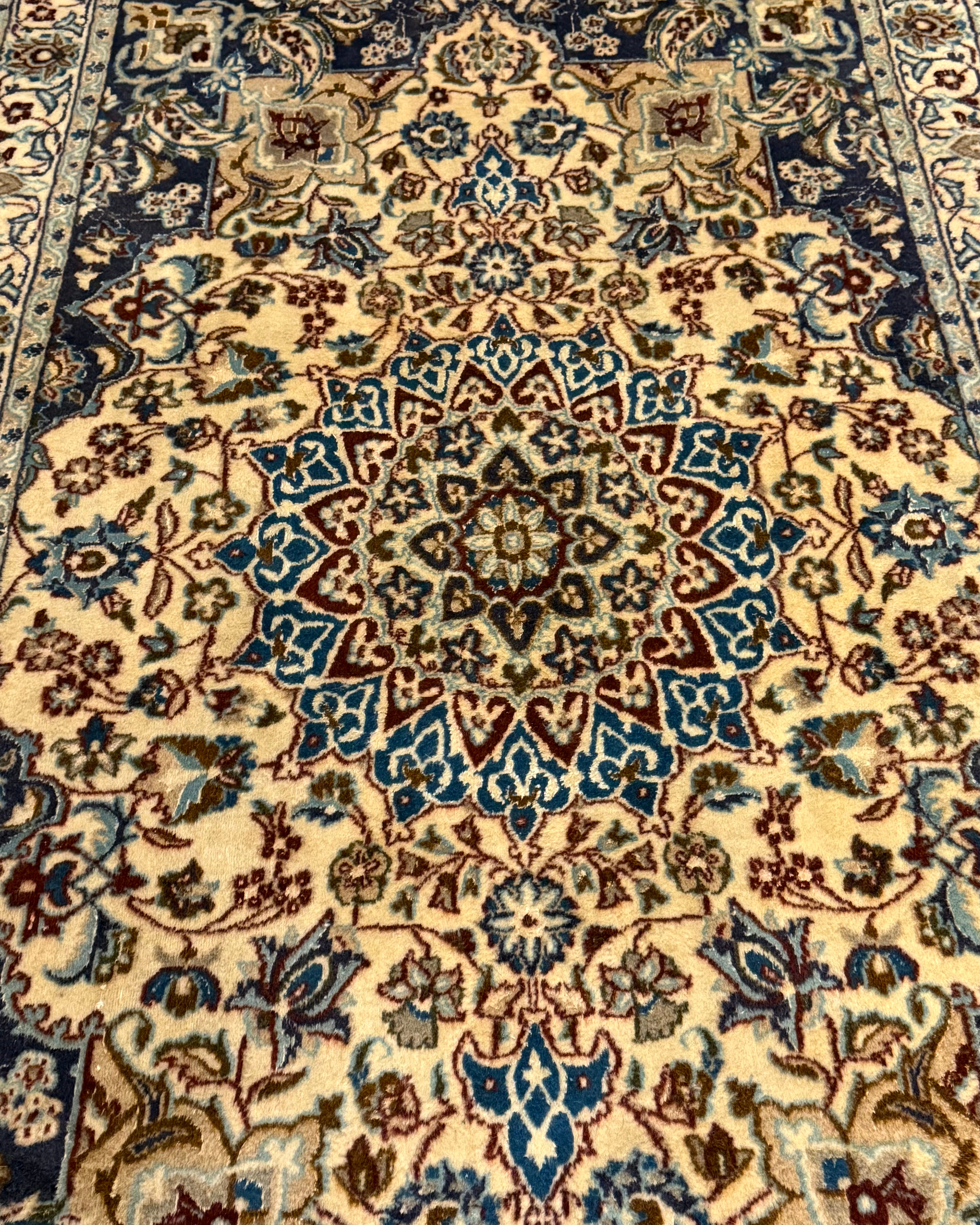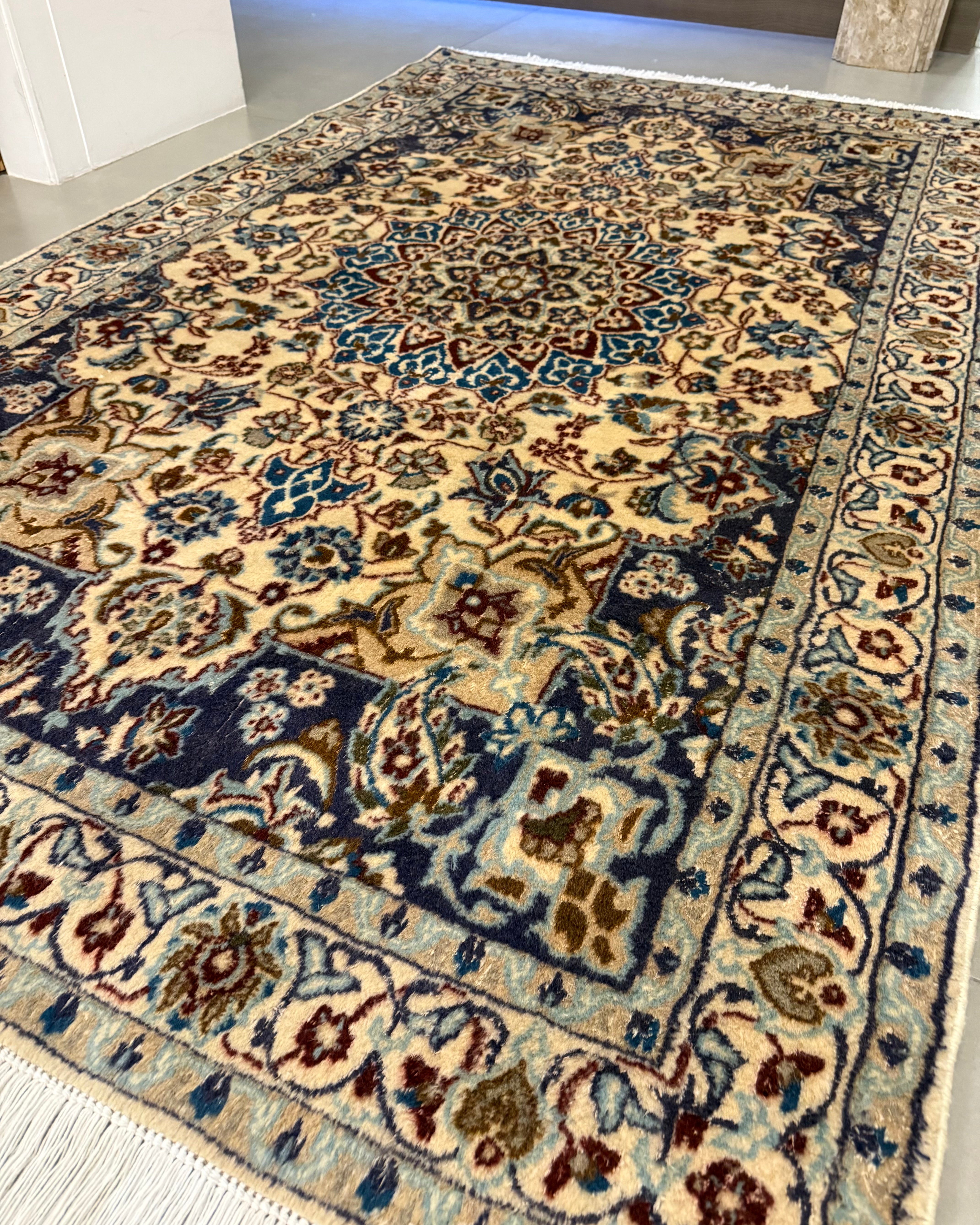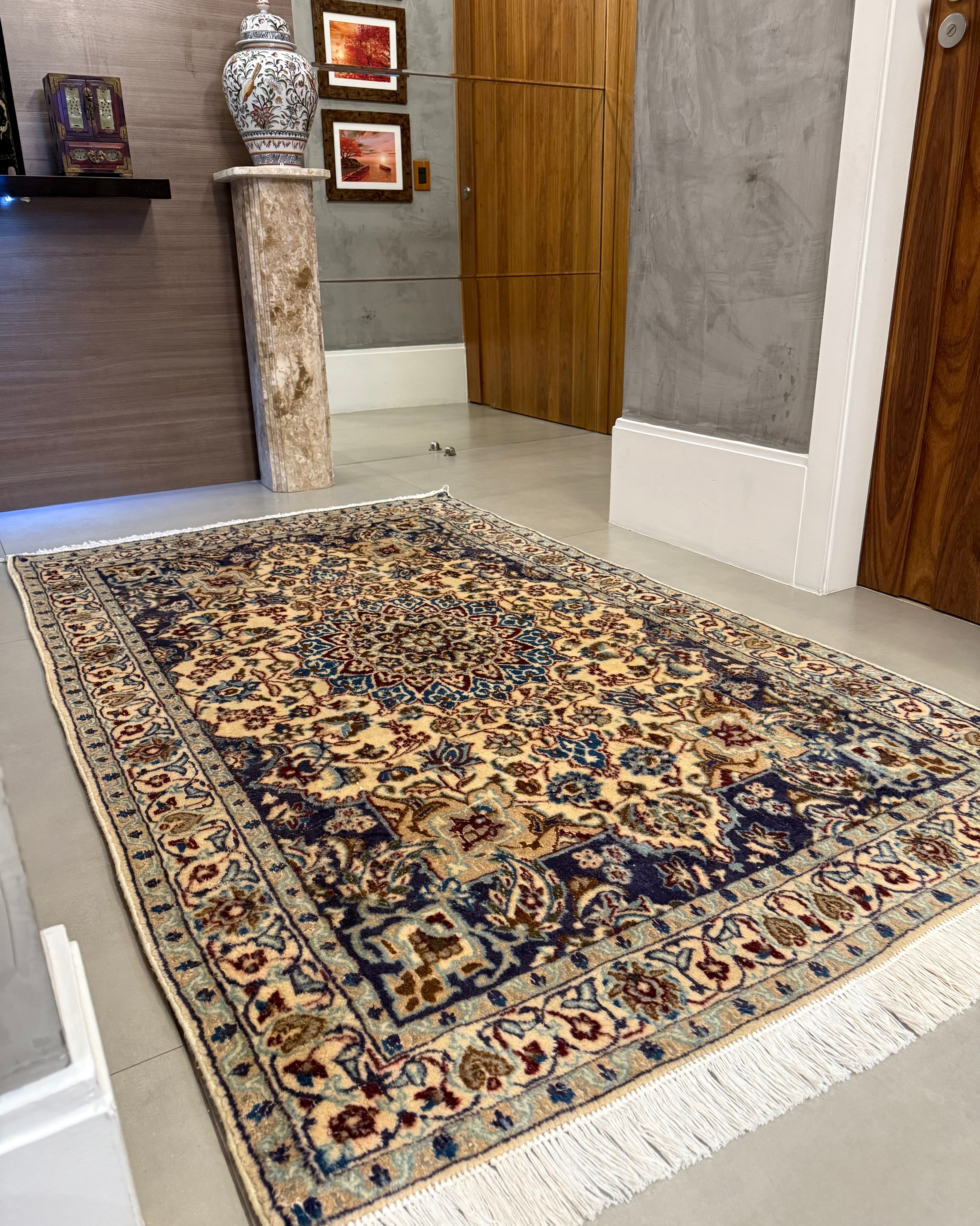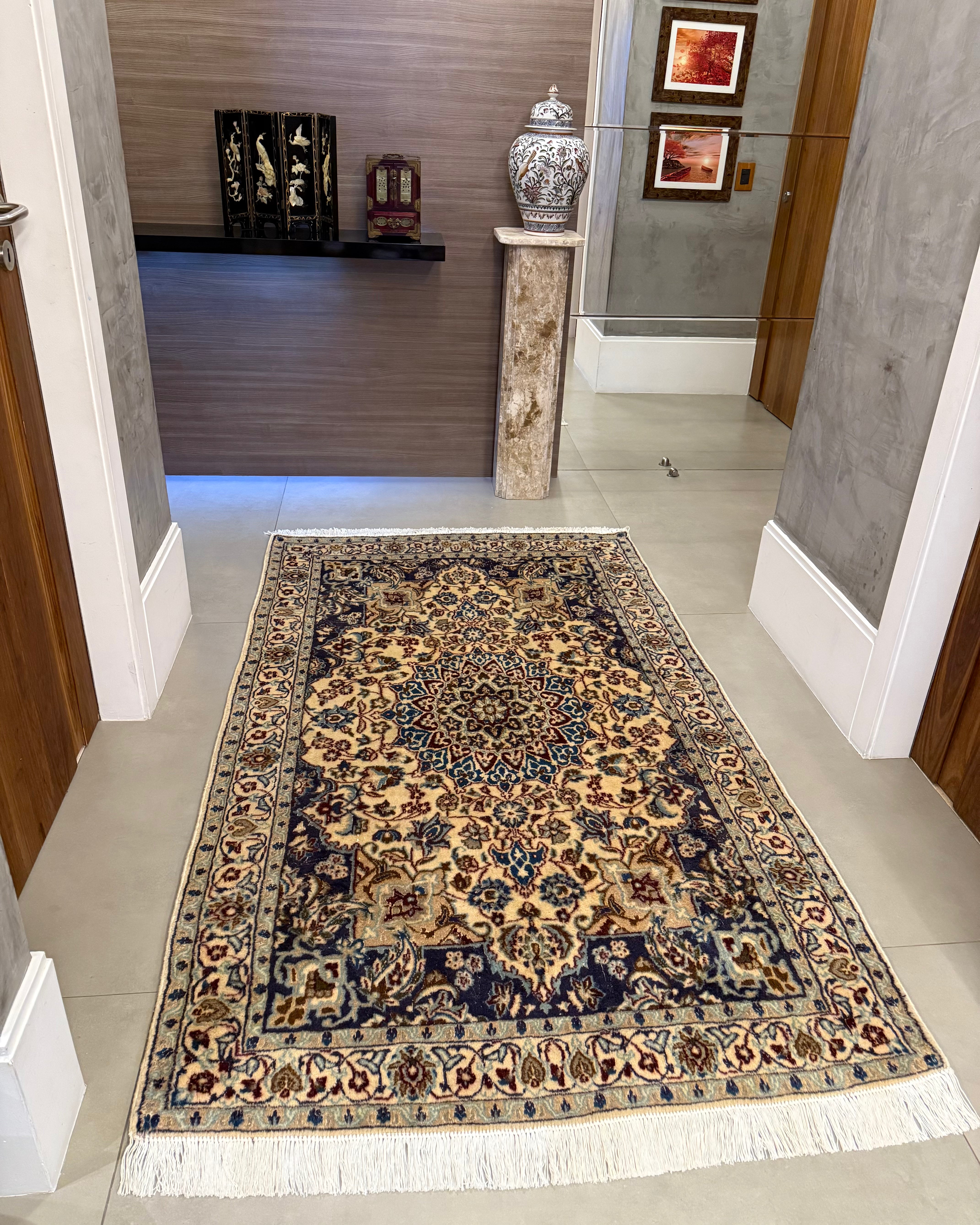 Este refinado exemplar da escola de Nain apresenta toda a sofisticação da tapeçaria persa. O medalhão central em azul profundo e turquesa se destaca sobre o campo marfim, criando um contraste elegante e harmônico. Os motivos florais minuciosos, entrelaçados em arabescos simétricos, refletem a tradição de Nain em produzir peças de altíssimo detalhamento e equilíbrio estético.