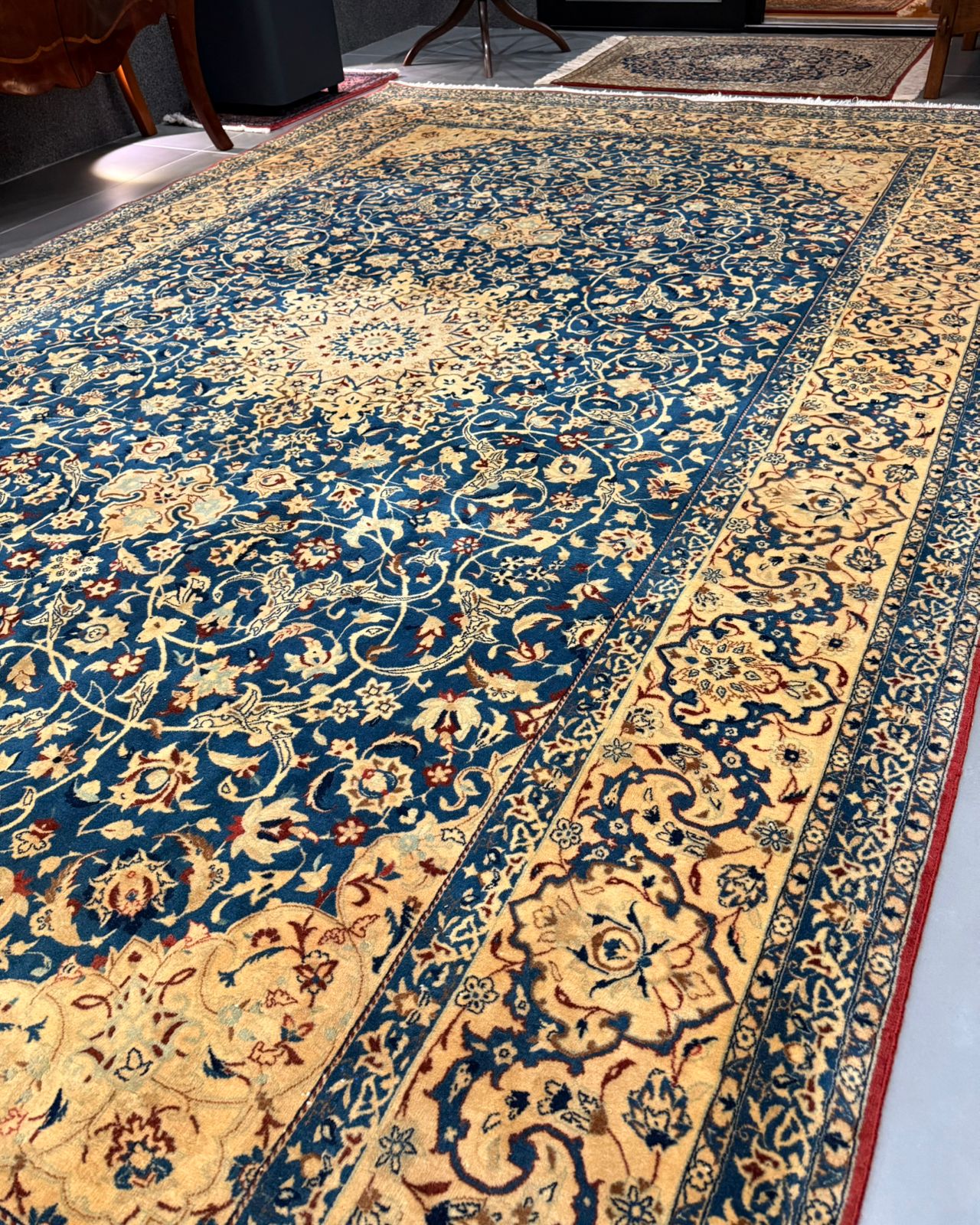 Este Nain Tudesk impressiona pelo porte imponente e pela delicadeza de seus desenhos florais. O medalhão central se destaca sobre o fundo azul-marinho, envolto por arabescos e flores em bege dourado que remetem ao equilíbrio clássico da tapeçaria persa.