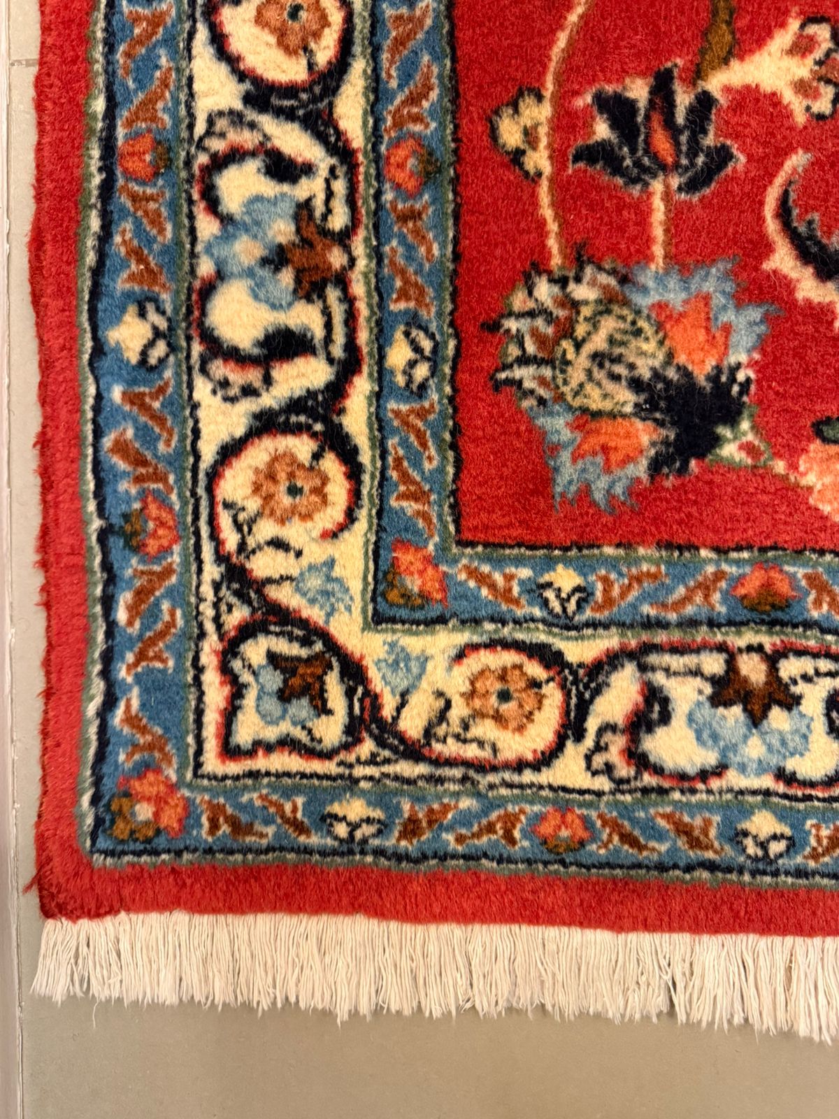 Este exemplar apresenta o clássico campo vermelho intenso, cor símbolo de vitalidade e prestígio, em contraste com as bordas em azul e marfim, que reforçam a sofisticação da peça. Seu desenho é composto por arabescos florais, folhas curvas e ramagens estilizadas, símbolos de eternidade, harmonia e prosperidade.