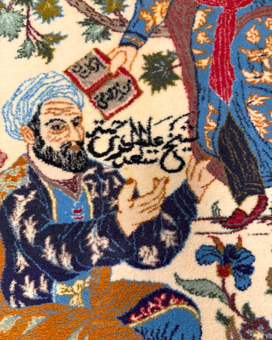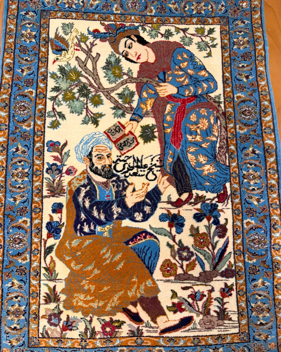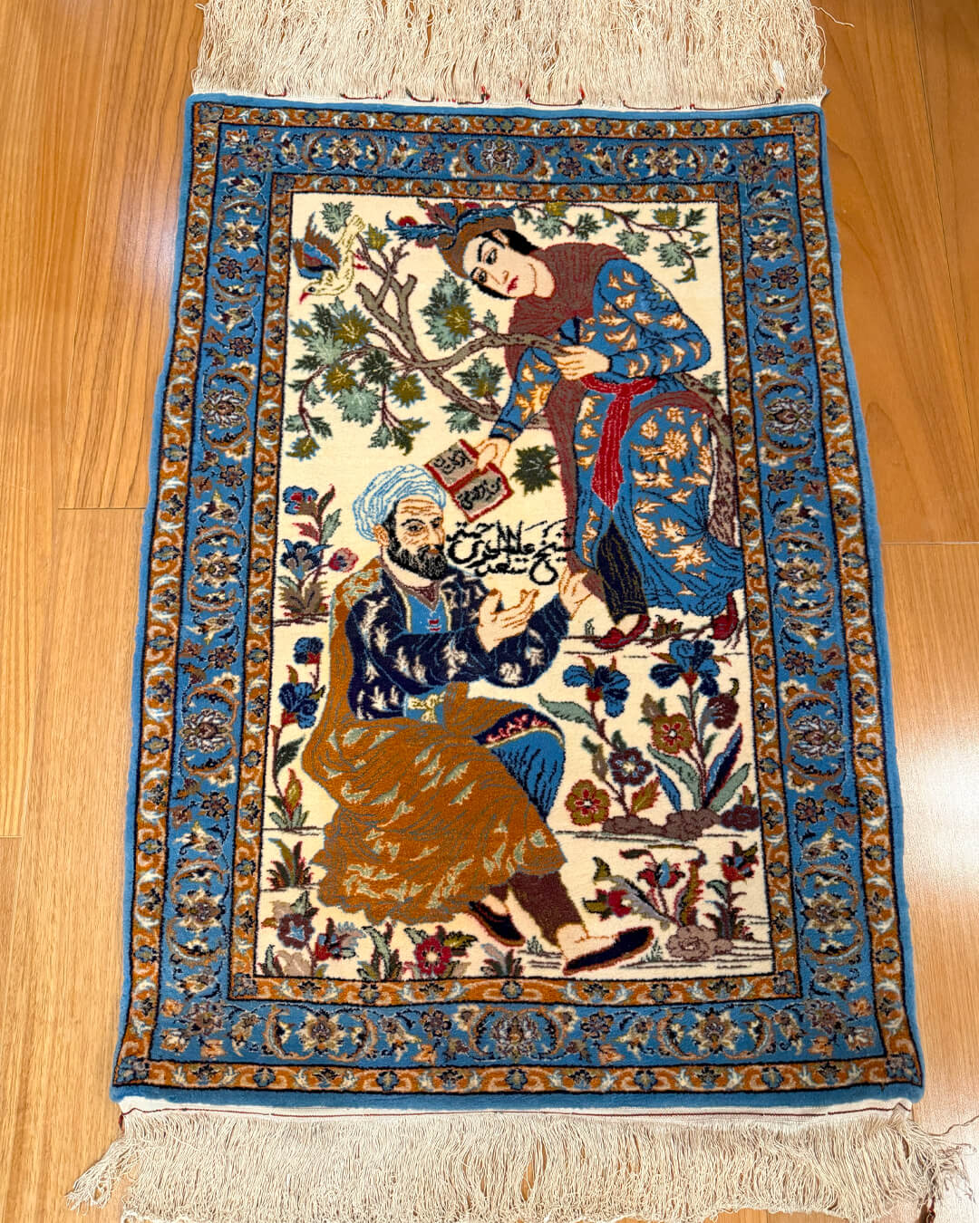 A cena é de uma riqueza singular: personagens em trajes tradicionais persas, flores e arabescos que revelam a delicadeza e sofisticação de séculos de tradição. O equilíbrio cromático, o realismo das expressões e a assinatura no campo confirmam seu valor histórico e artístico.