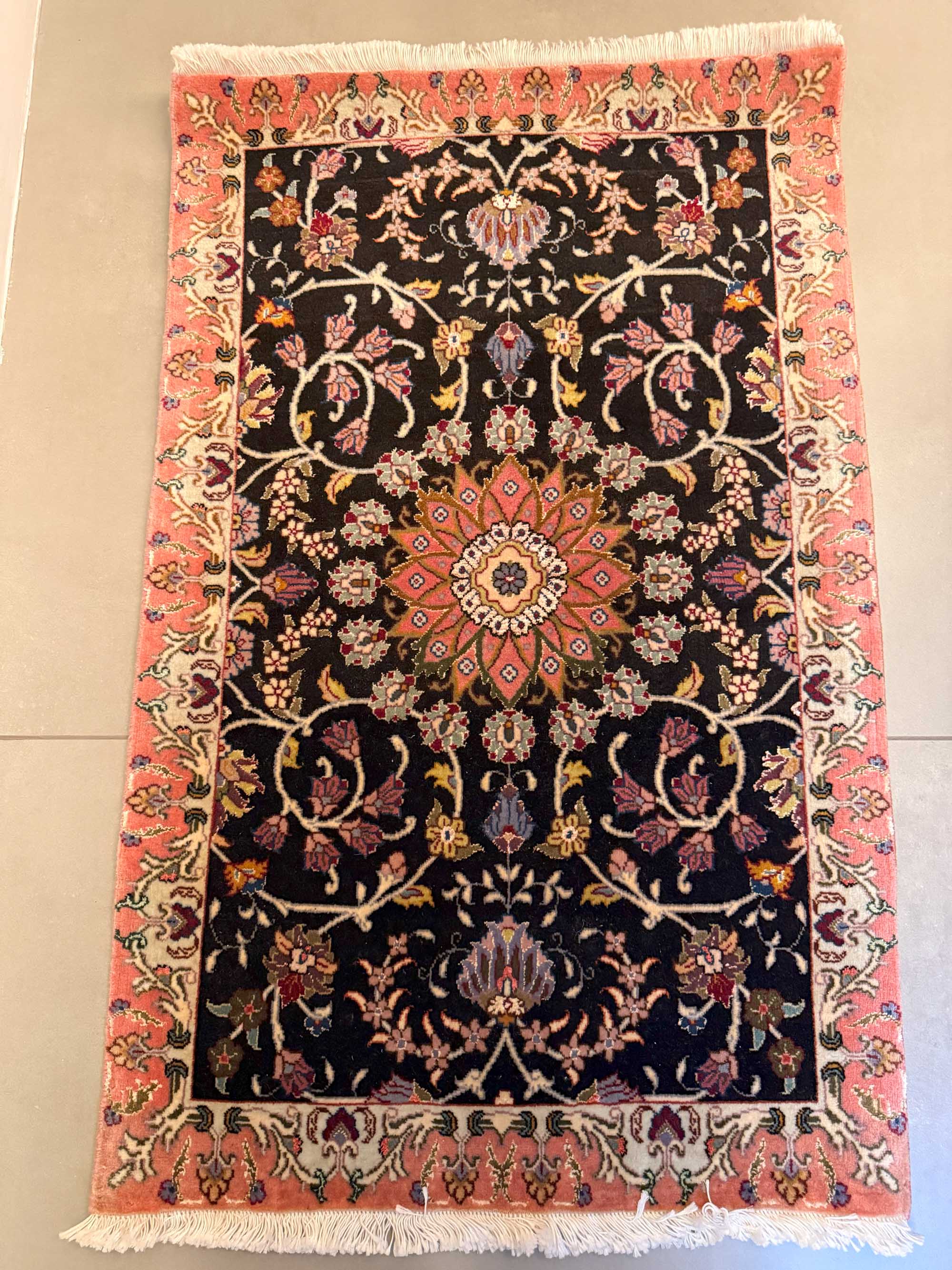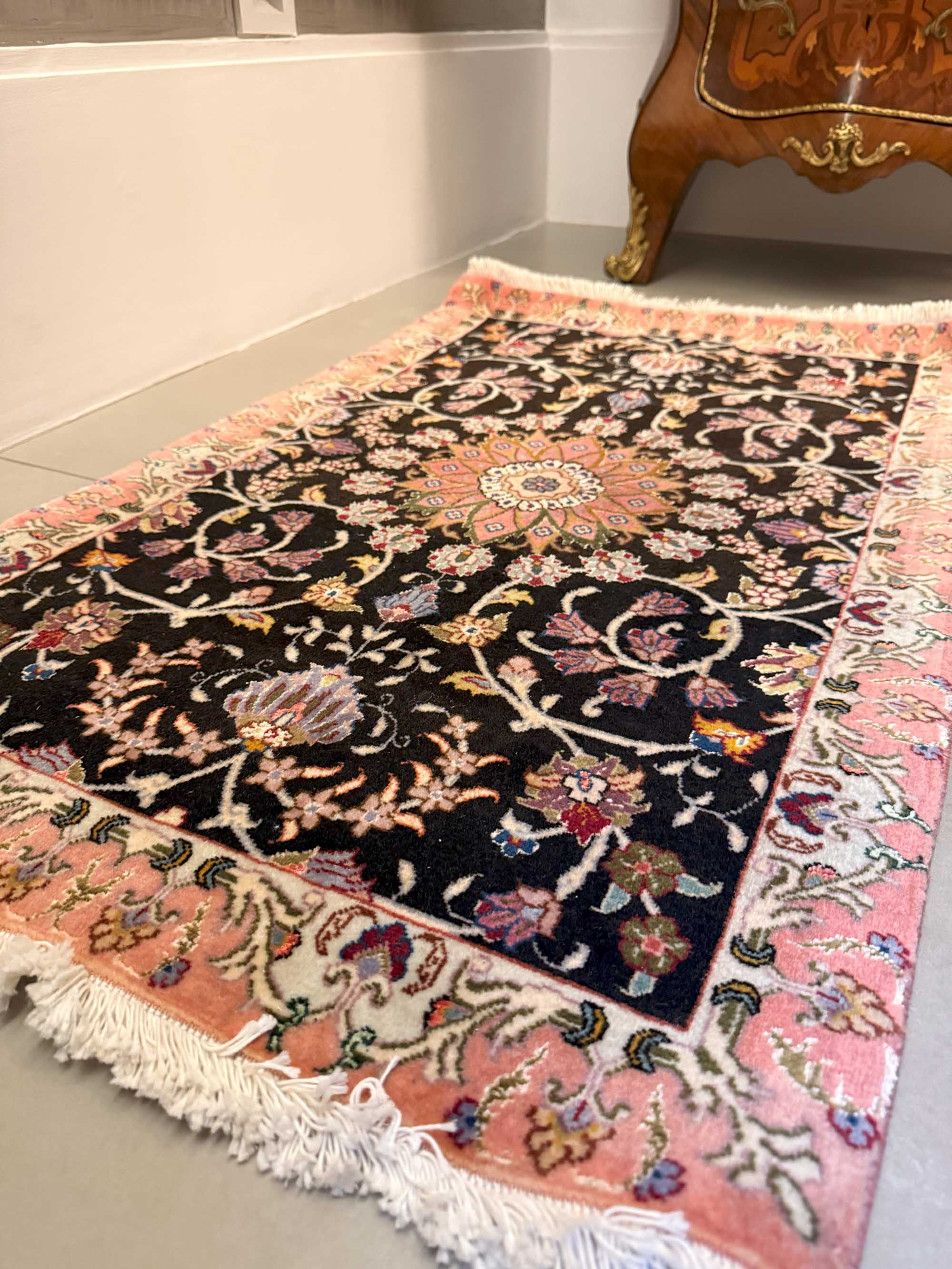 O medalhão central em tons de coral e rosa é rodeado por arabescos e flores estilizadas sobre um fundo negro profundo, criando contraste sofisticado e elegante. A borda em rosa claro, ornamentada por motivos florais delicados, acrescenta ainda mais exclusividade, já que é uma coloração pouco comum em Tabriz.