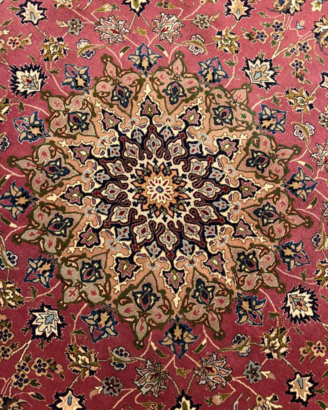 O medalhão central, ricamente trabalhado, se expande como uma mandala perfeita, cercado por arabescos florais extremamente detalhados, revelando domínio técnico, precisão de nós e profundo conhecimento estético dos mestres tecelões de Tabriz. A composição simétrica cria um efeito visual hipnotizante, equilibrando movimento, profundidade e harmonia.