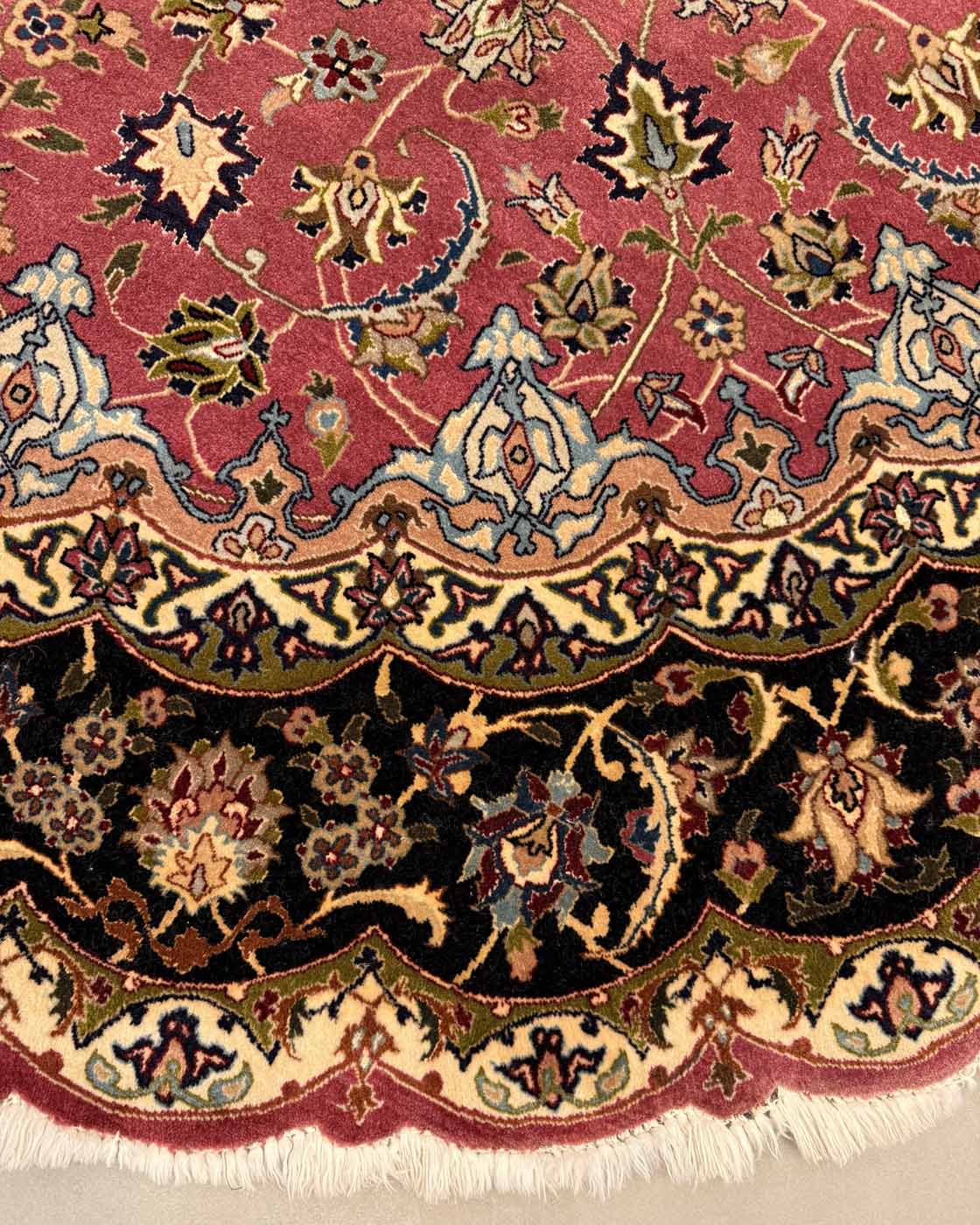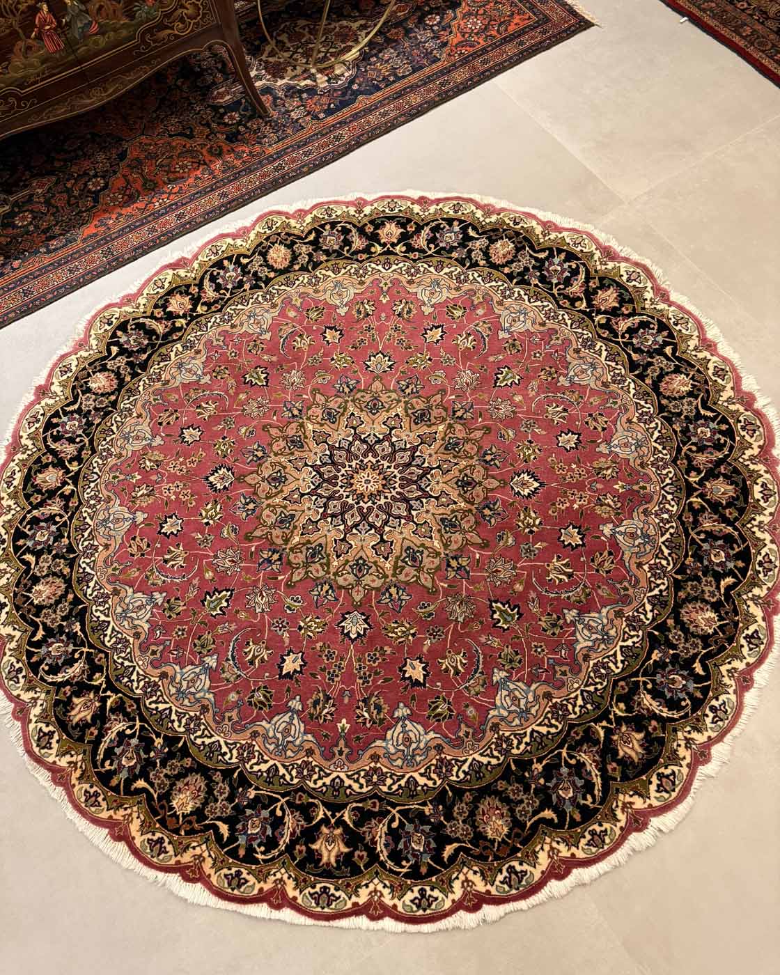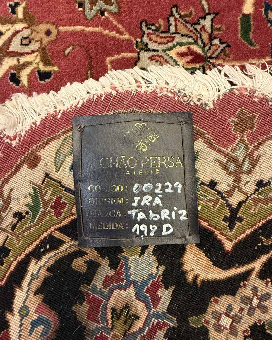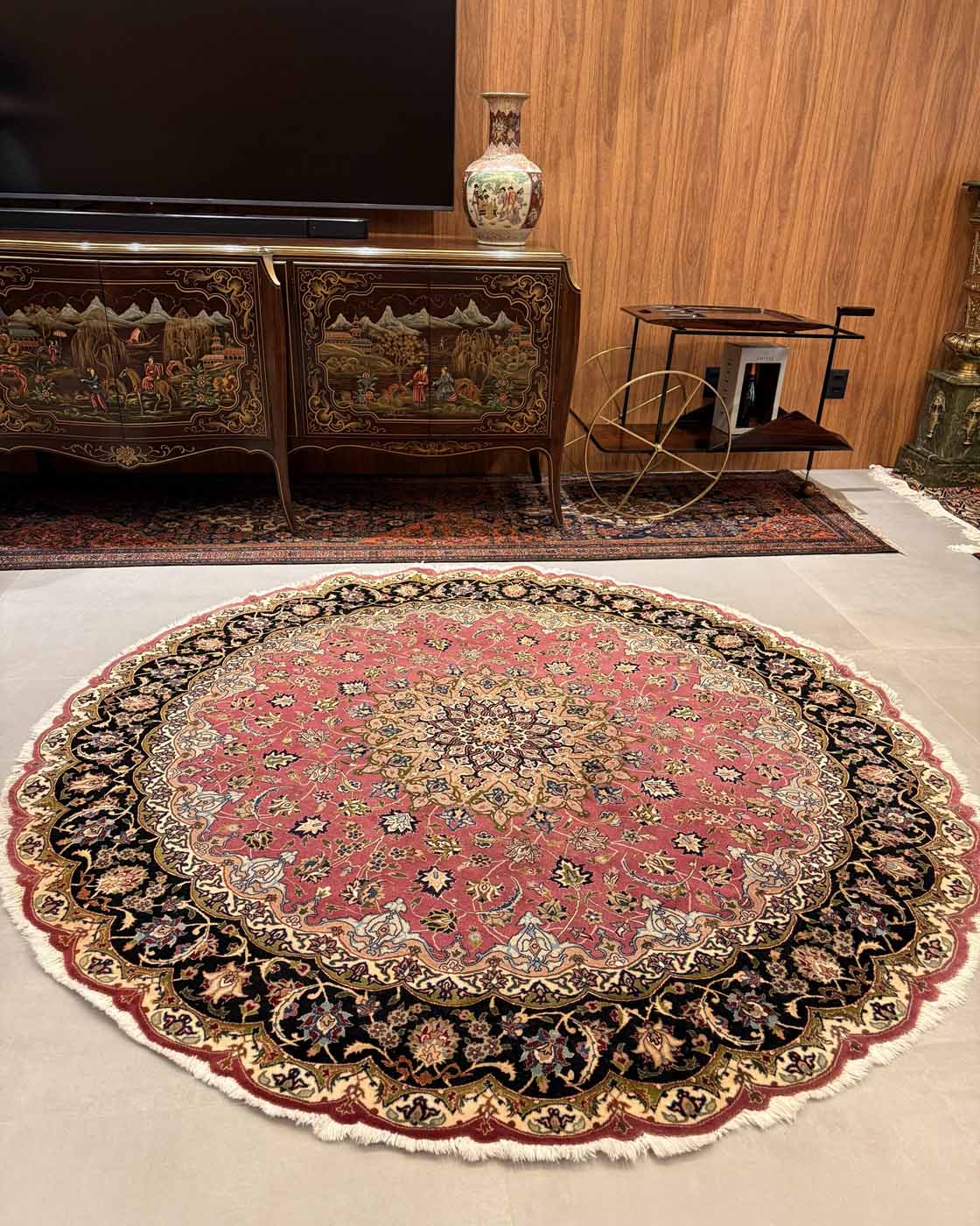 Este tapete persa Tabriz em formato redondo é uma peça de altíssima raridade, tanto pela excelência do desenho quanto, principalmente, pela medida especial de 1,92 m de diâmetro — dimensão incomum na tapeçaria persa tradicional, produzida em pouquíssimos exemplares.