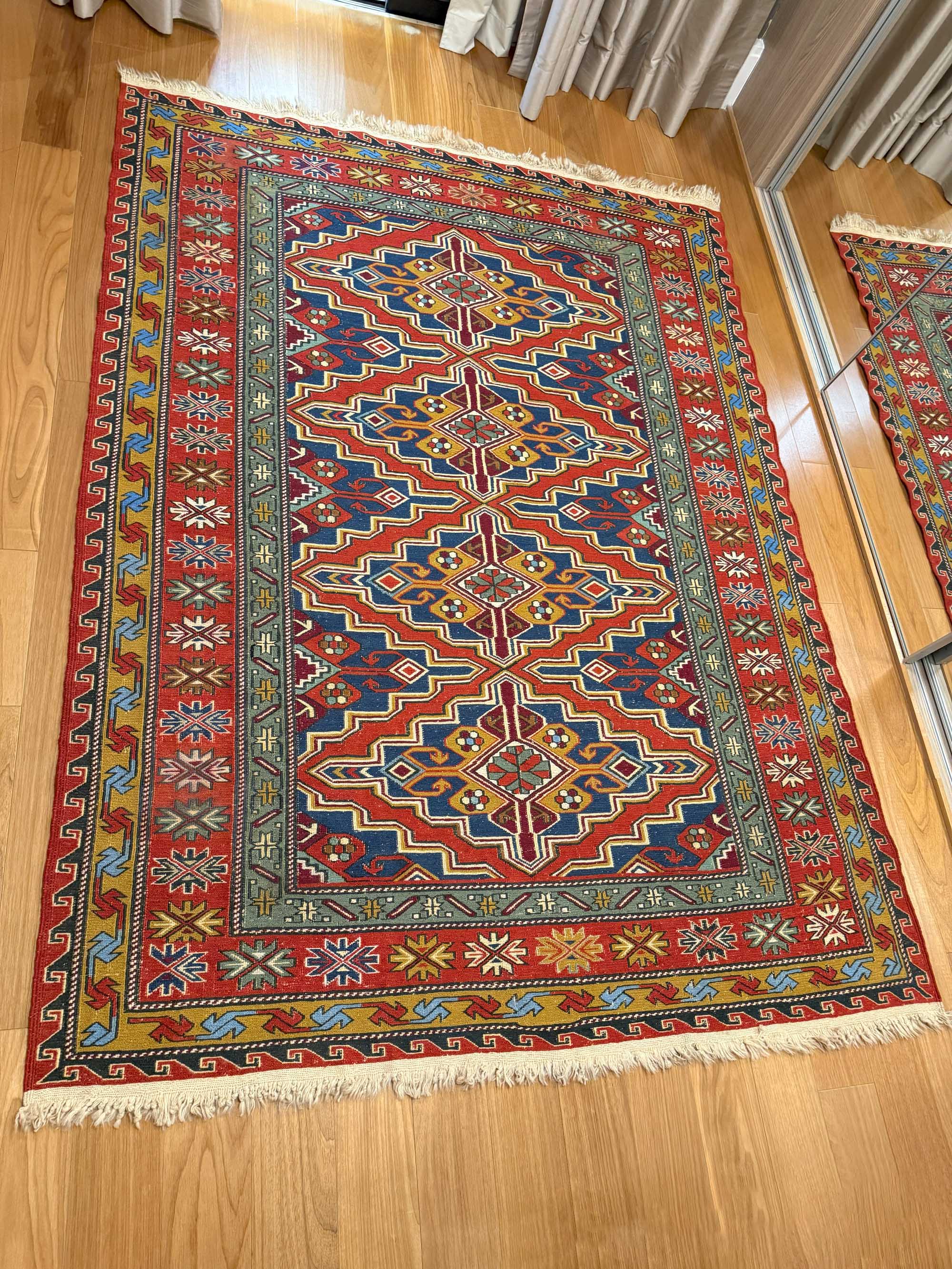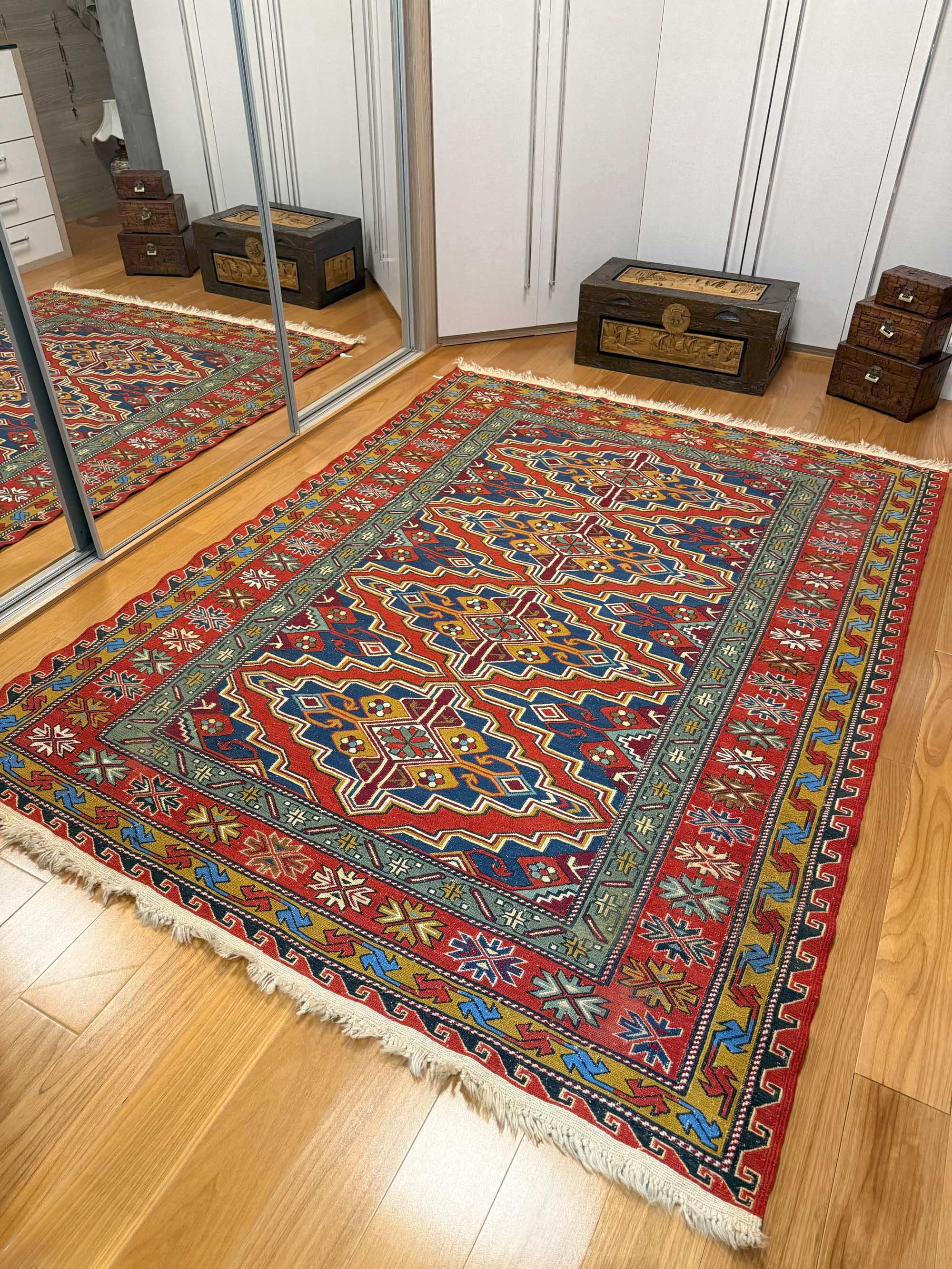 A paleta vibrante com predominância dos tons vermelho, azul, amarelo e cru confere à peça uma energia viva e acolhedora. O campo central é composto por medalhões geométricos em sequência, típicos dos desenhos tribais, rodeados por bordas ricamente decoradas com motivos florais estilizados e formas angulares que remetem a símbolos antigos da região do Cáucaso.