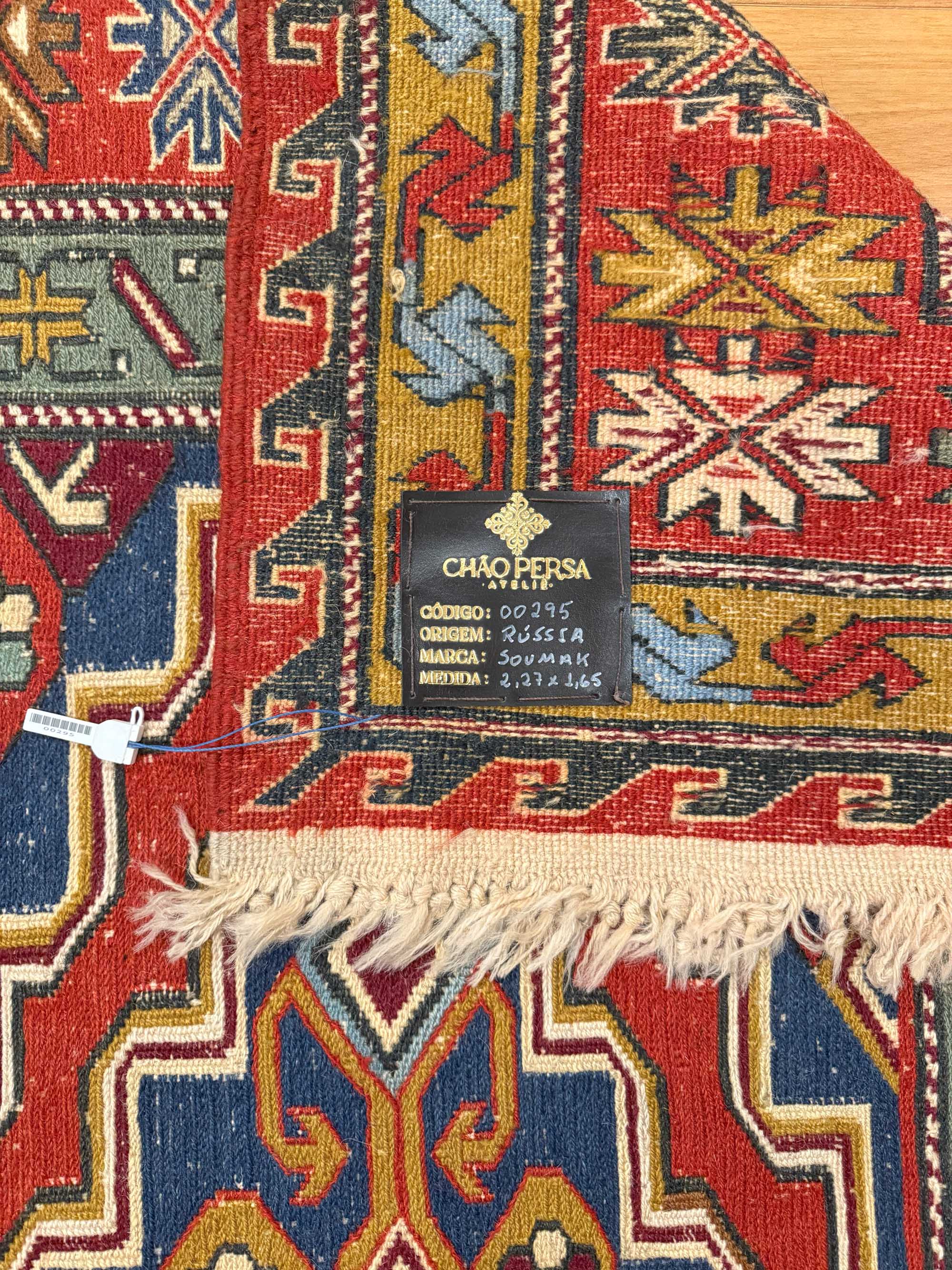 Uma verdadeira joia da tapeçaria caucasiana, este tapete Soumak feito à mão na Rússia é um clássico exemplo da técnica de tecelagem plana, conhecida por sua estrutura robusta e pelos desenhos em alto relevo que se formam com os fios soltos no verso. A ausência de nós dá origem a uma textura única e uma durabilidade admirável.