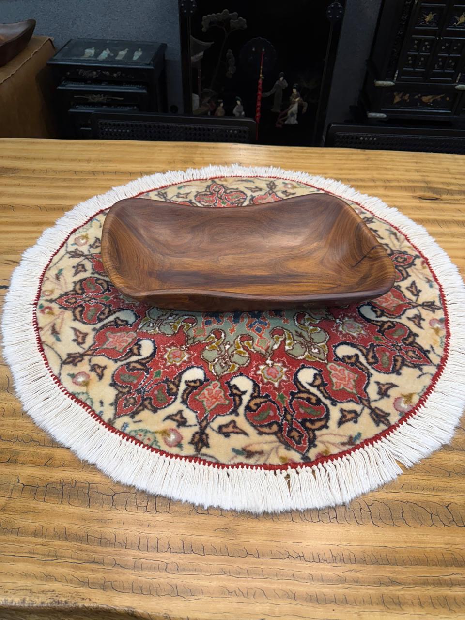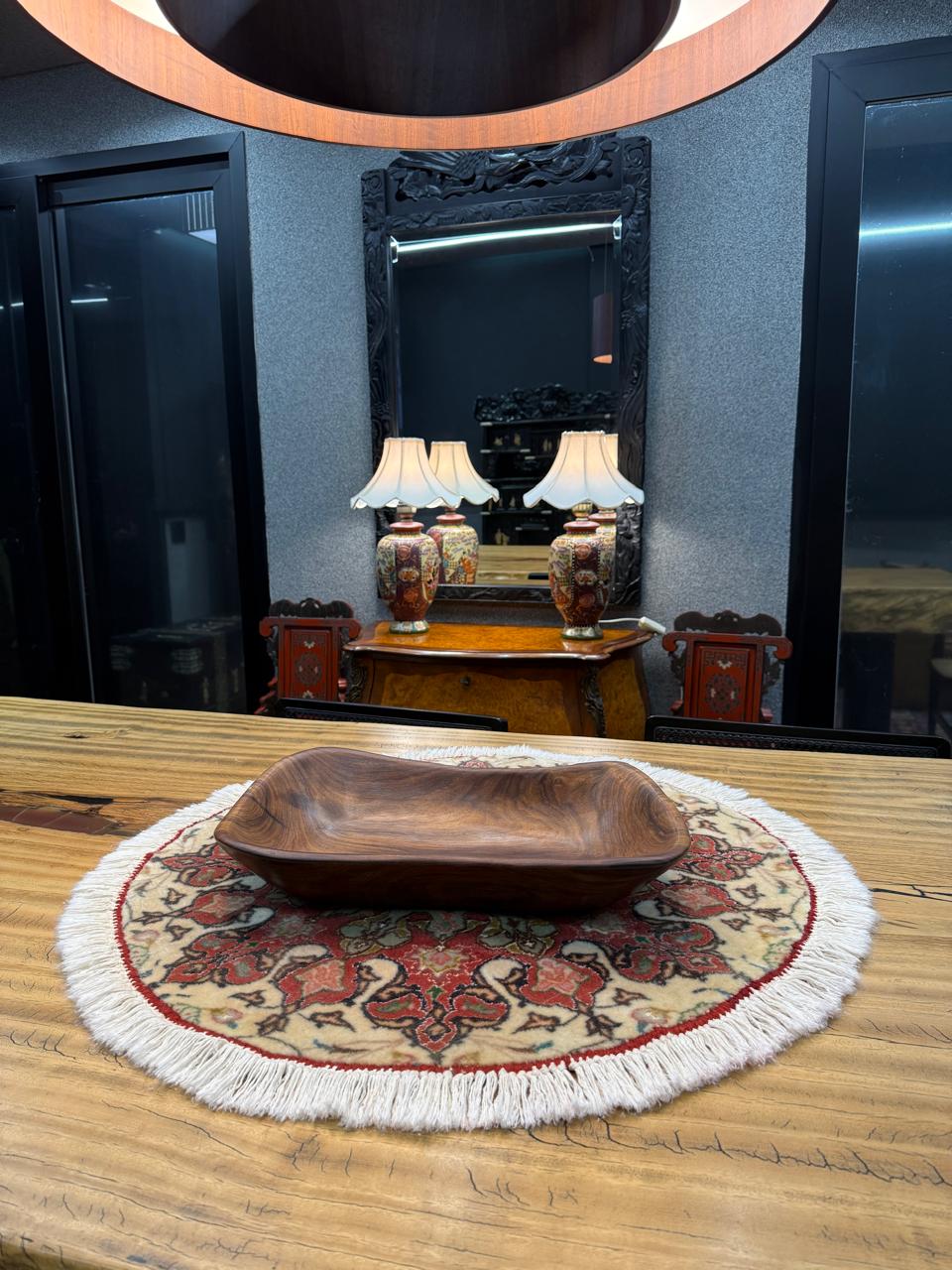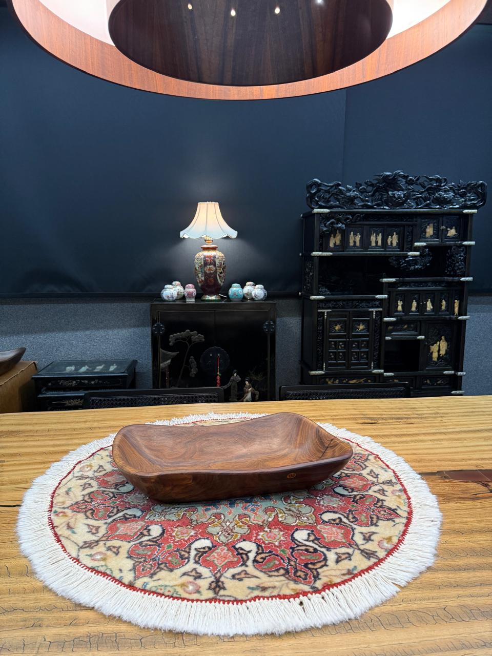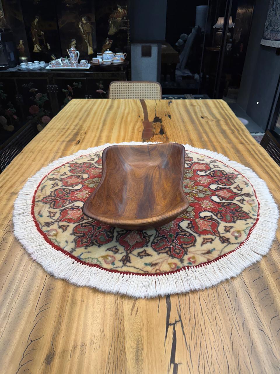 Sua estrutura é firme e bem definida, com nós extremamente finos, um indício da qualidade e do cuidado com que foi feito. A peça pode ser usada como centro de mesa, apoio decorativo sobre baús, aparadores ou mesas auxiliares, ou ainda como tapeçaria de parede, como é tradicional em casas persas.