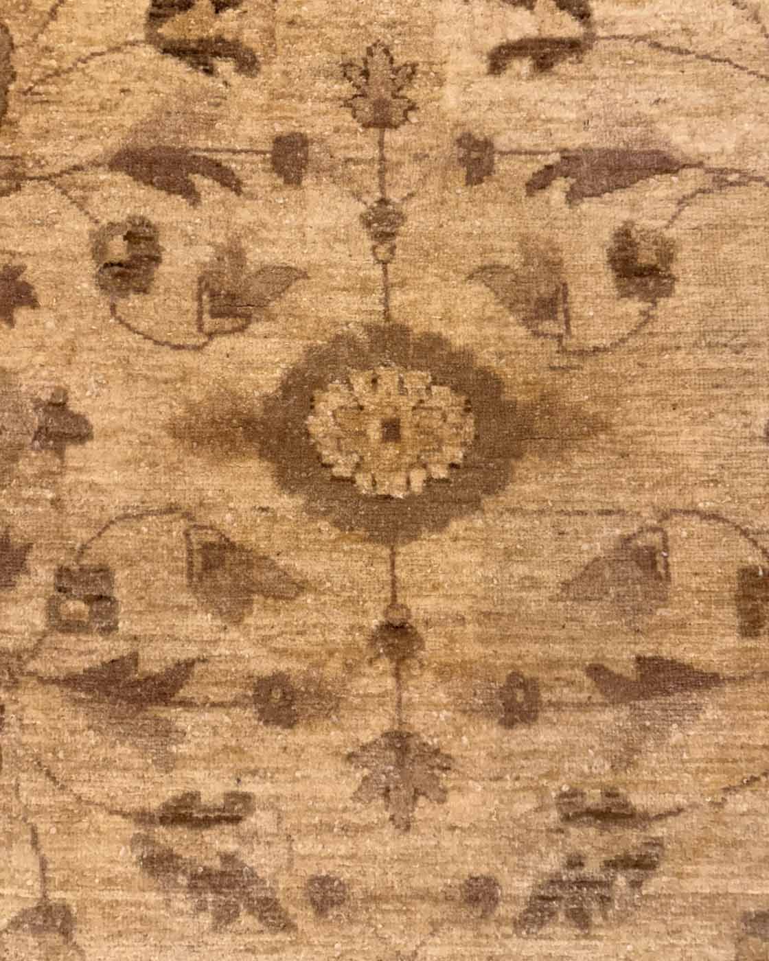 Tecelado manualmente em lã de excelente qualidade, possui trama mais espaçada e nós maiores, características típicas dos Ziegler de alto padrão. Sua paleta em tons de areia, bege, café e tabaco recebe um acabamento especial que confere aparência levemente envelhecida, criando o desejado efeito antique finish que arquitetos e designers valorizam por “aquecer” o ambiente sem pesar na composição.